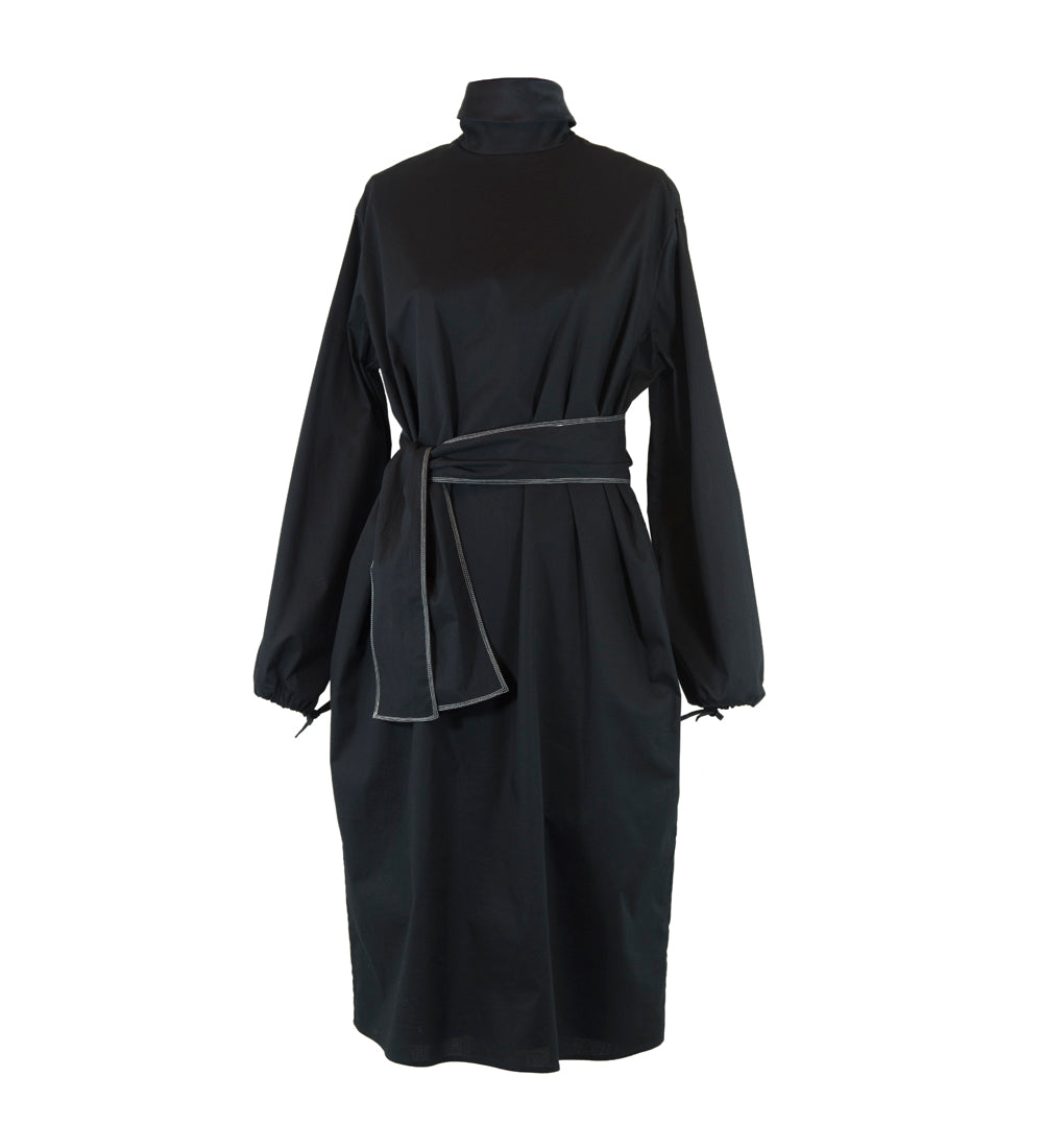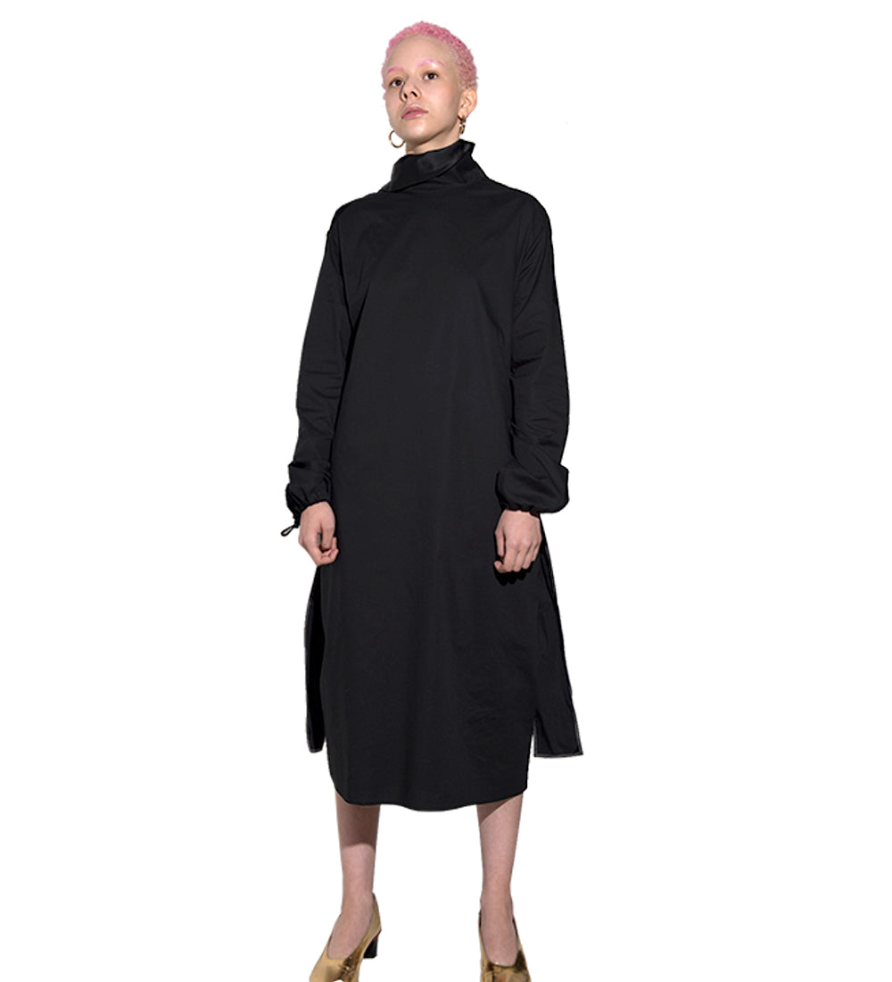 This dress is designed in a balloon shape silhouette. It features long and wide sleeves for an exaggerated look. It has a relaxed fit which cuts off nicely at the calves. To wear this, simply wear it with a turtleneck or with a pair of our straight contrast stitch straight leg trousers for a layered look.
