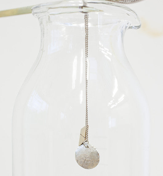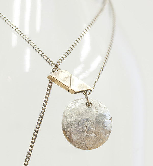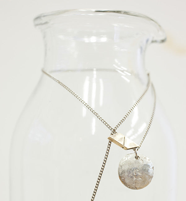 This is a handmade silver & gold charm which comes with a silver chain and a gold plating finish. The silver charm features a textural rustic background which captures the surface of the moon. A delicate and simple piece perfect for a special occasion.