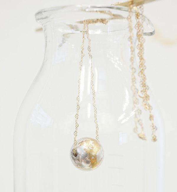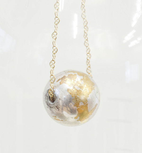 This is a handmade piece which features a beautiful lace chain. The charm has a mixture of gold and silver rustic texture on its surface. A perfect piece to wear on a special night out.