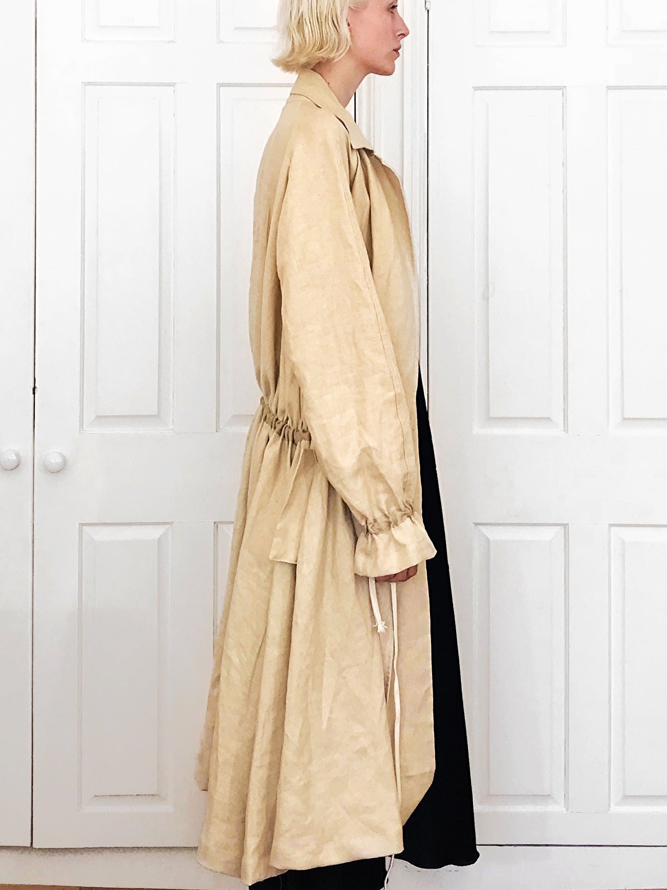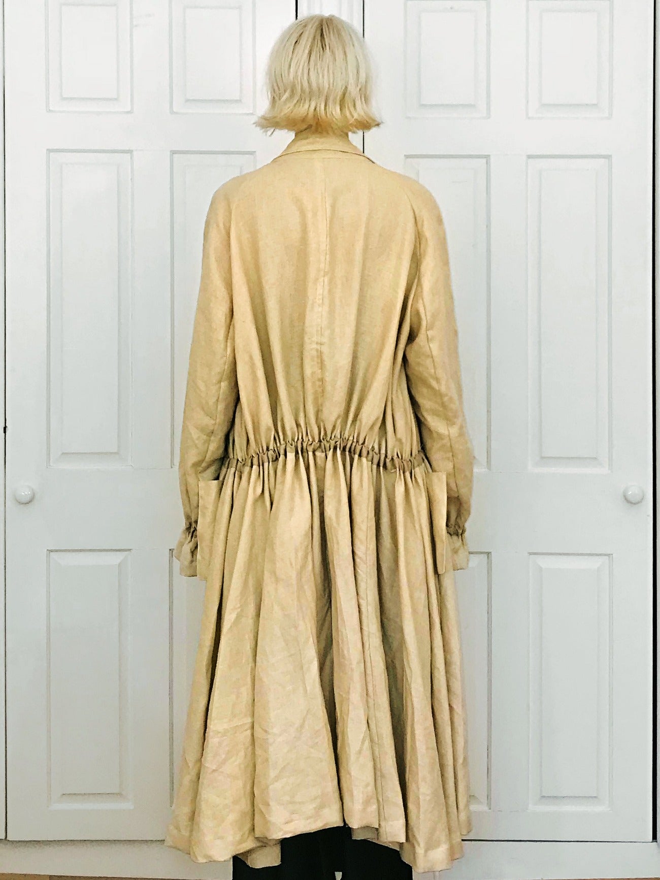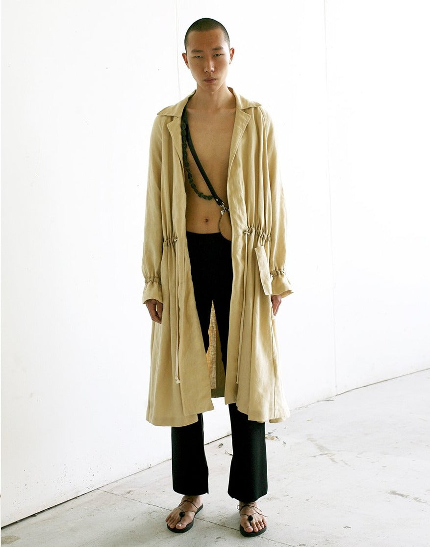 -A long drapery beautiful trench coat made of the natural linen fabric.