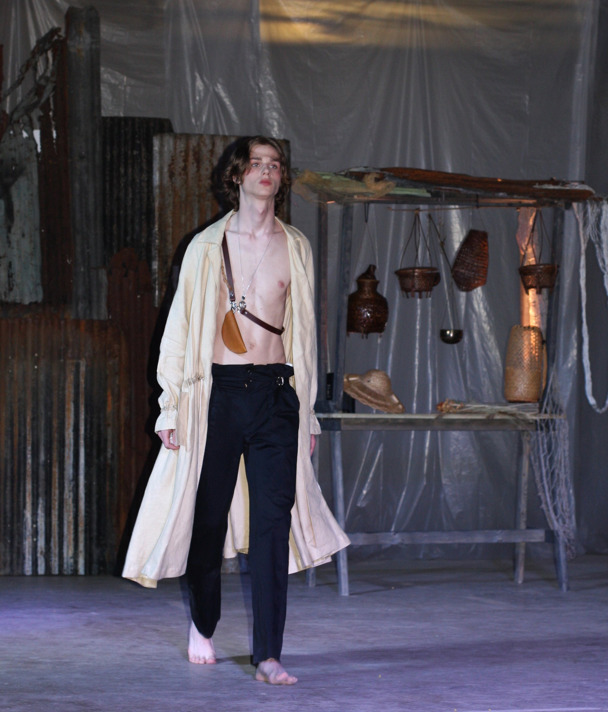LOOK 2( Linen Trench Coat with Half moon bag & Slit trousers)