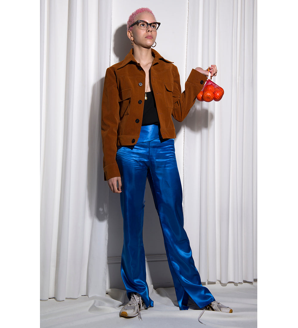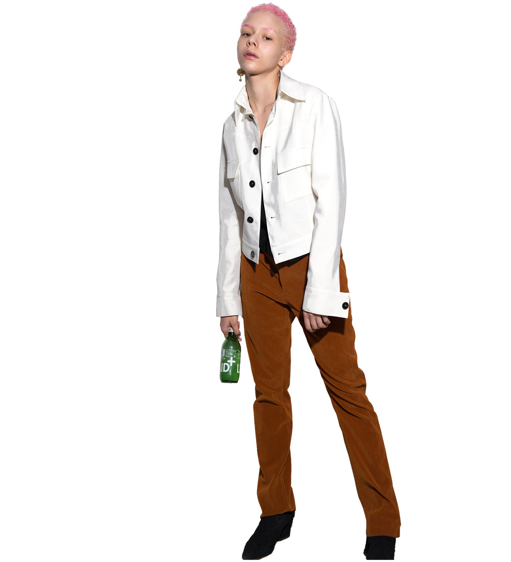 This jacket is designed in an A-line silhouette which crops nicely around the hip. It features two large patch pockets on the chest and a flat collar. This jacket also comes in the colour white for a statement look.