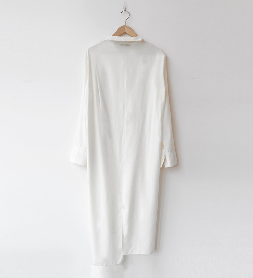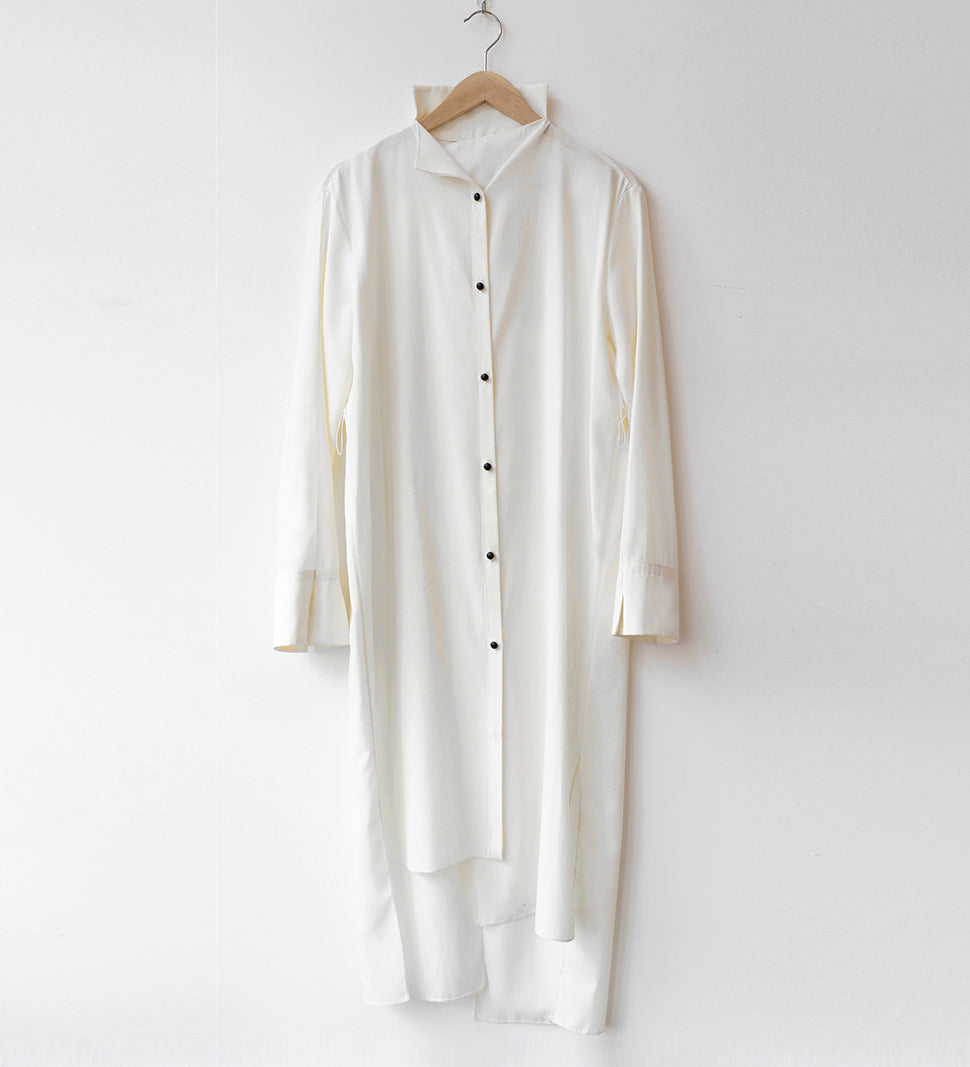 This long shirt is designed for an airy, relaxed silhouette with an asymmetric length. It features a collarless front neckline, back stand collar with plackets and a vent at the back.