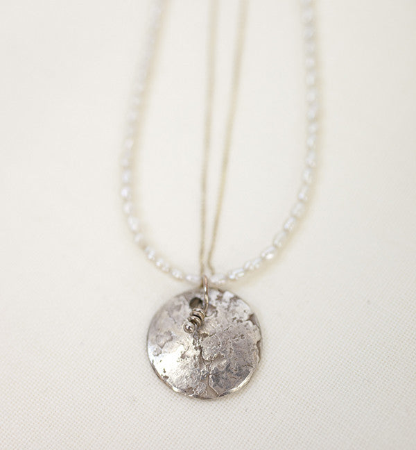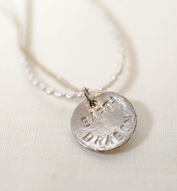 Handmade silver charm with pearl beaded chain. It features the word 'Earth Dragon'' engraved on one side.