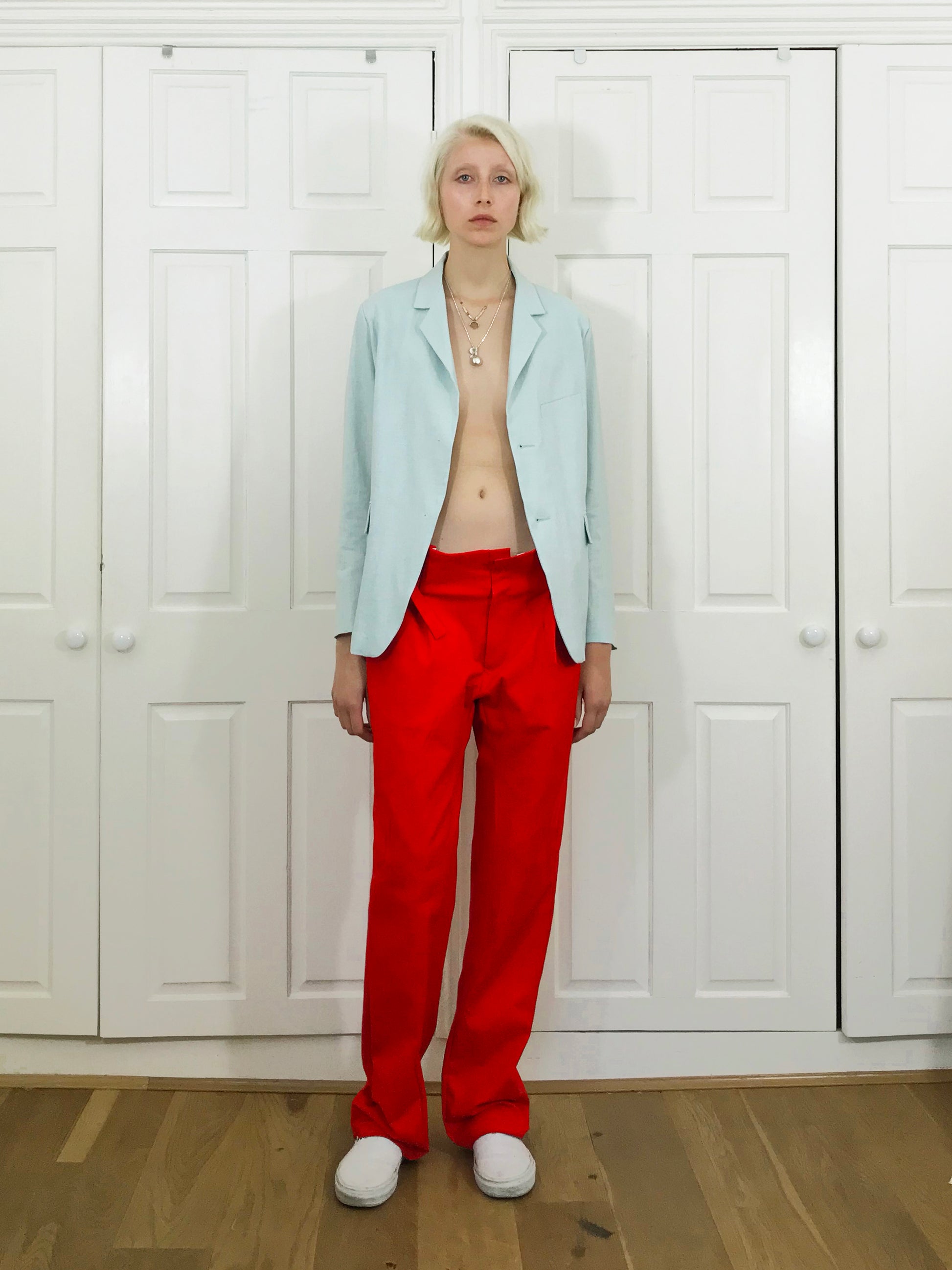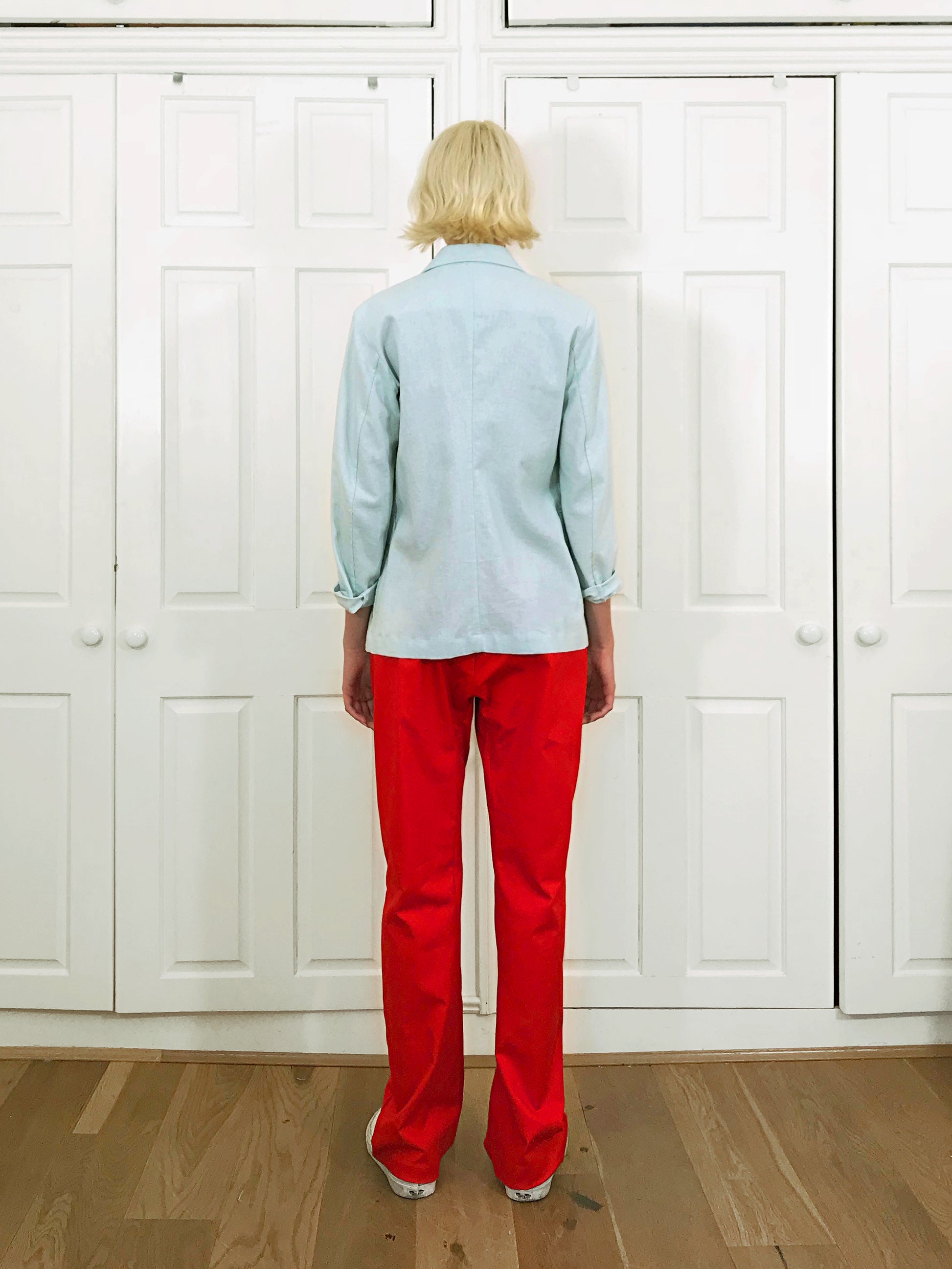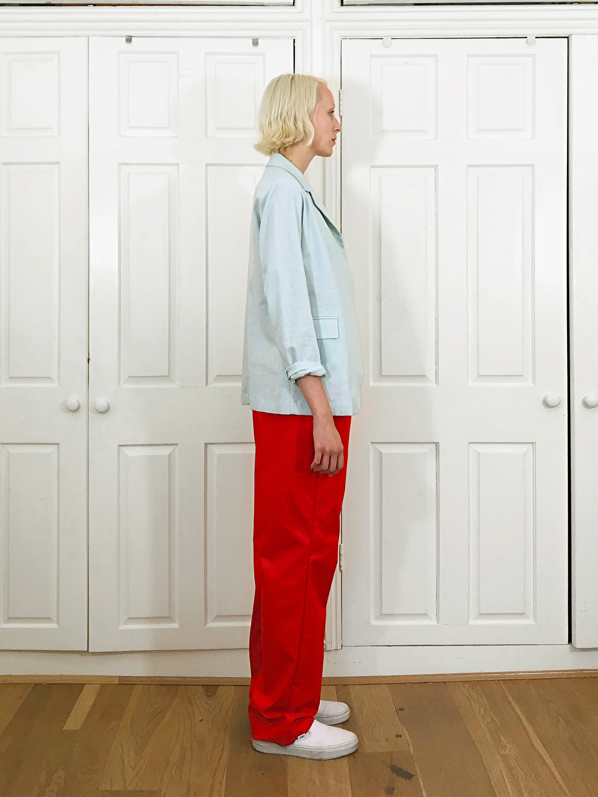 This is our baby blue cotton jacket made from 100% cotton. To wear/style this piece, simply roll the sleeves up for a casual look or button the jacket all the way up for something a little more formal.