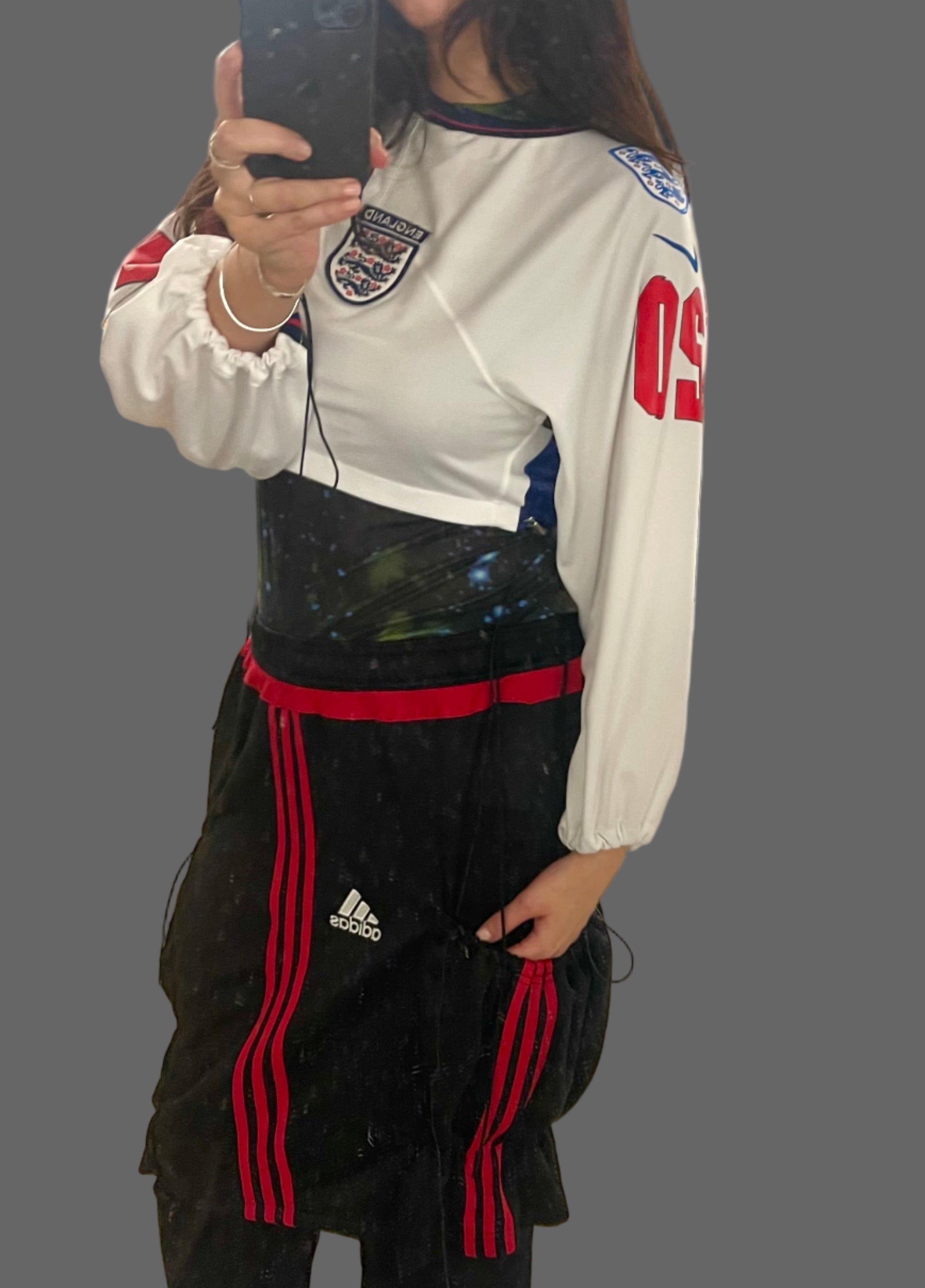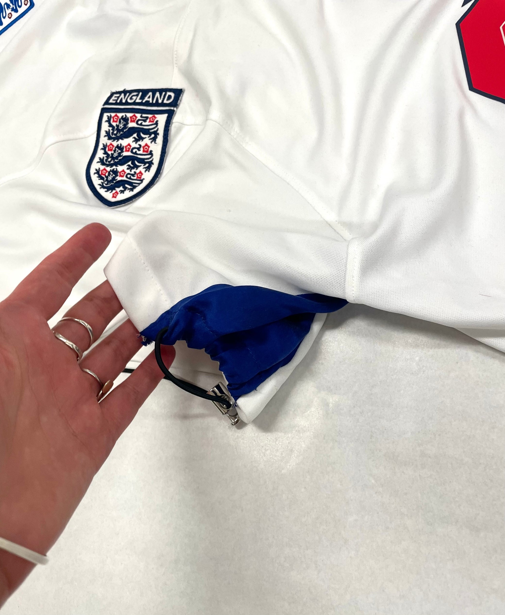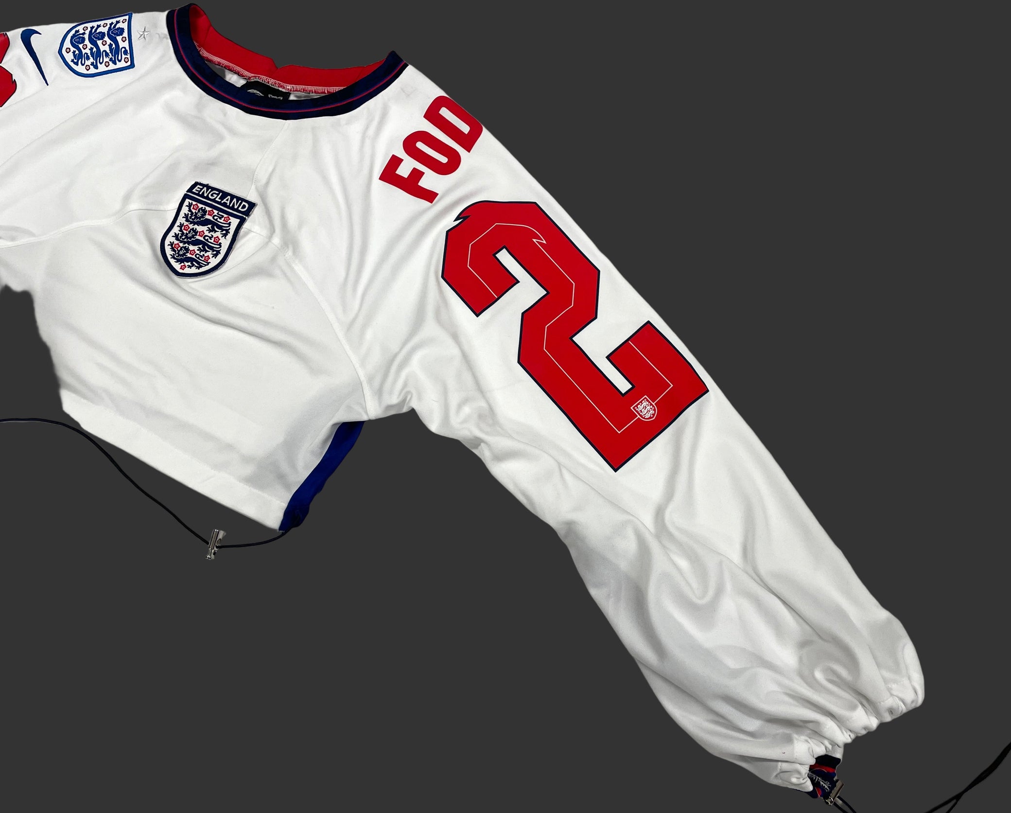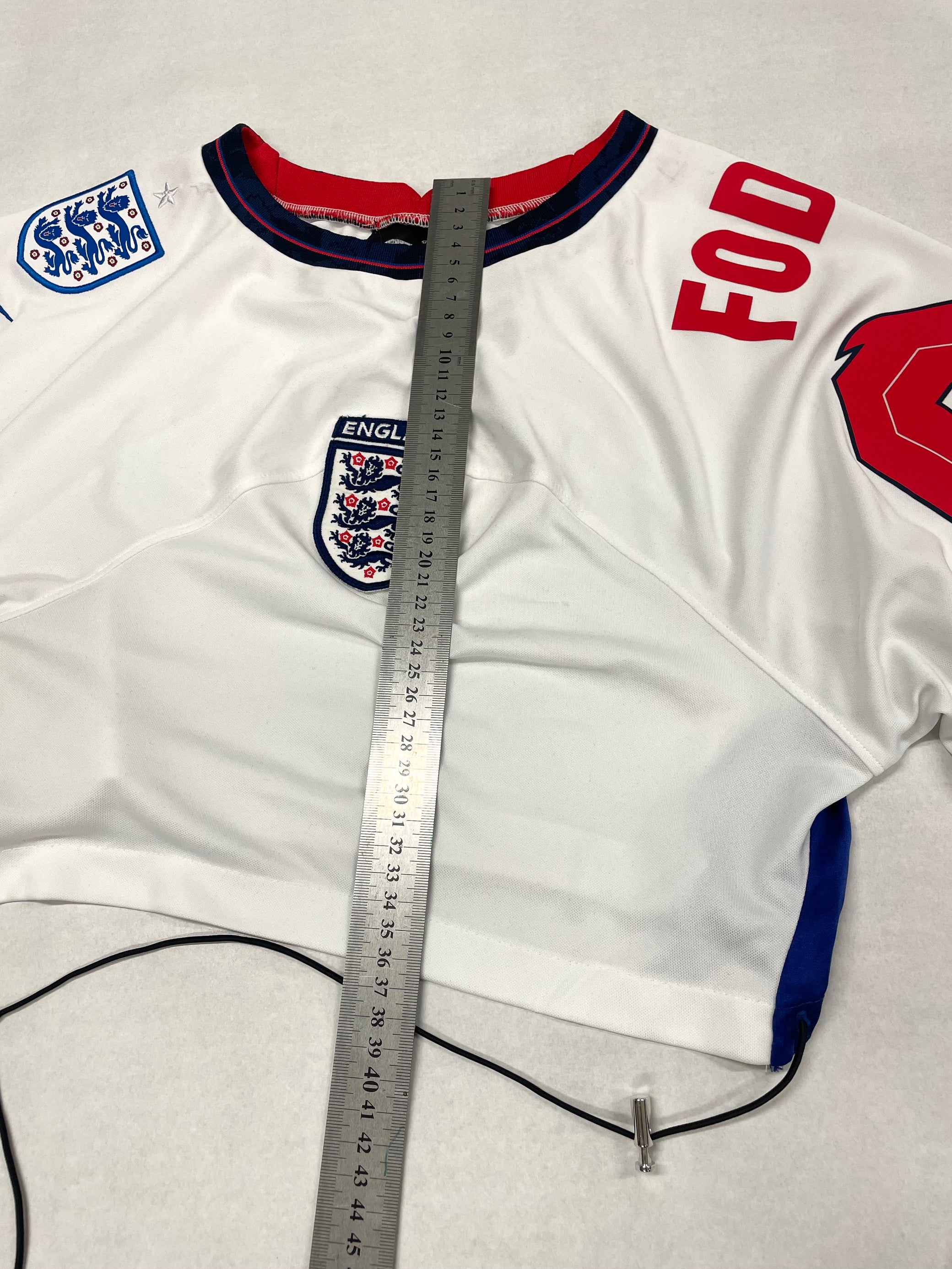 This designer piece, the Nike England Foden jersey, features extra England flag details on the chest and is perfect for women wearing sizes S-M. With a top length of 36cm and sleeve length of 70cm, it makes a tasteful statement while also promoting sustainability.