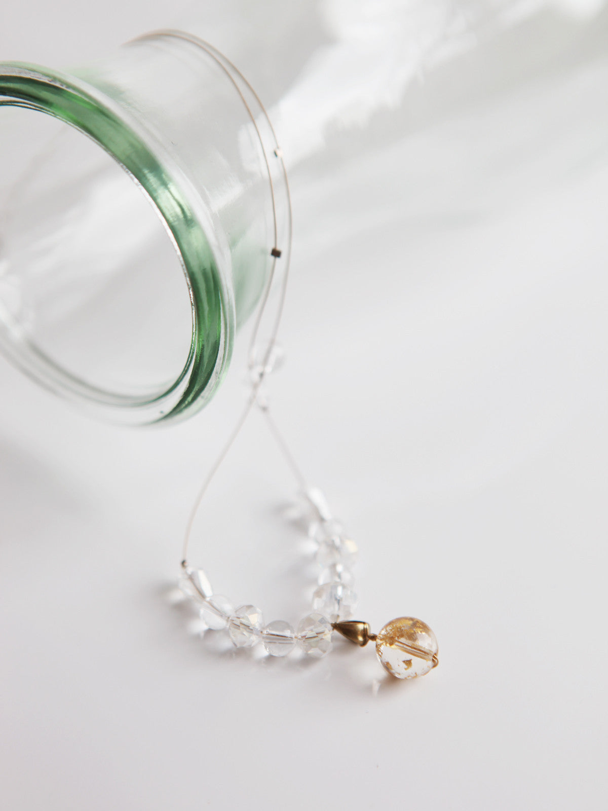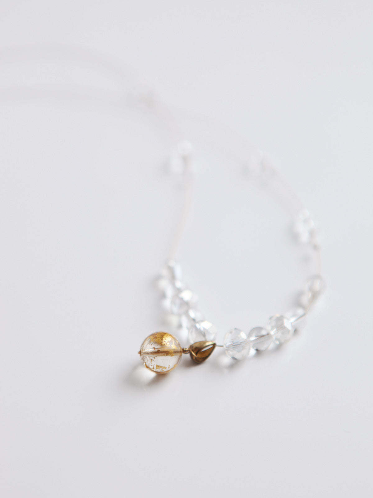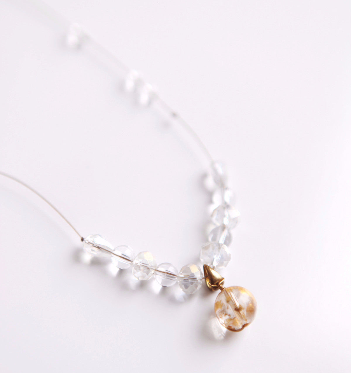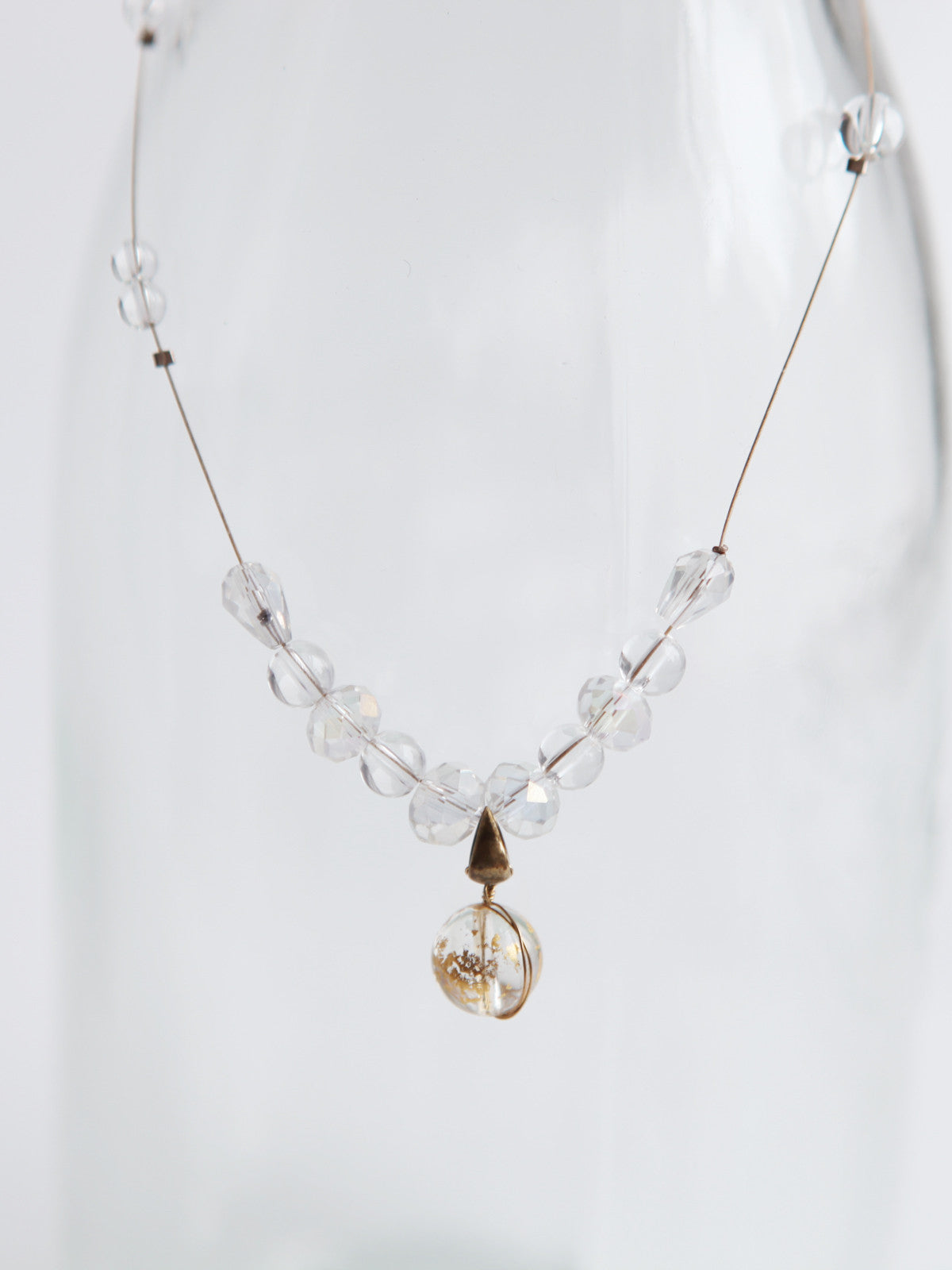 This beautiful and elegant piece of jewellery features a gold leaf on crystal glass ball. It also has a number of plain glass ball detailing alongside the chain. This necklace is perfect as a gift for your loved one.