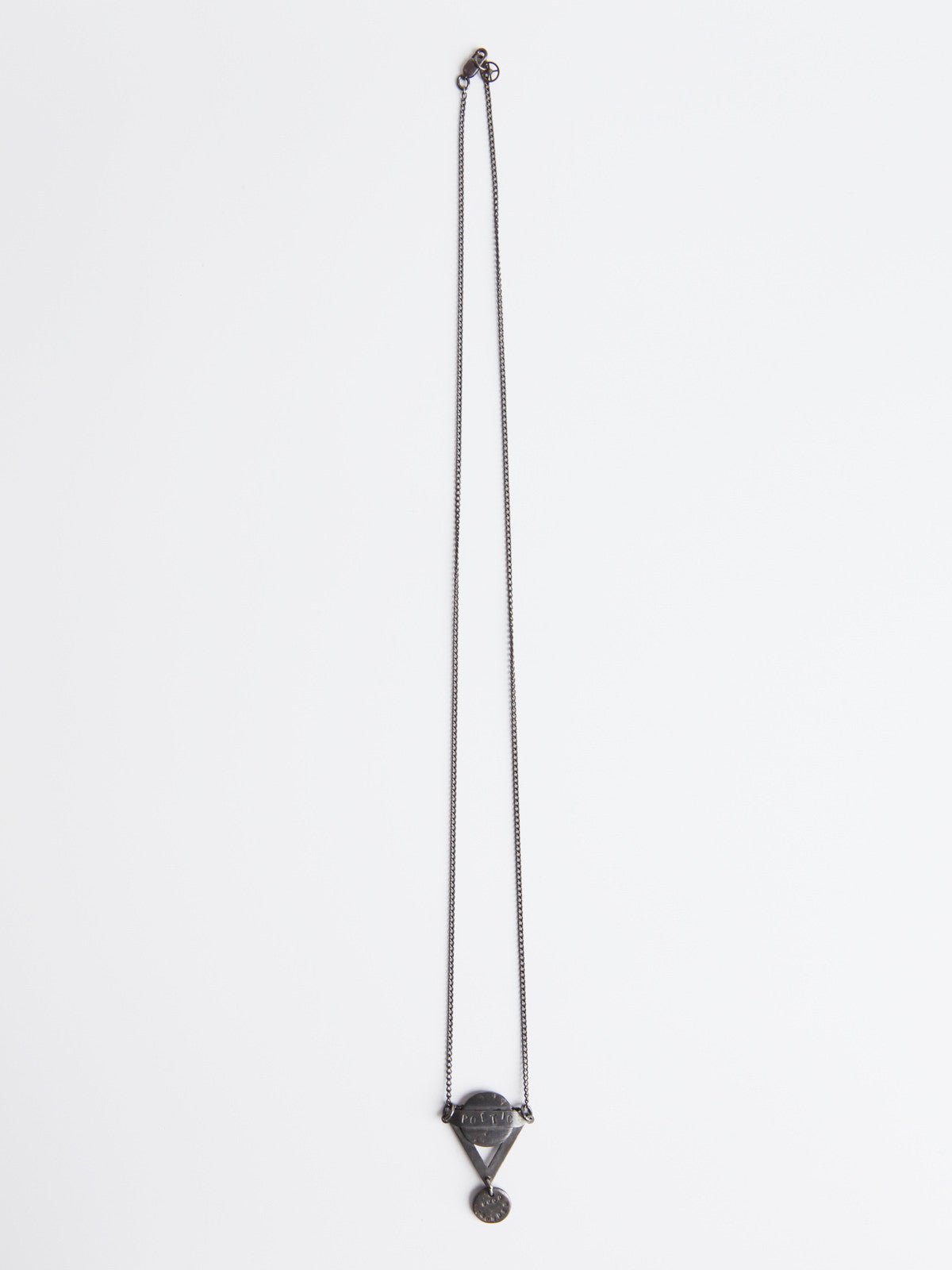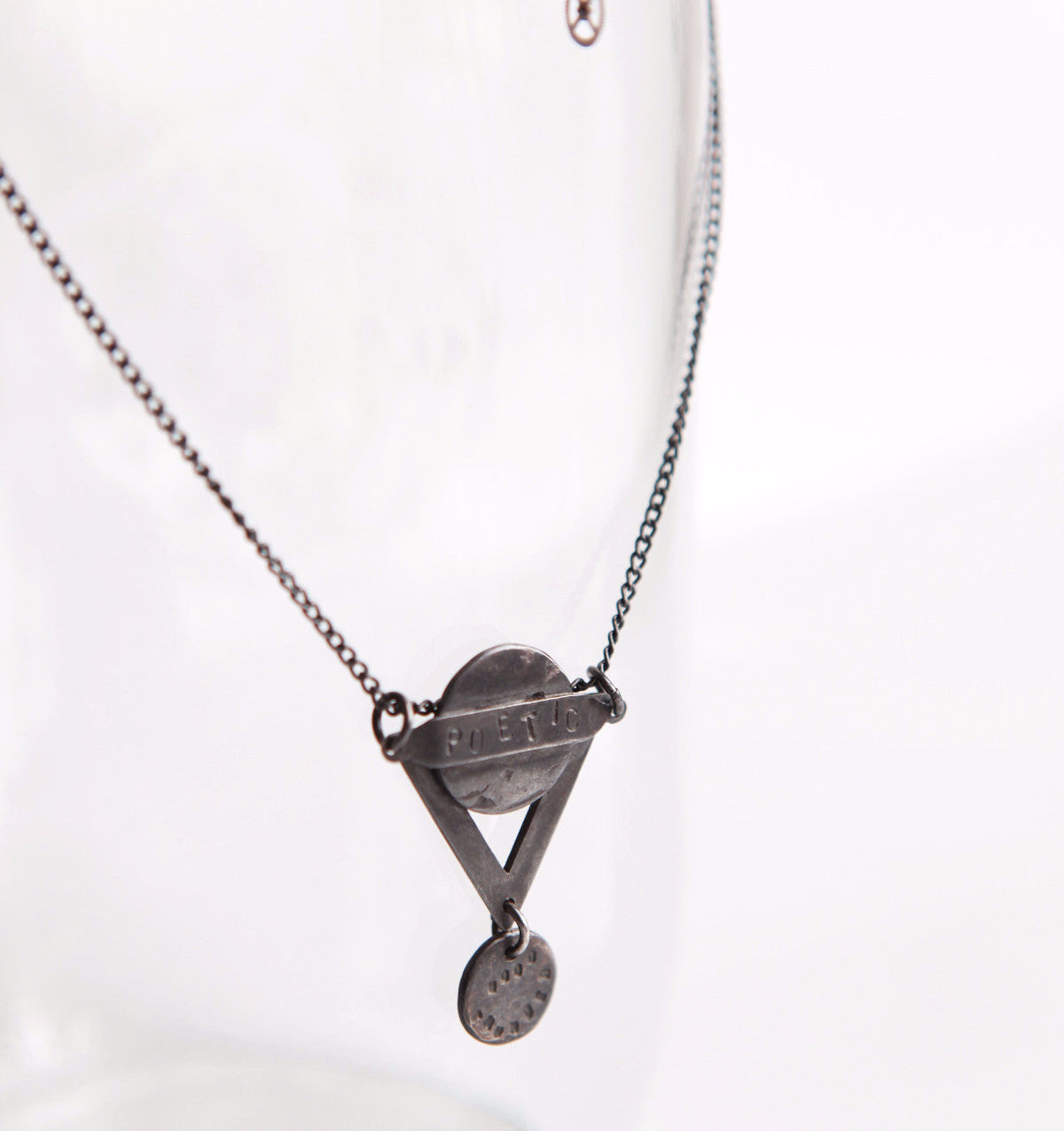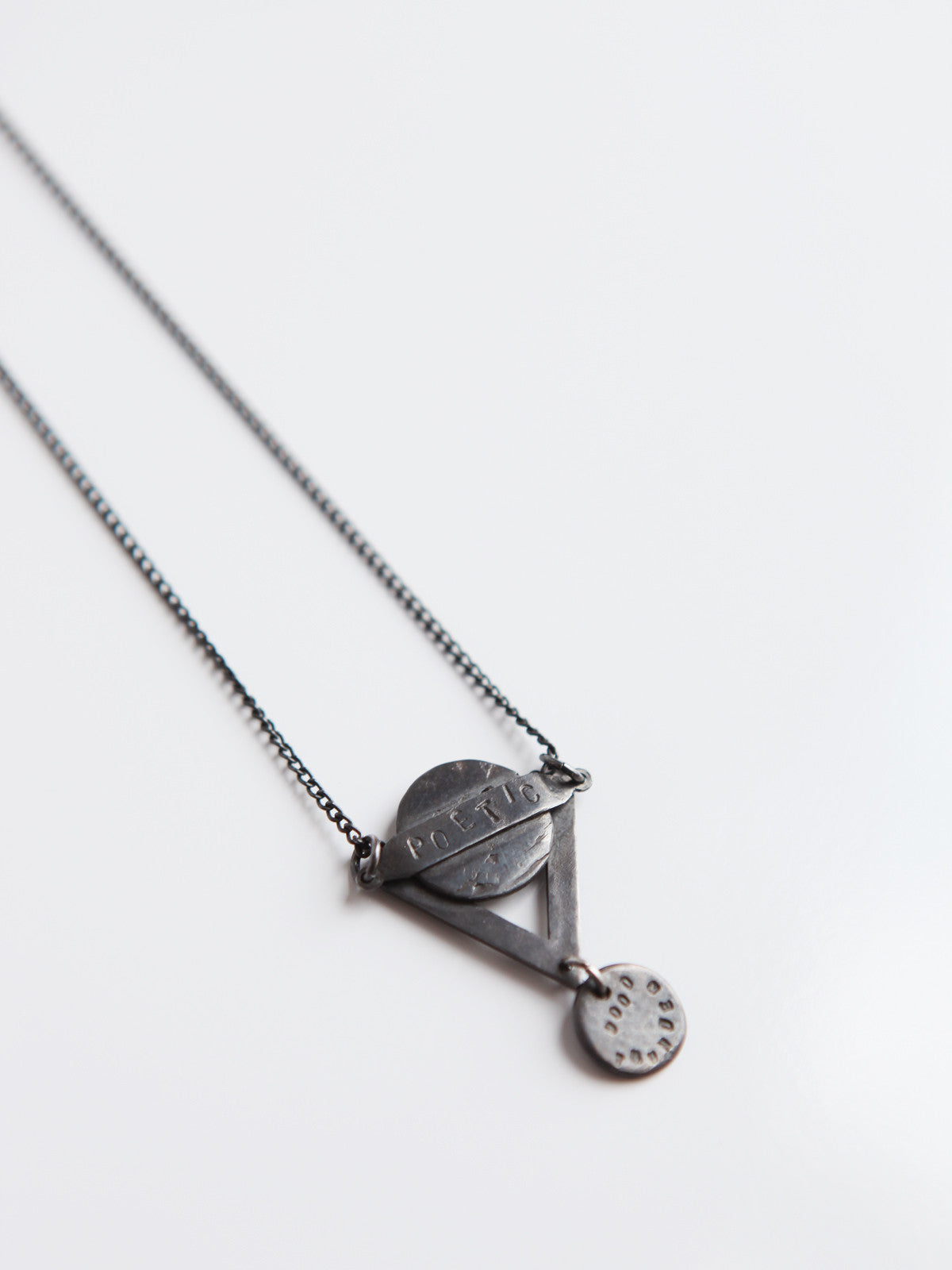 This handmade oxidised silver charm with oxidised silver chain features a unique design perfect as a statement piece. It has the word ''poetic'' engraved on the top and ''wood thunder'' engraved on the bottom.