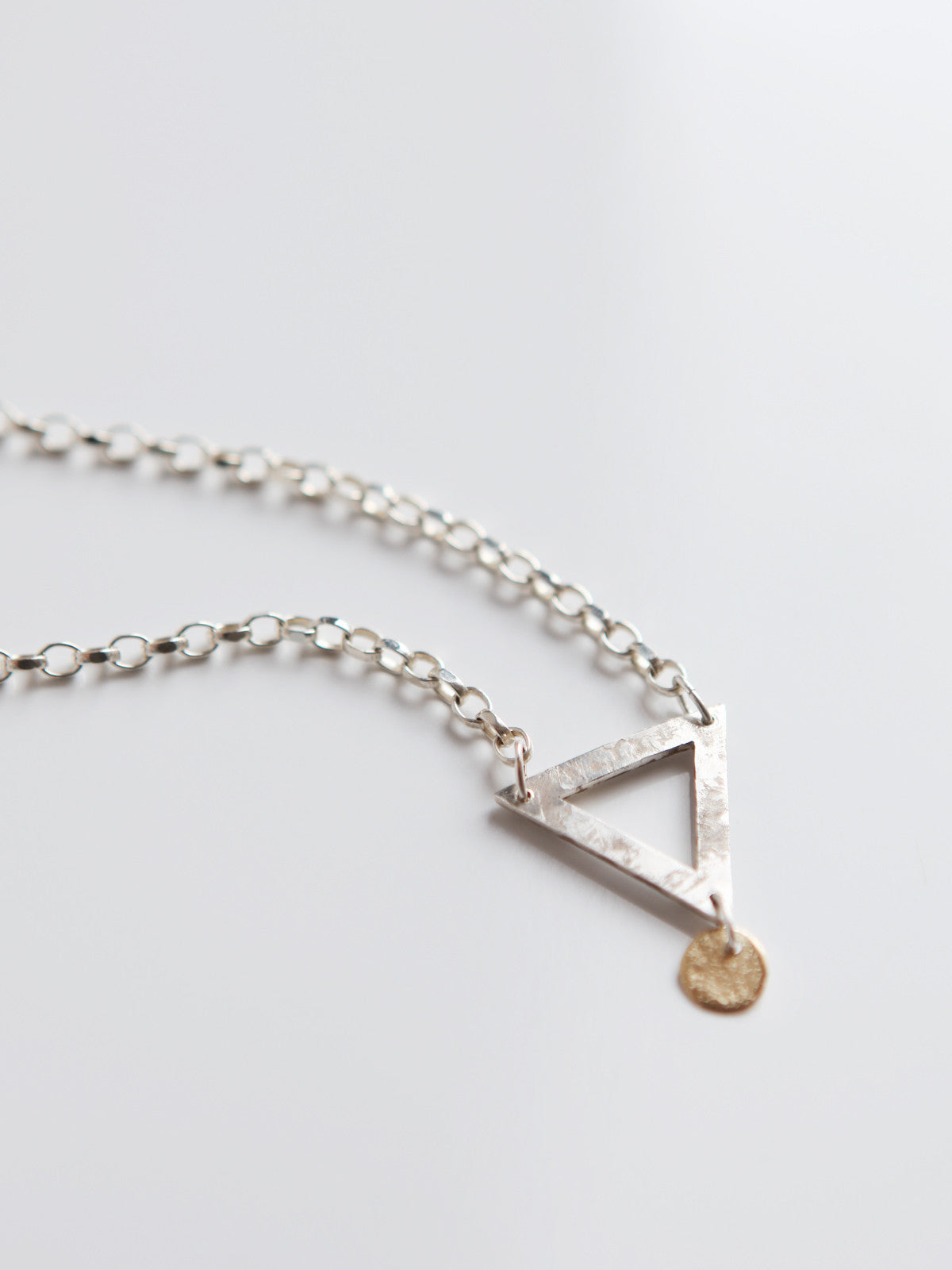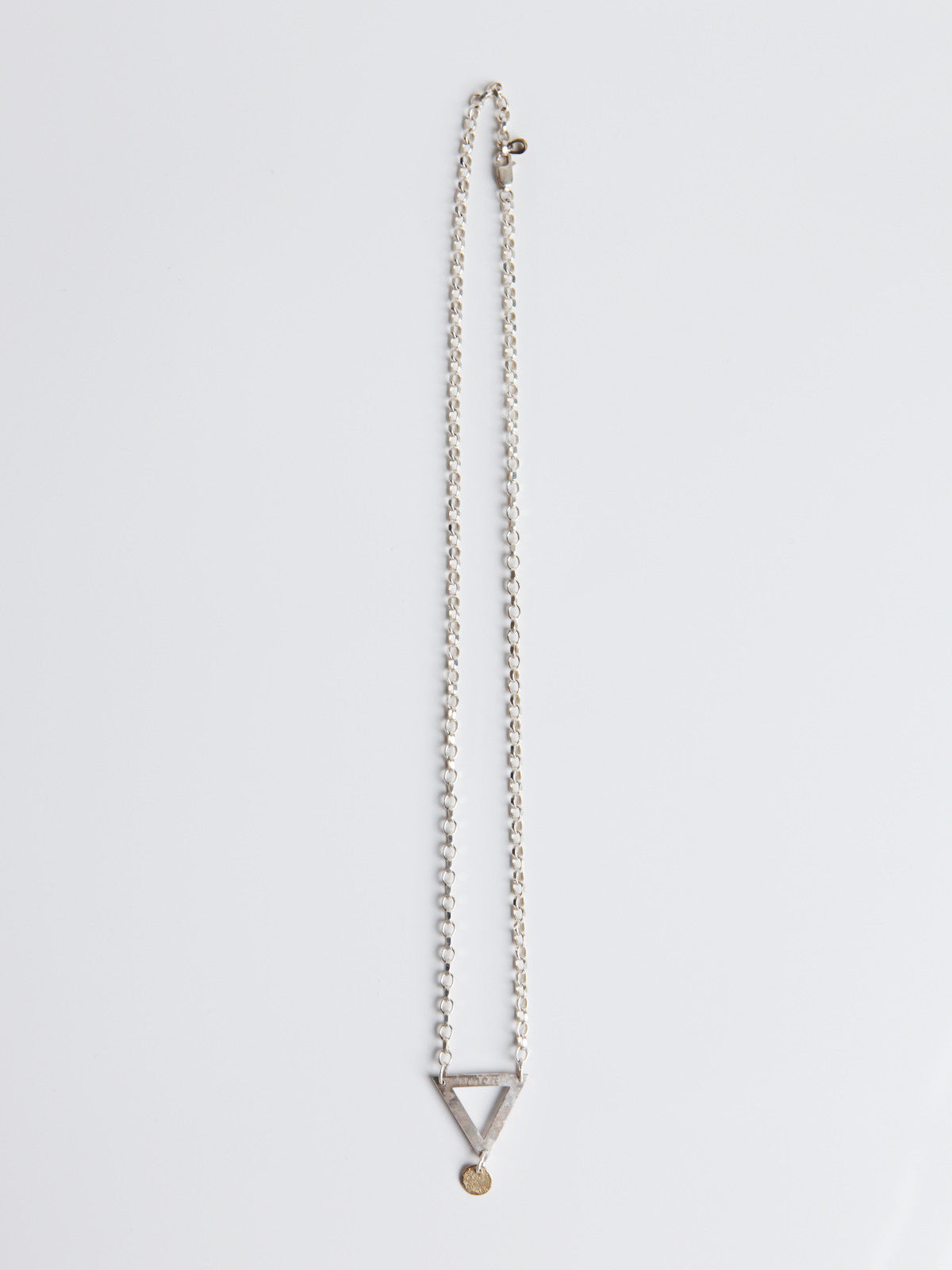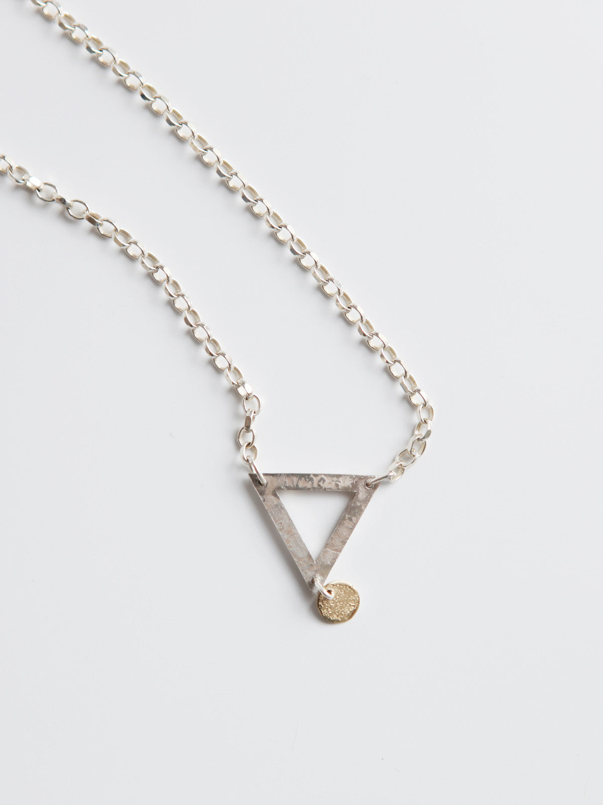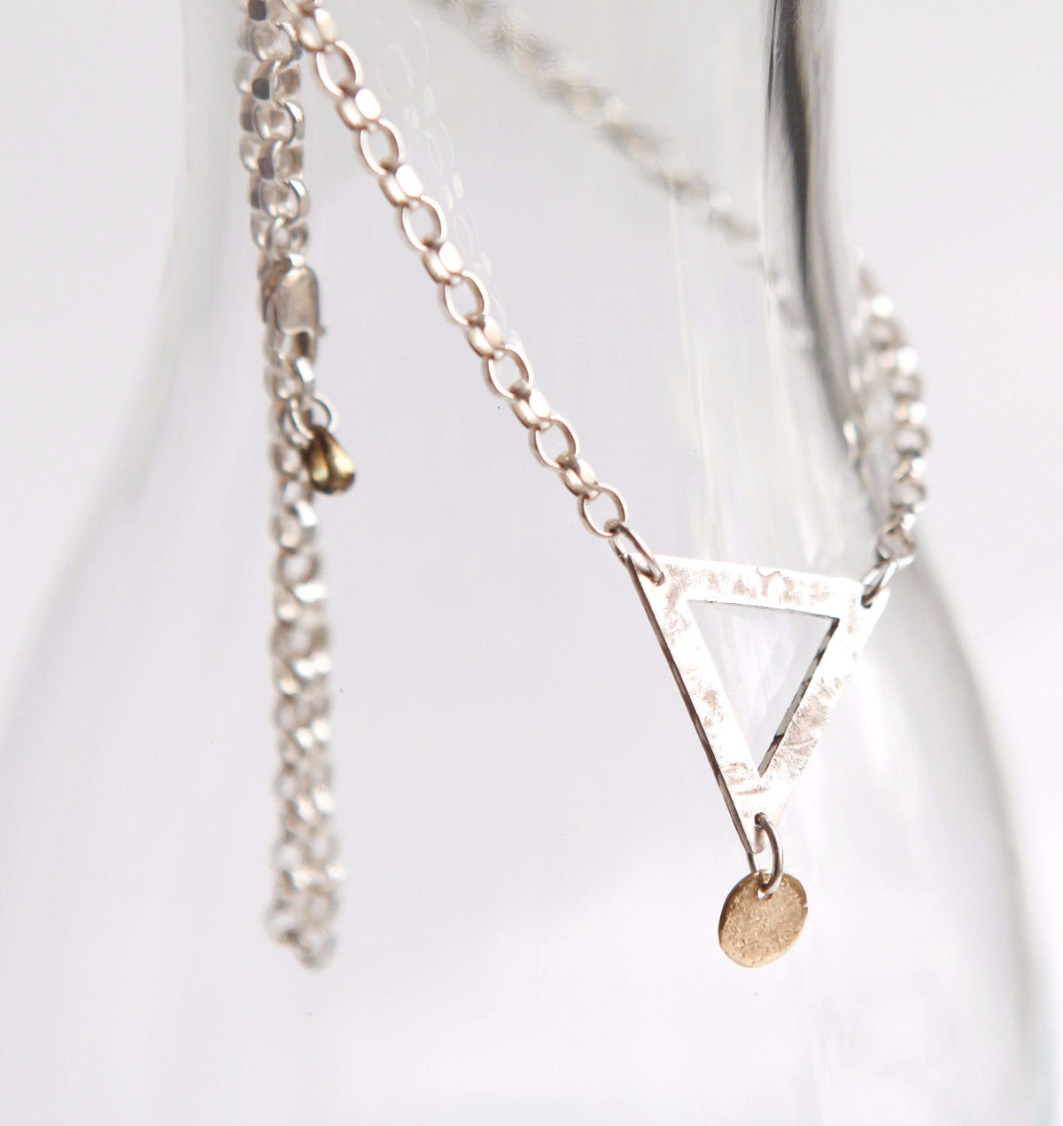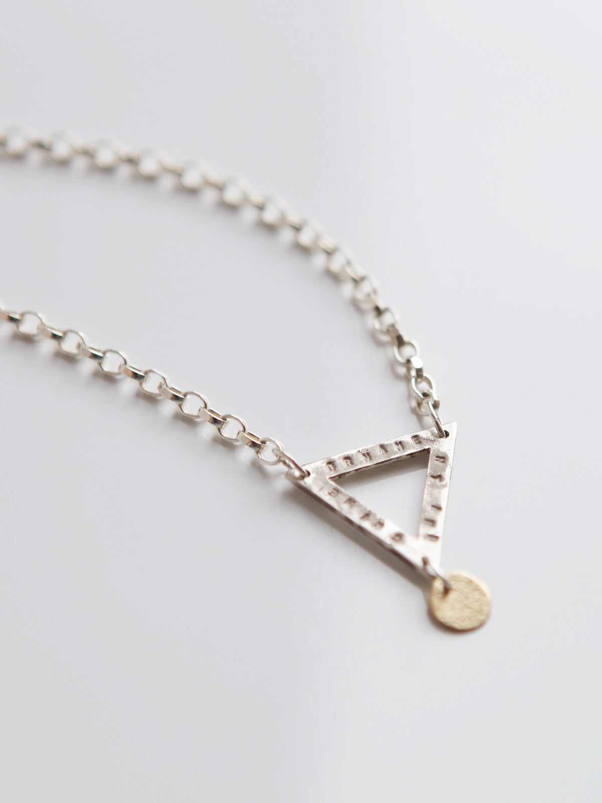 This handmade necklace has a silver & gold charm designed with a chunky silver chain. It has the word ''ornament and crime'' engraved on one side and a rustic texture on the other. This piece is perfect for the individual who pays attention to detail.