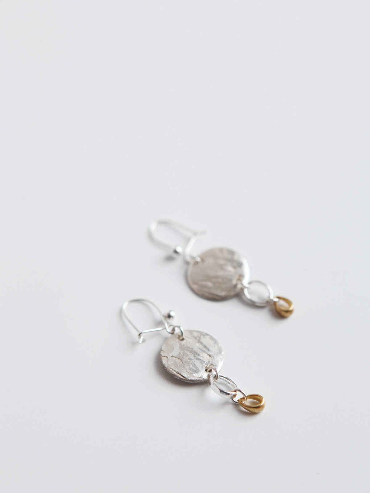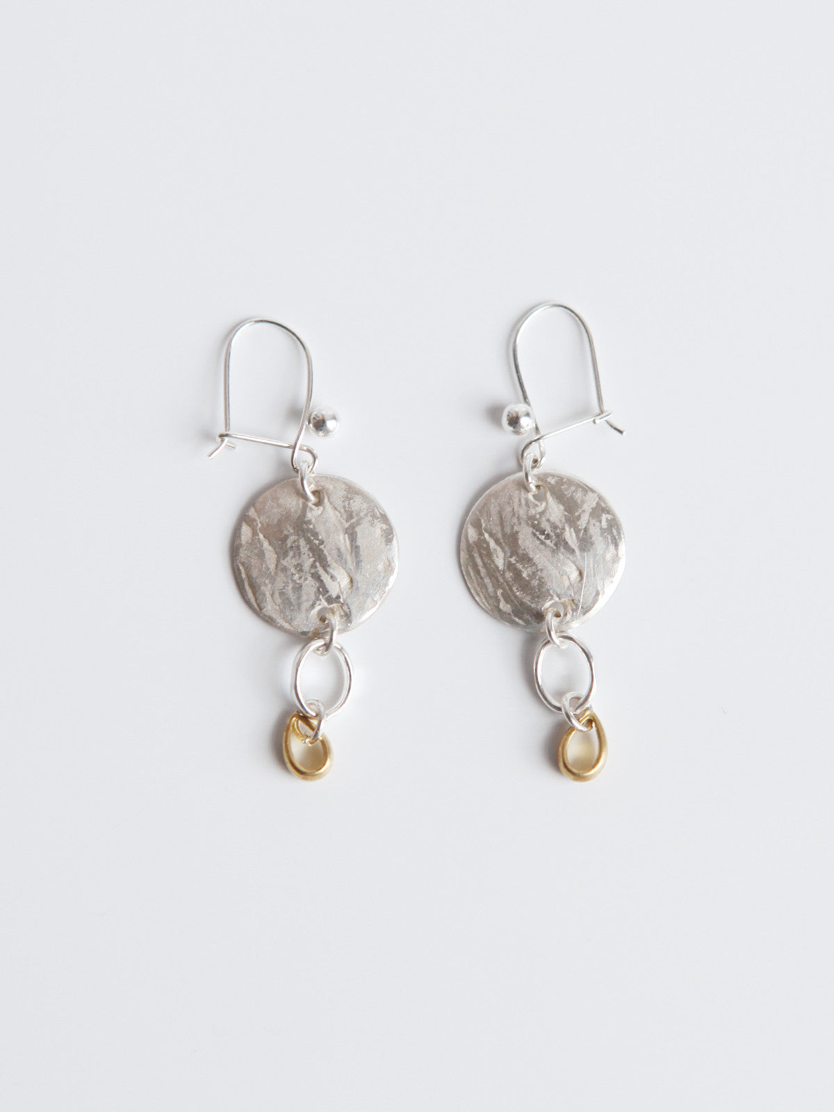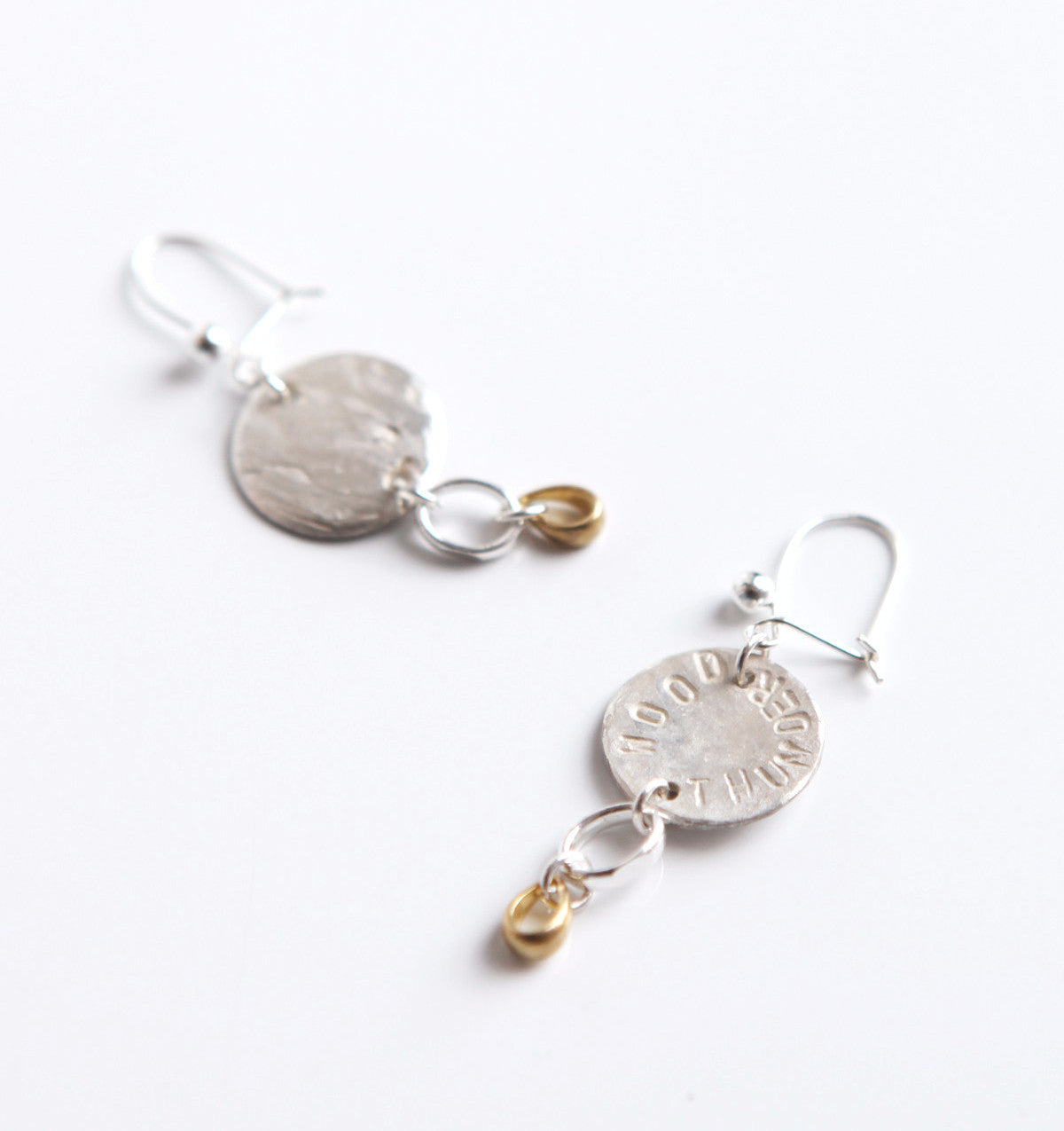 This is a handmade silver & brass charm earring which features the word ''wood thunder'' engraved on one side. It has a textural rustic finish on the other side of the charm with a brass hanging detail.