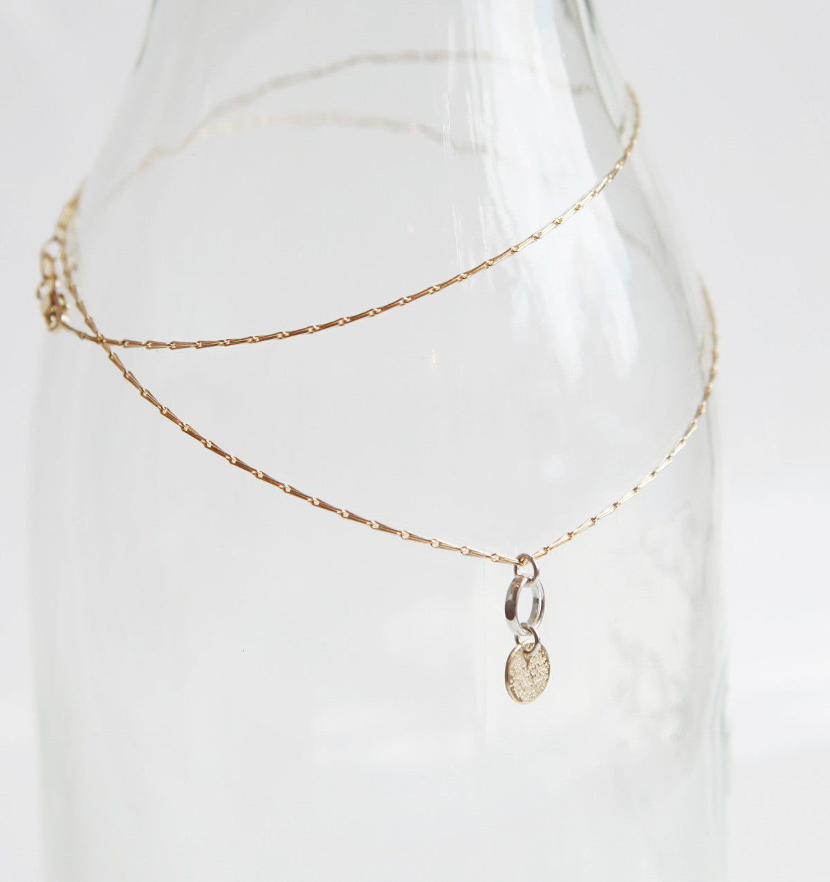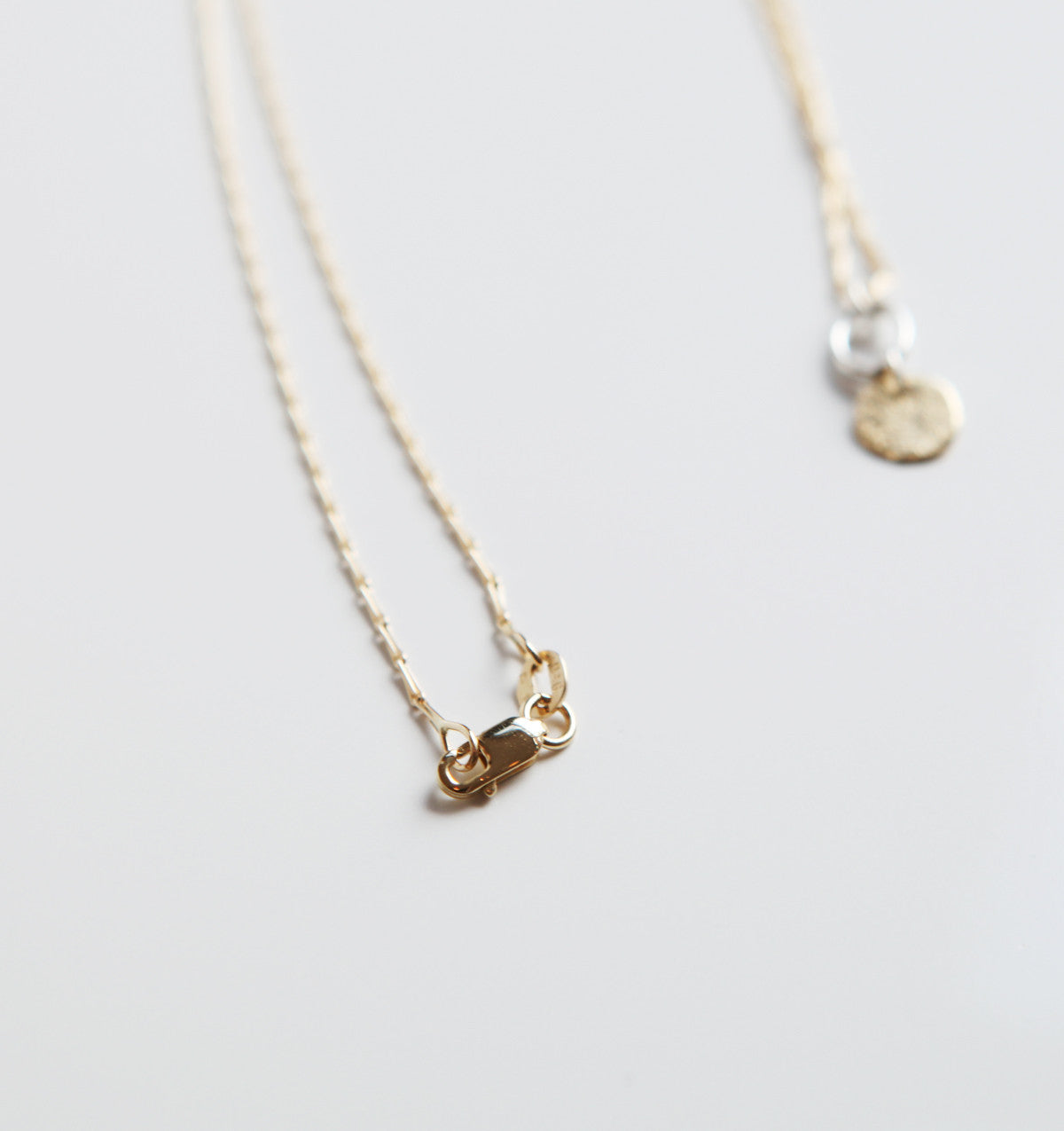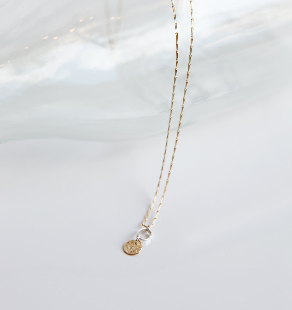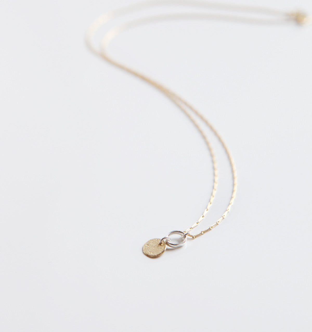 This necklace features a mix of gold and silver detail. It has a gold charm and a silver hoop attached to a delicate gold chain. It is a subtle yet elegant piece of jewellery perfect for layering with a range of our charm necklaces or can be worn by itself for a minimal look.