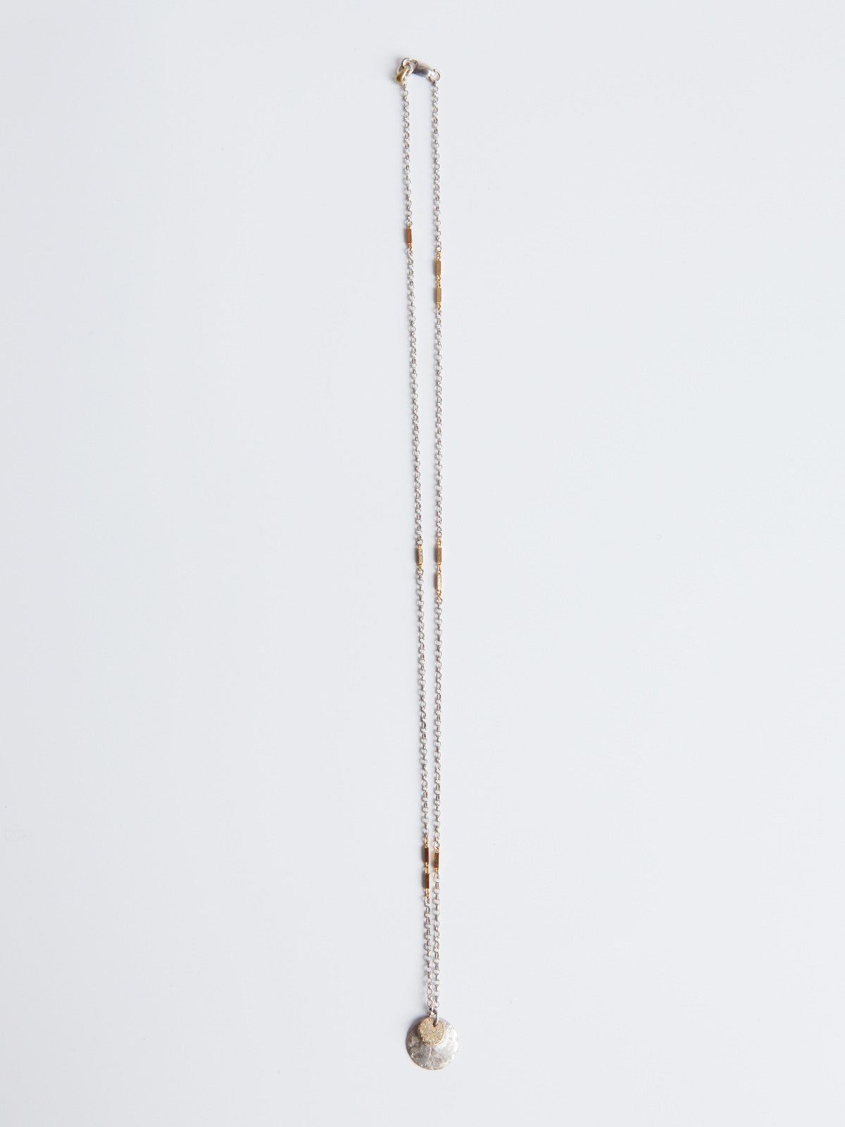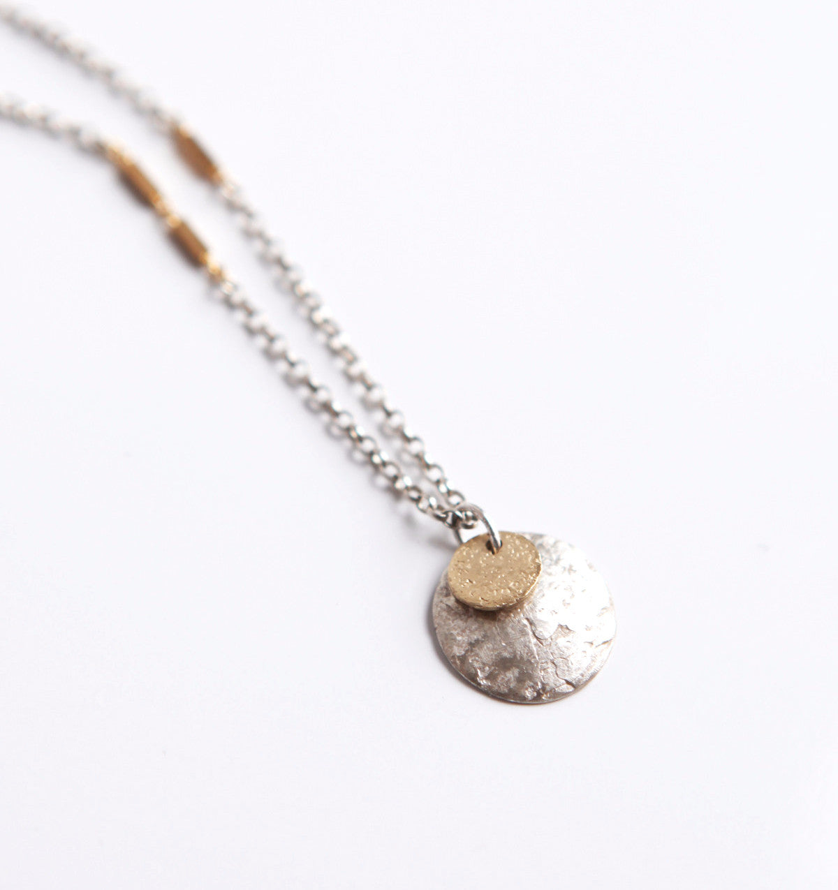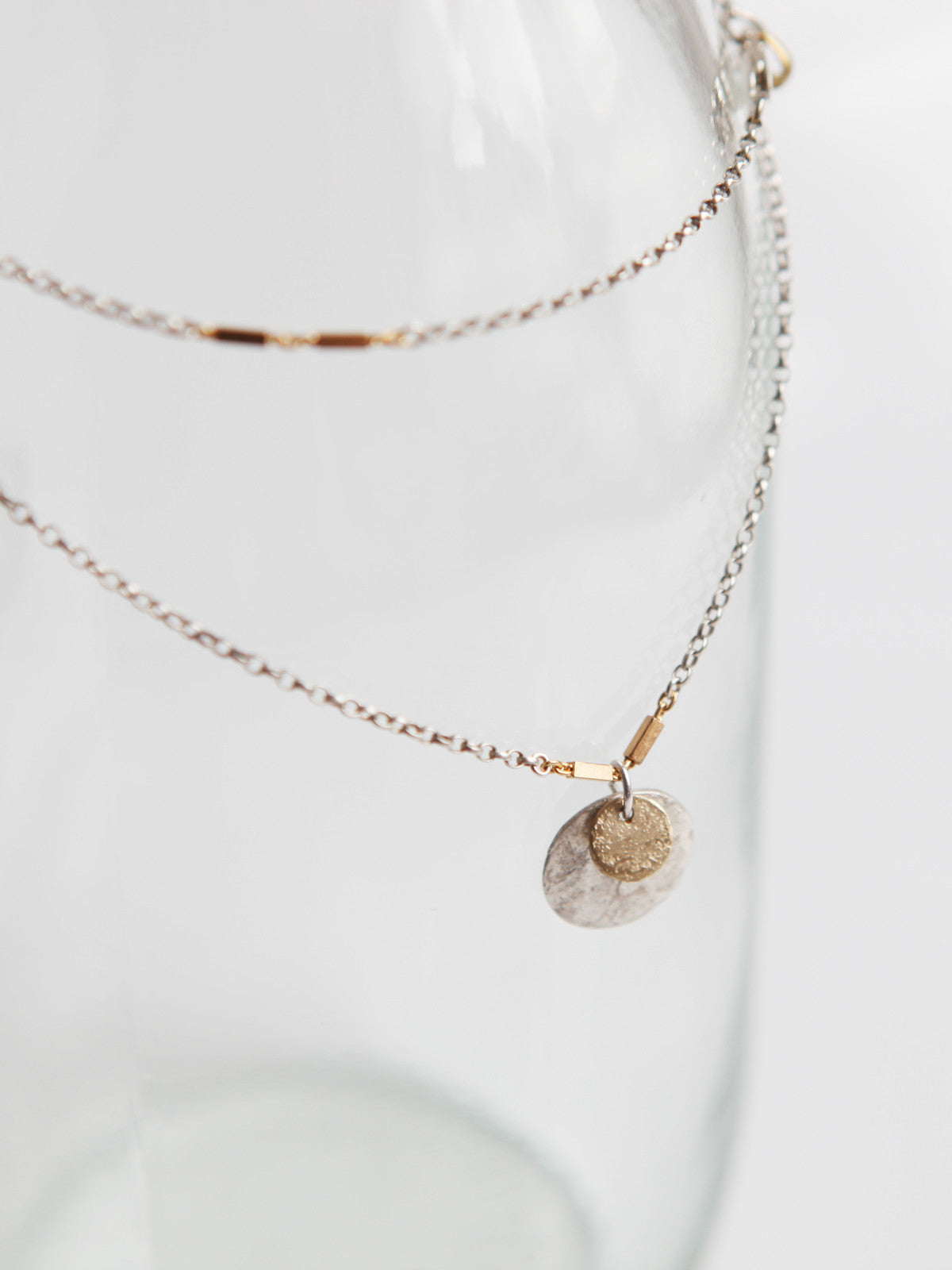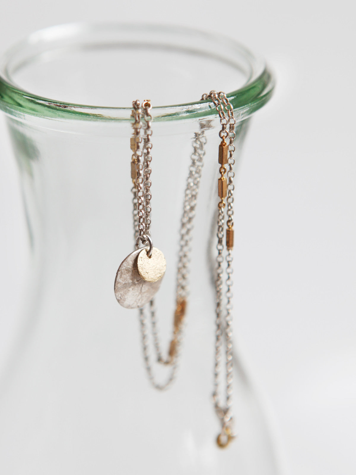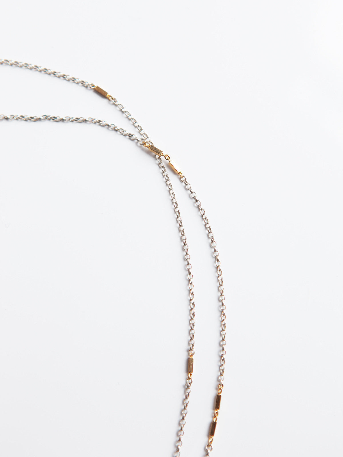 This necklace features a silver & gold charm which drapes beautifully over the skin. The chain has a silver and gold plating finish. It is a very delicate and elegant piece from our collection perfect to be worn by itself.