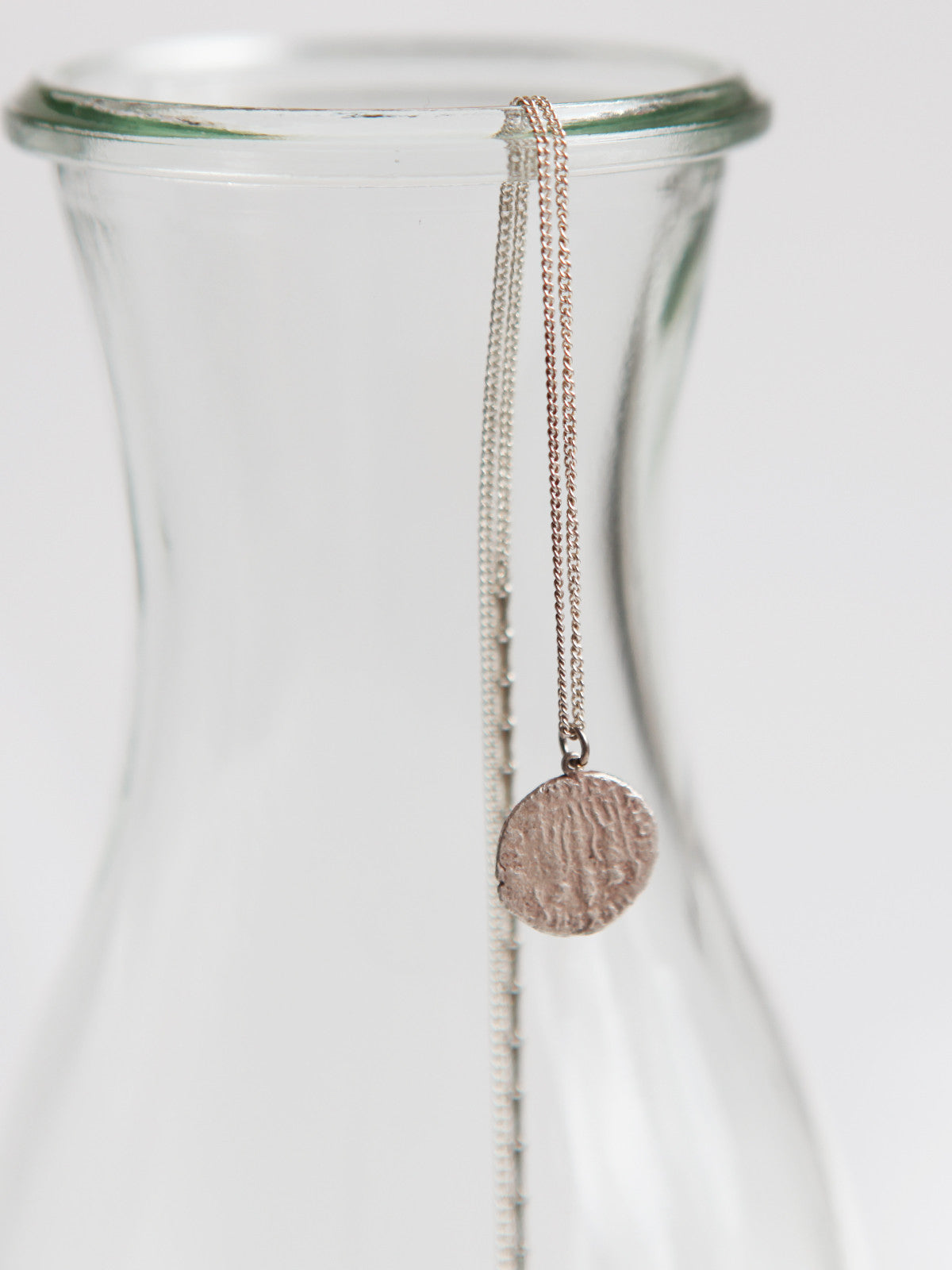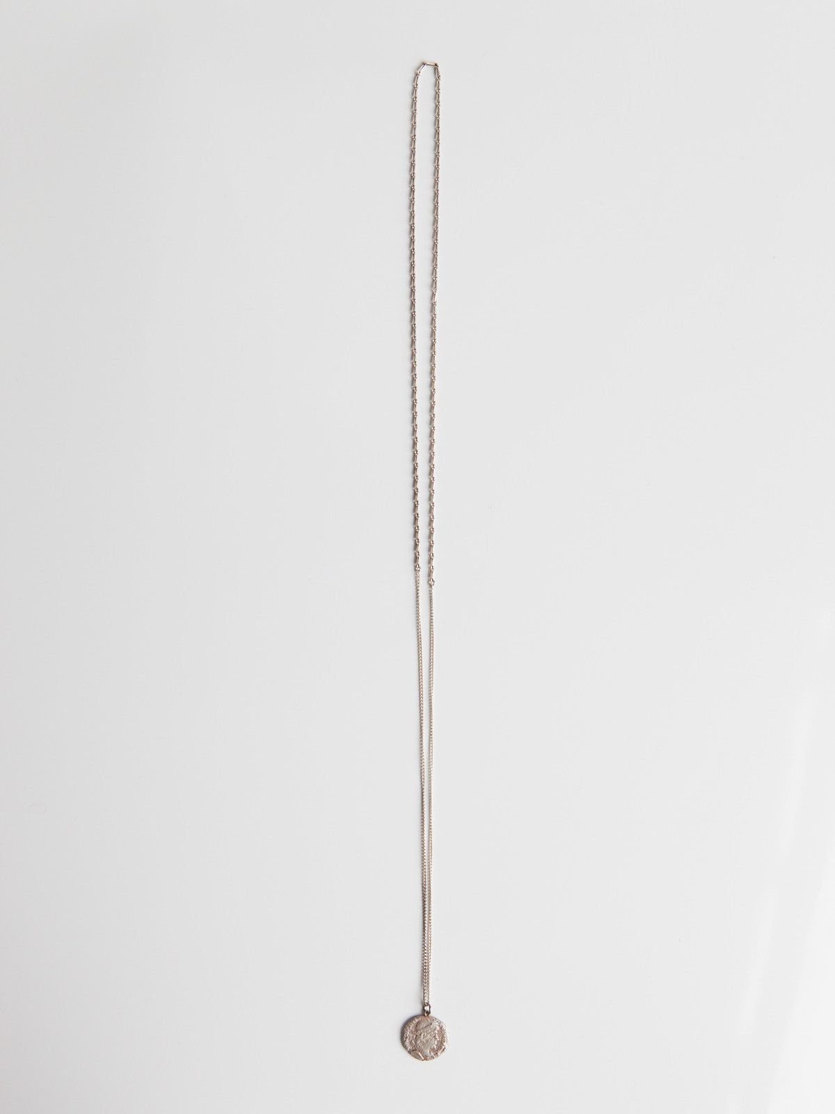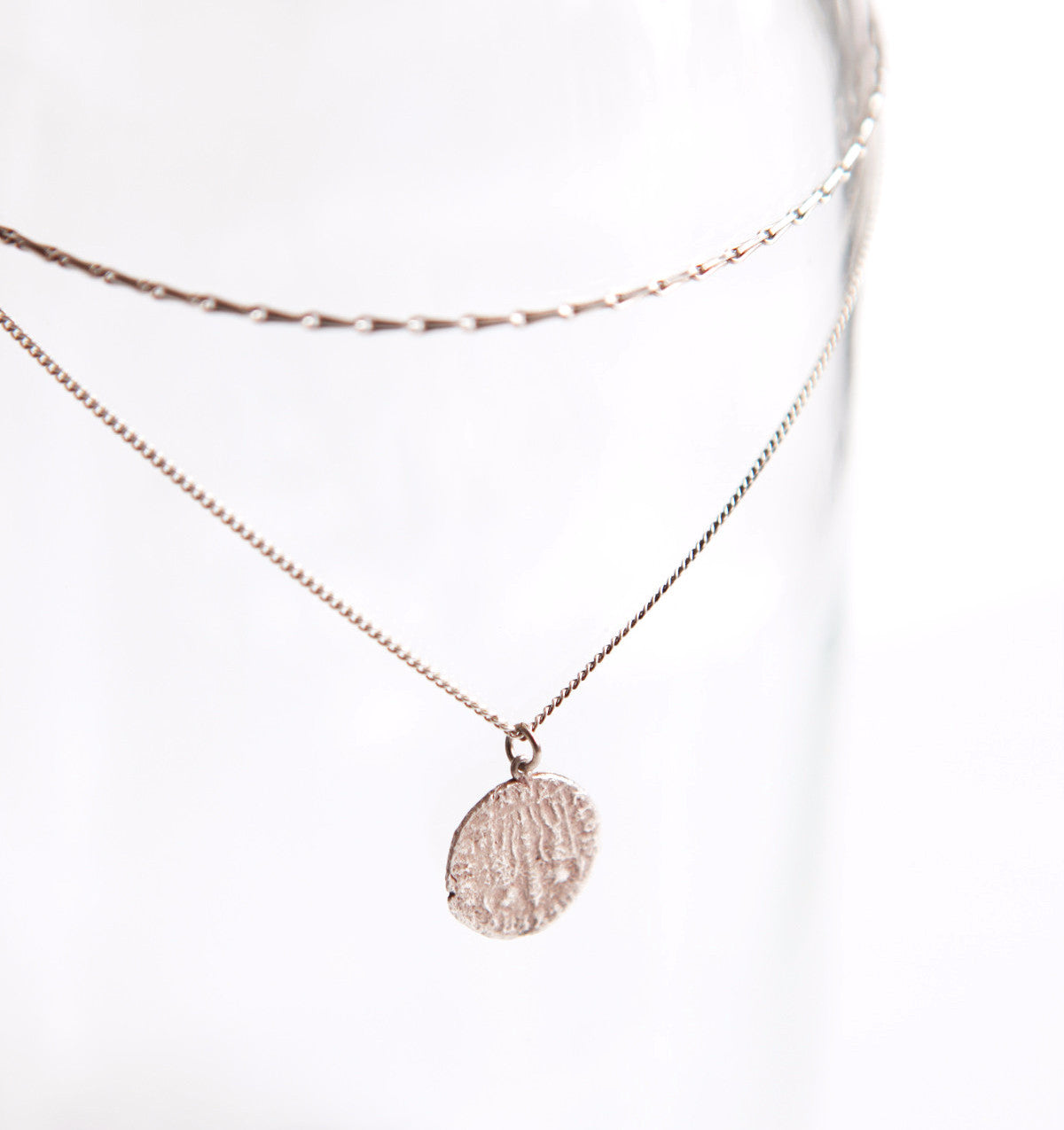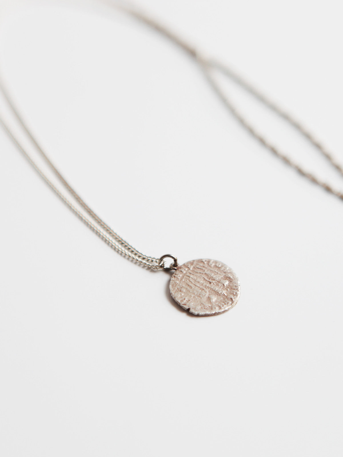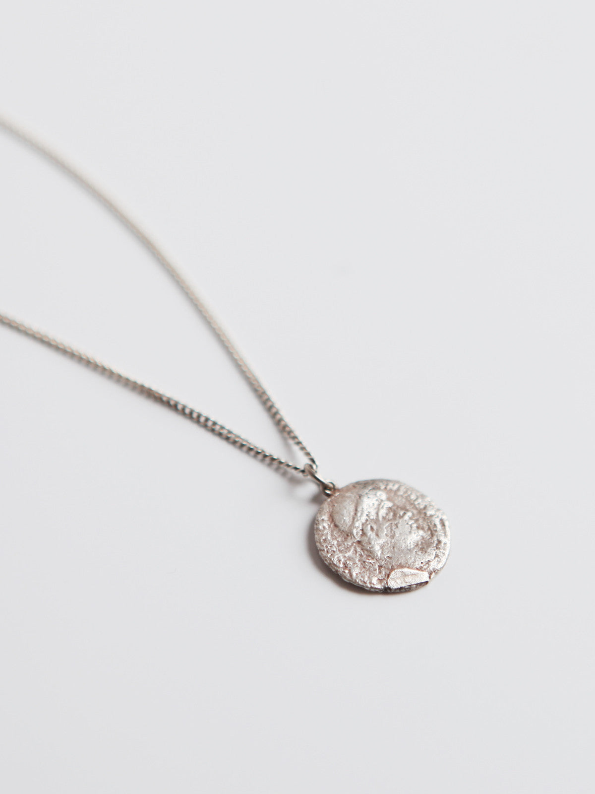 This necklace has a long silver chain with different chain widths for a unique look. It comes with a silver roman coin charm which has a rustic texture. A subtle and elegant piece from our collection perfect for the individual who pays attention to detail.