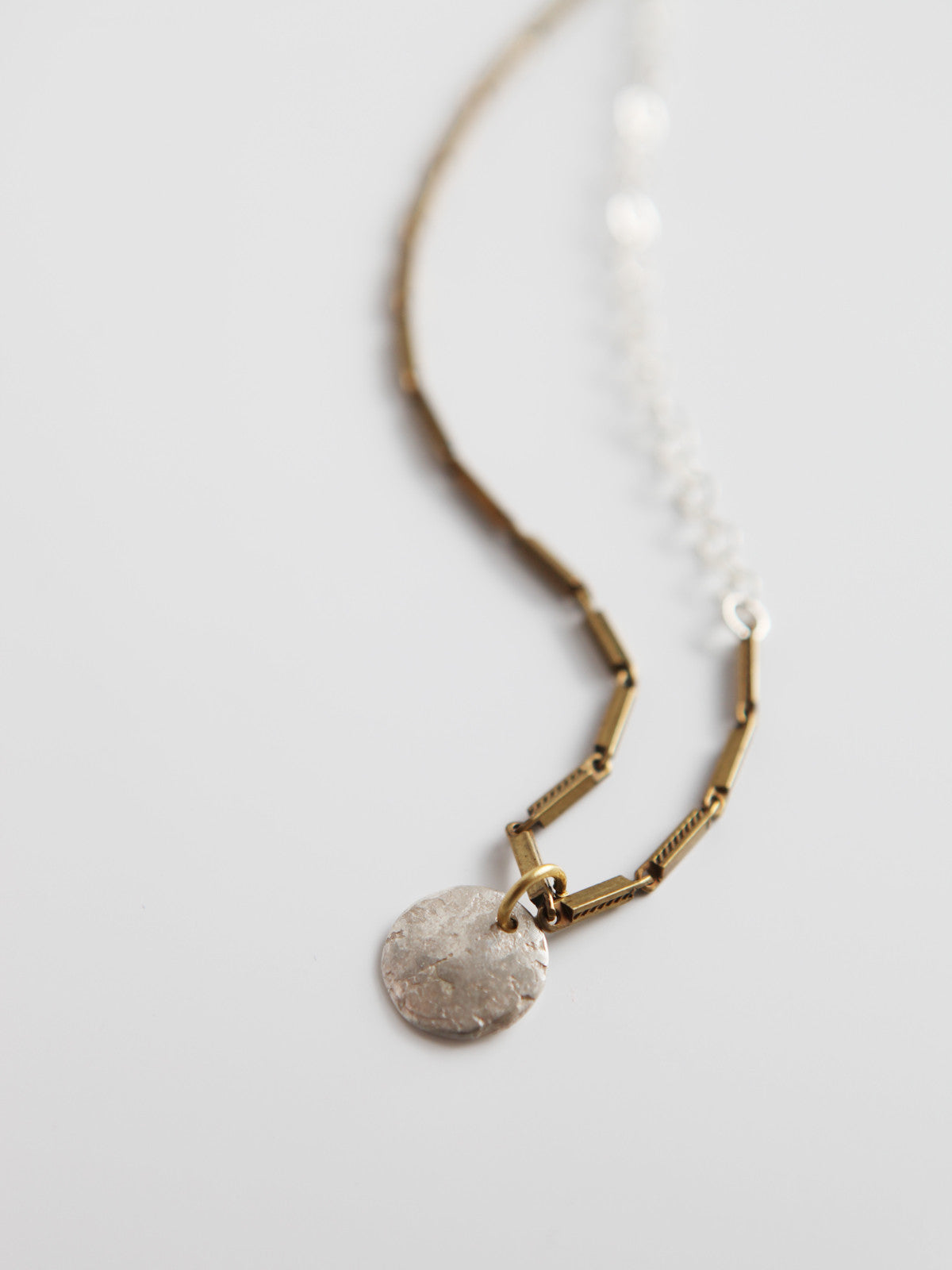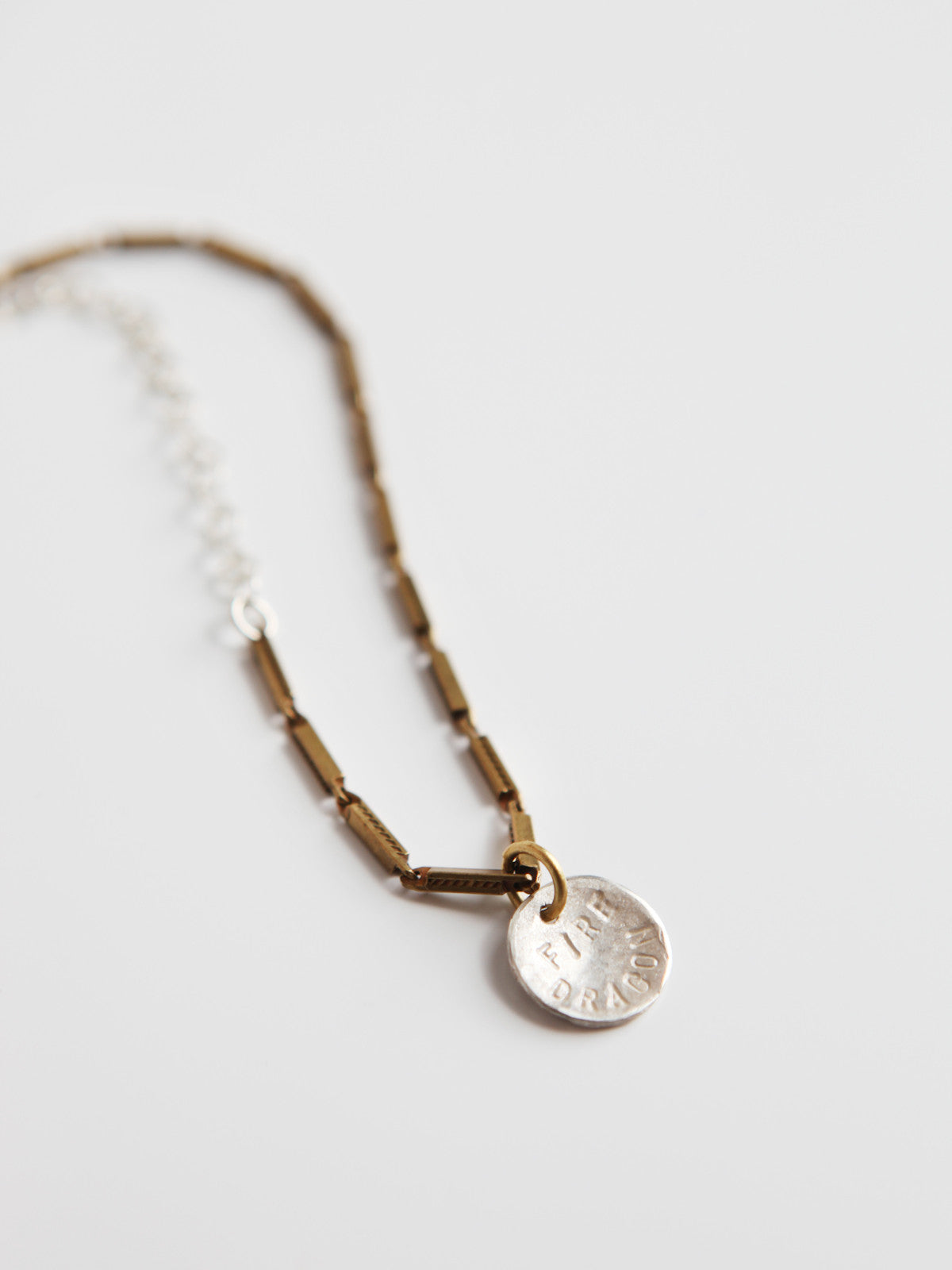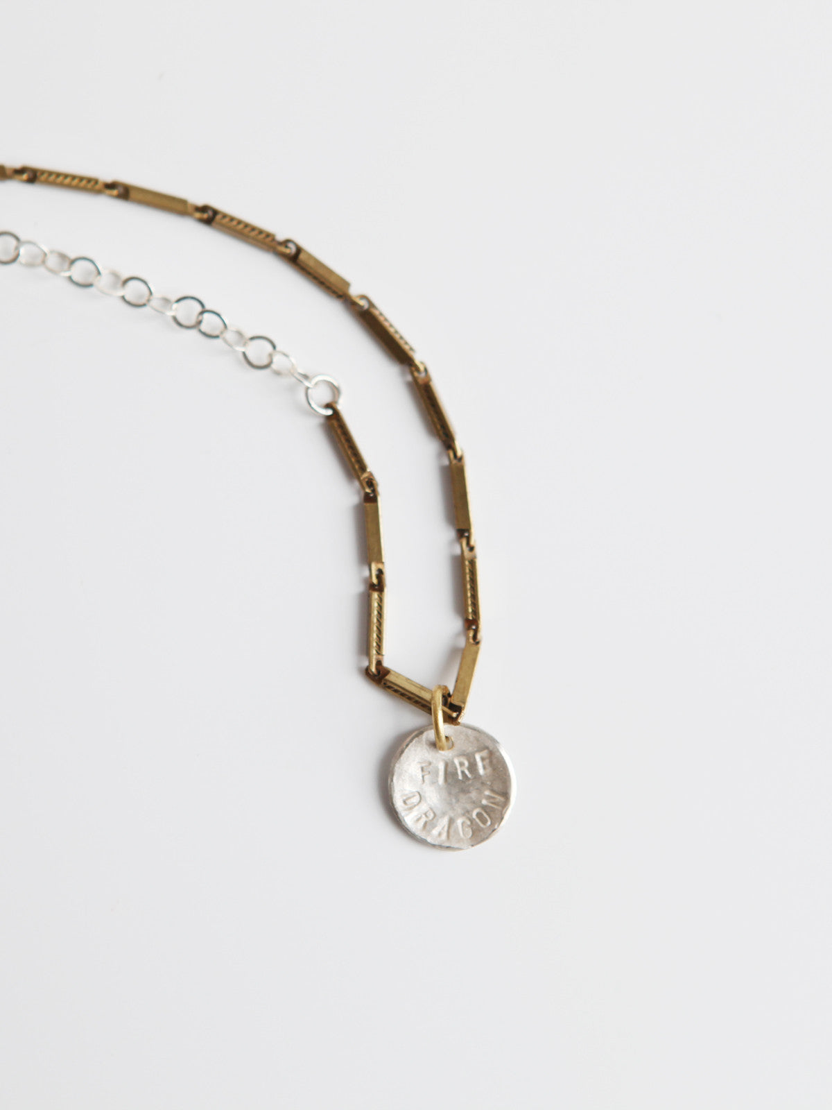 This necklace features a silver charm with half silver and half brass chain. The charm has a textural and rustic effect with the word ''fire dragon'' engraved on one side.