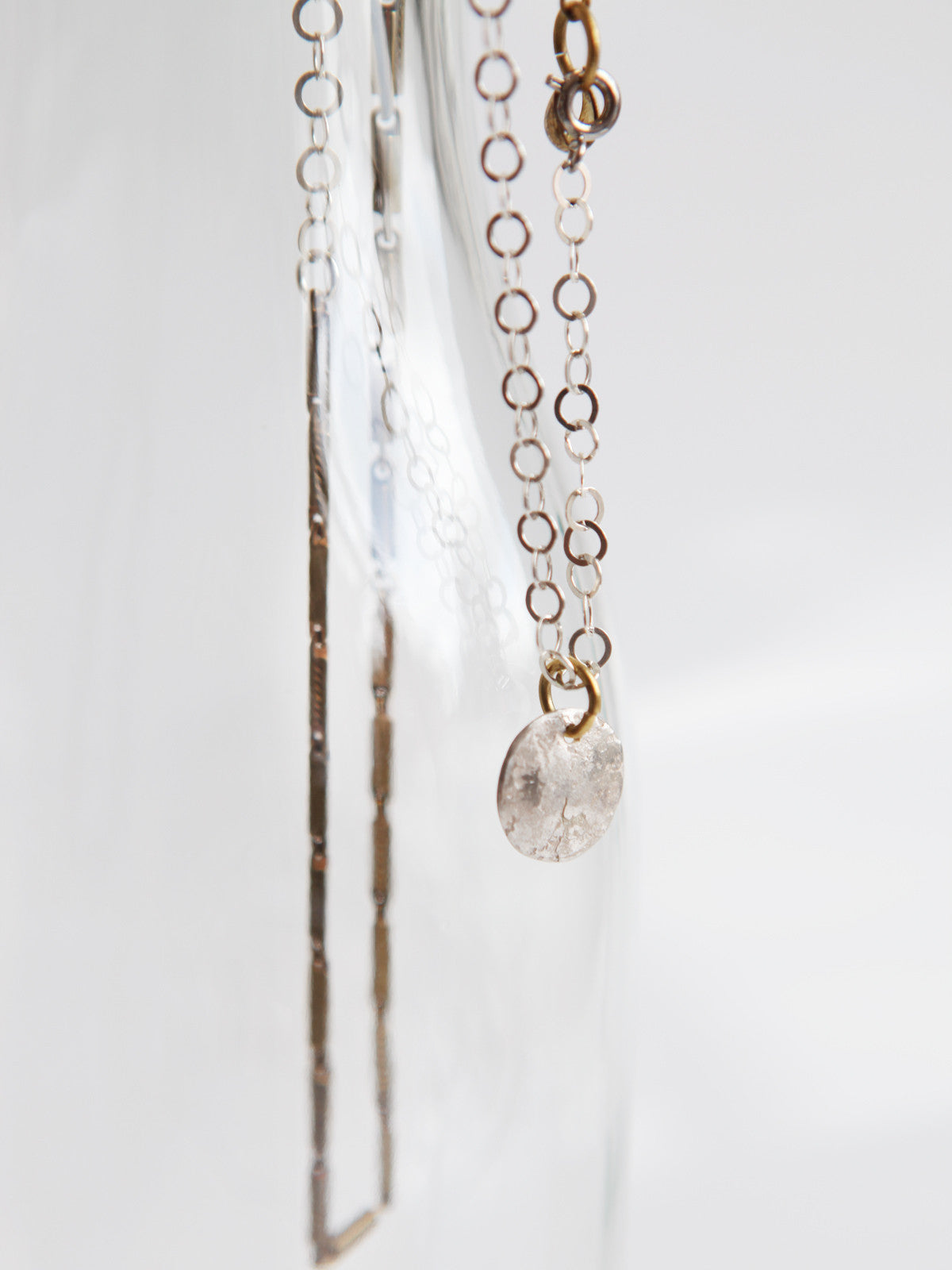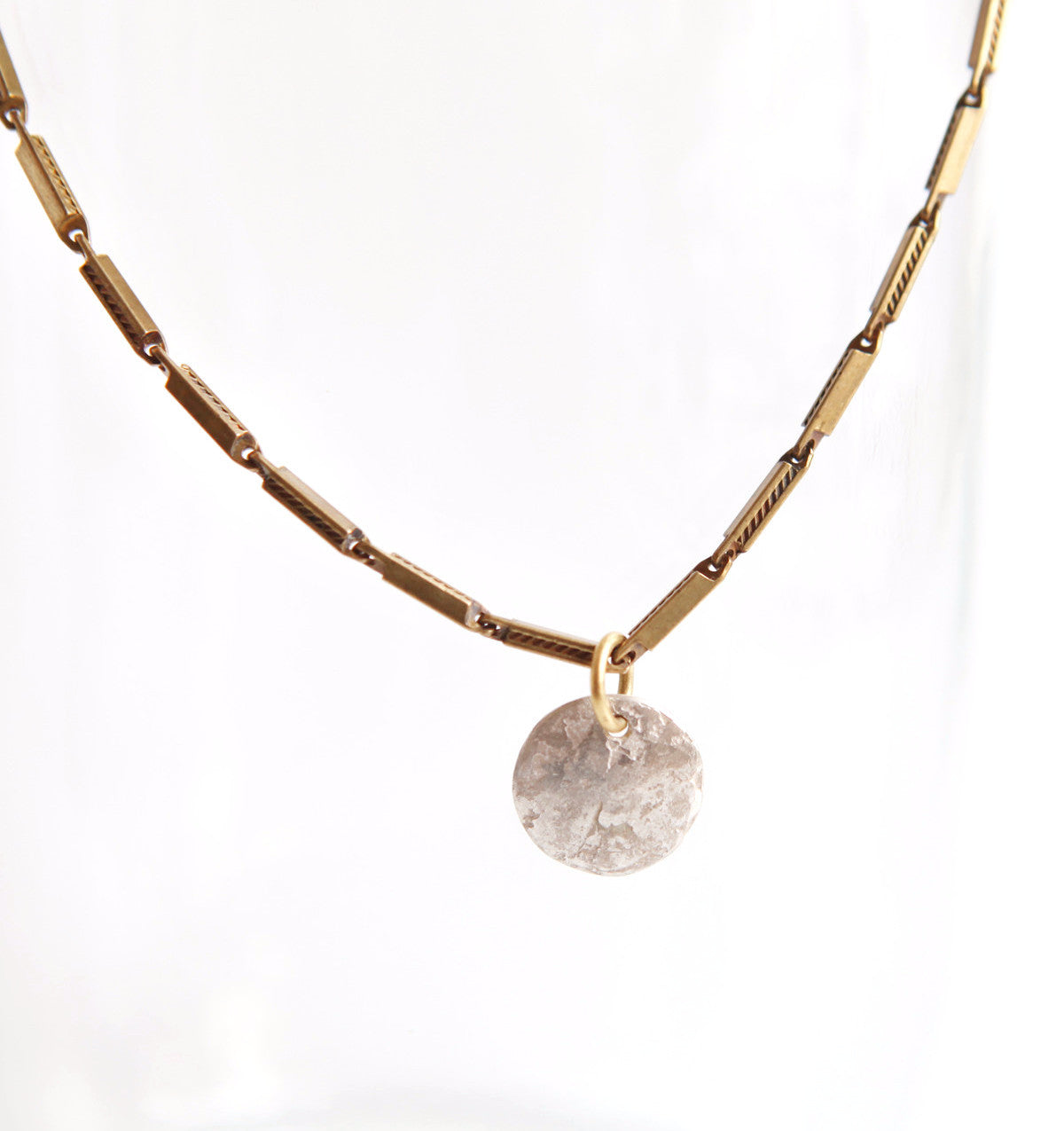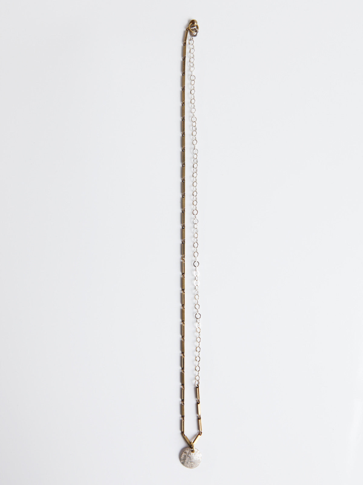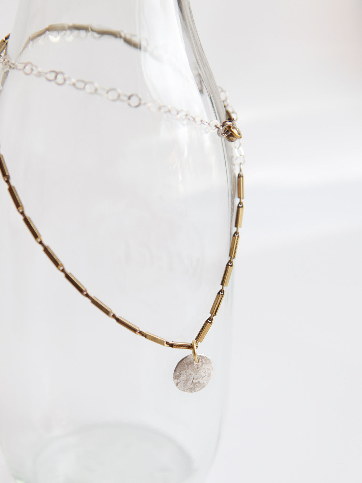 This necklace features a silver charm with half silver and half brass chain. The charm has a textural and rustic effect with the word ''fire dragon'' engraved on one side.