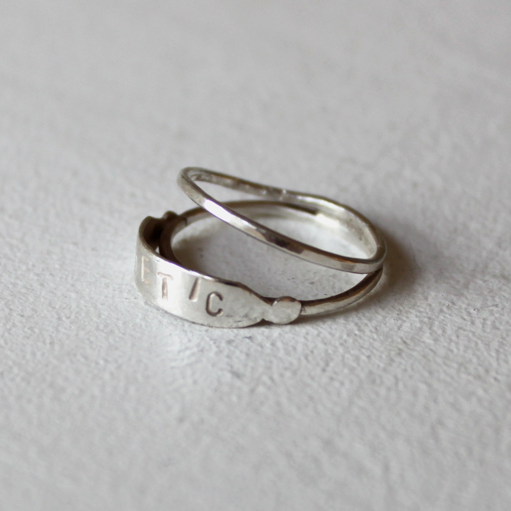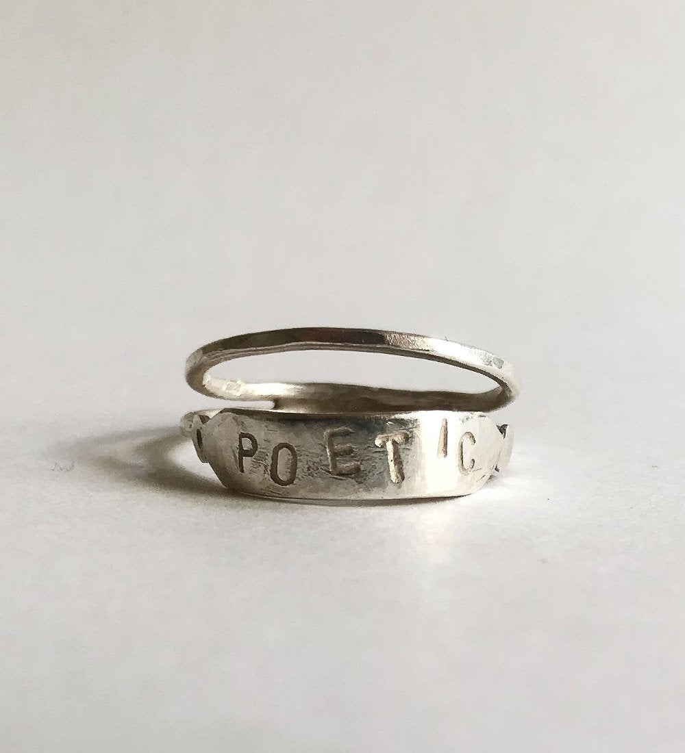 It features a double stack inspired design. It has the word ''poetic'' engraved on a silver bar. Simply wear this out with your other rings or one of ours for a matching set.
