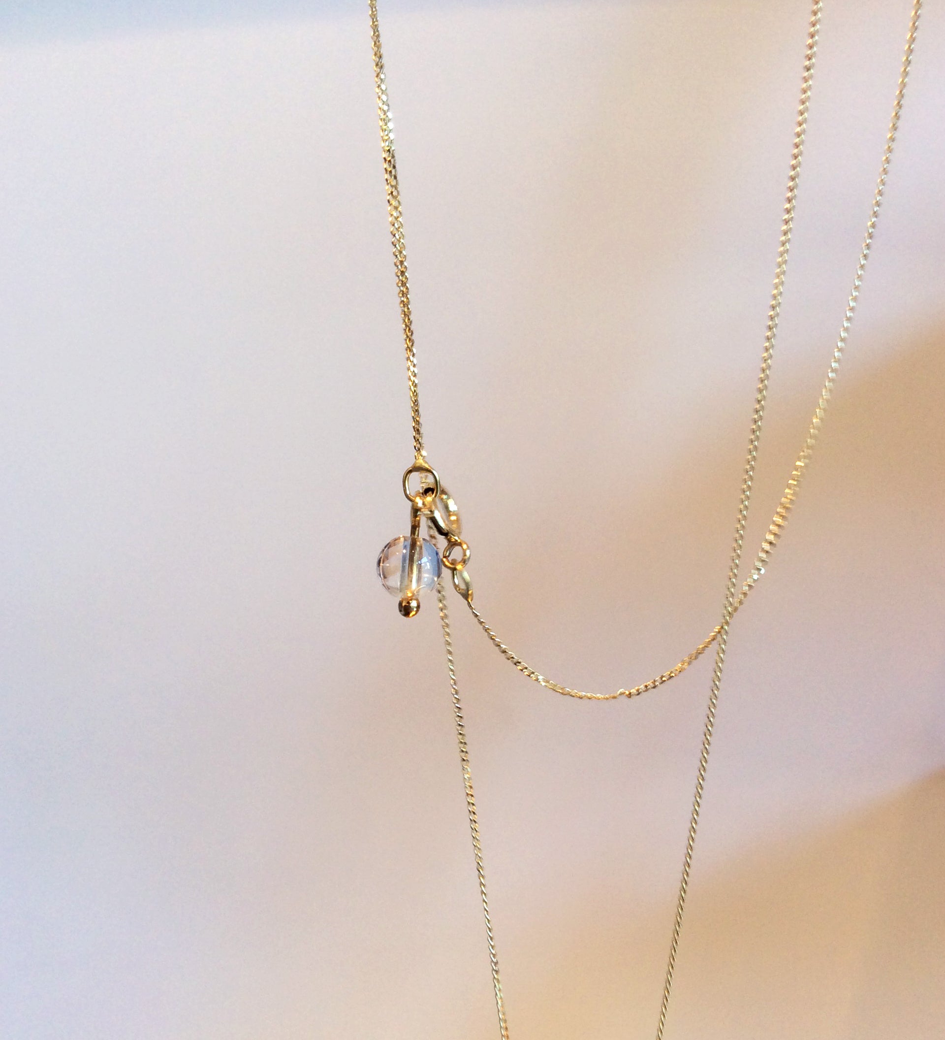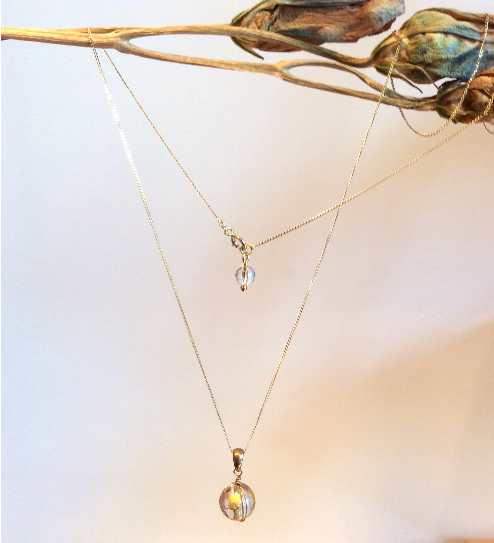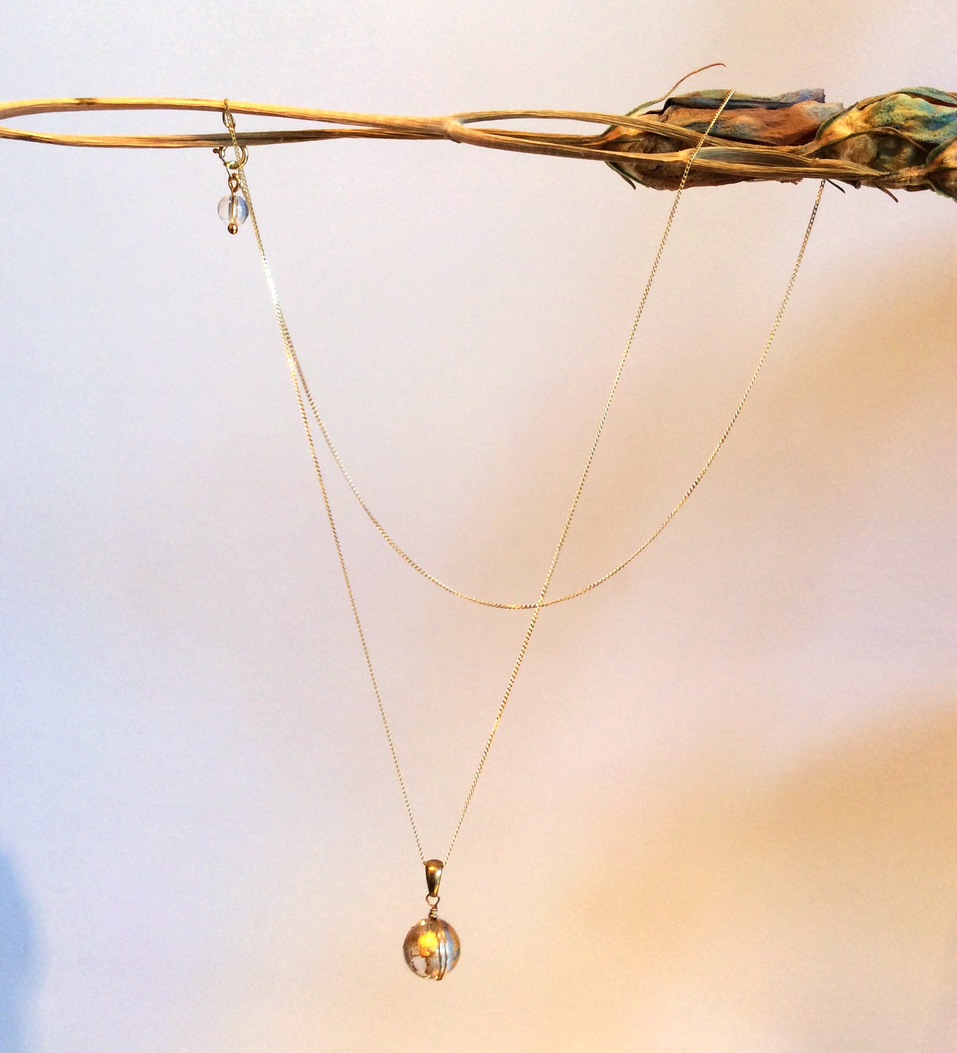 Beautifully simple, this necklace is made with a thin gold chain and features a brass droplet from where a glass bead with gold leaf hangs. Delicate and unique. This piece is designed of the individual who likes to pay attention to detail.