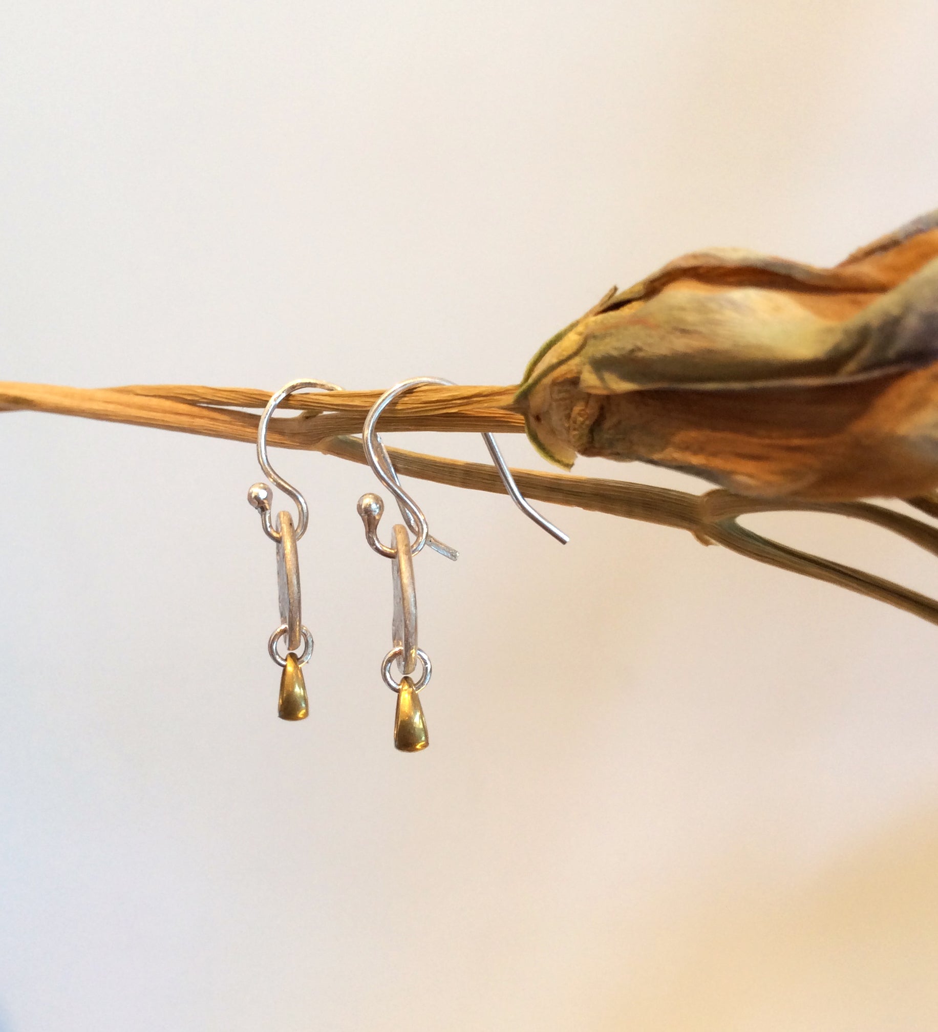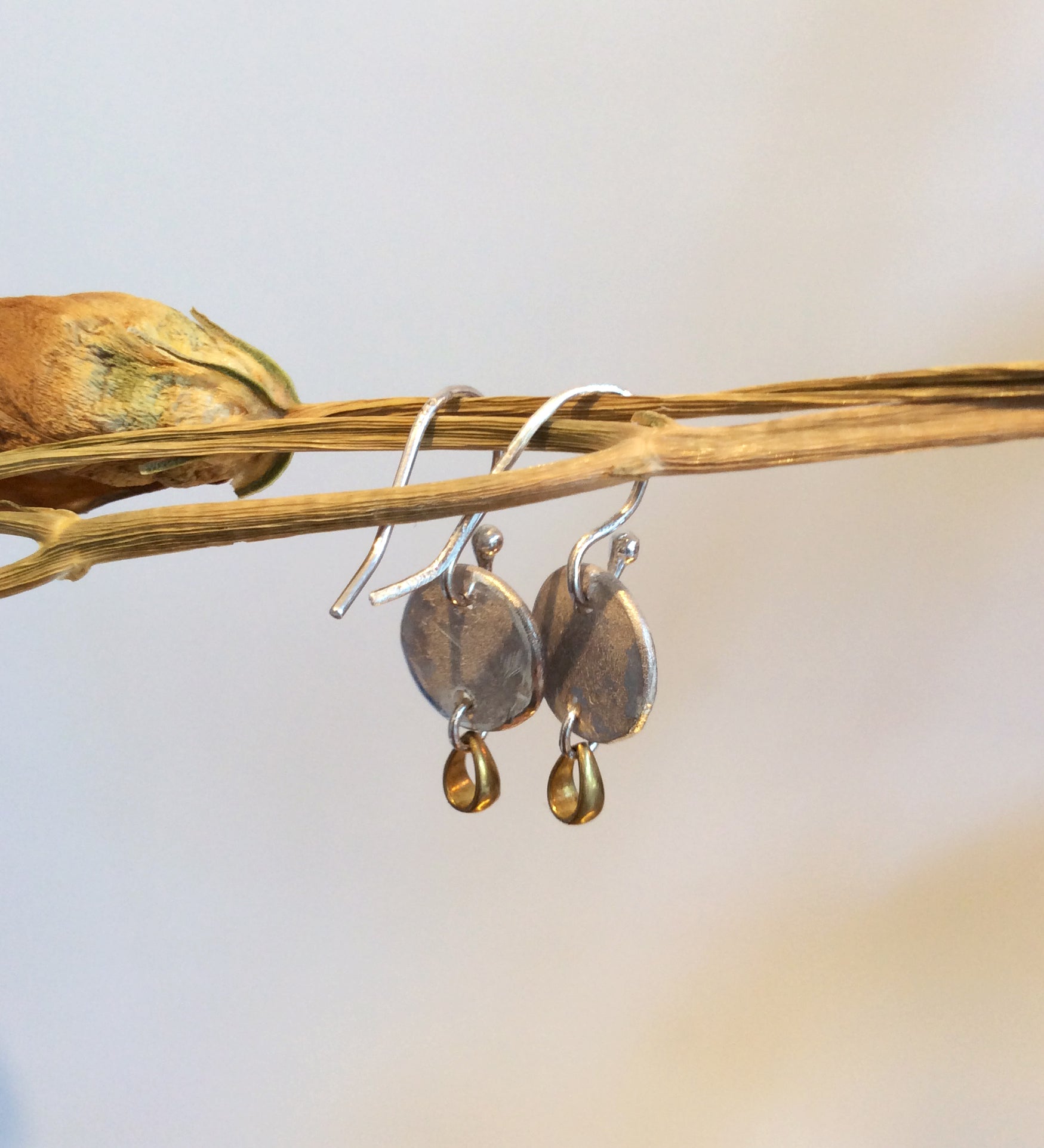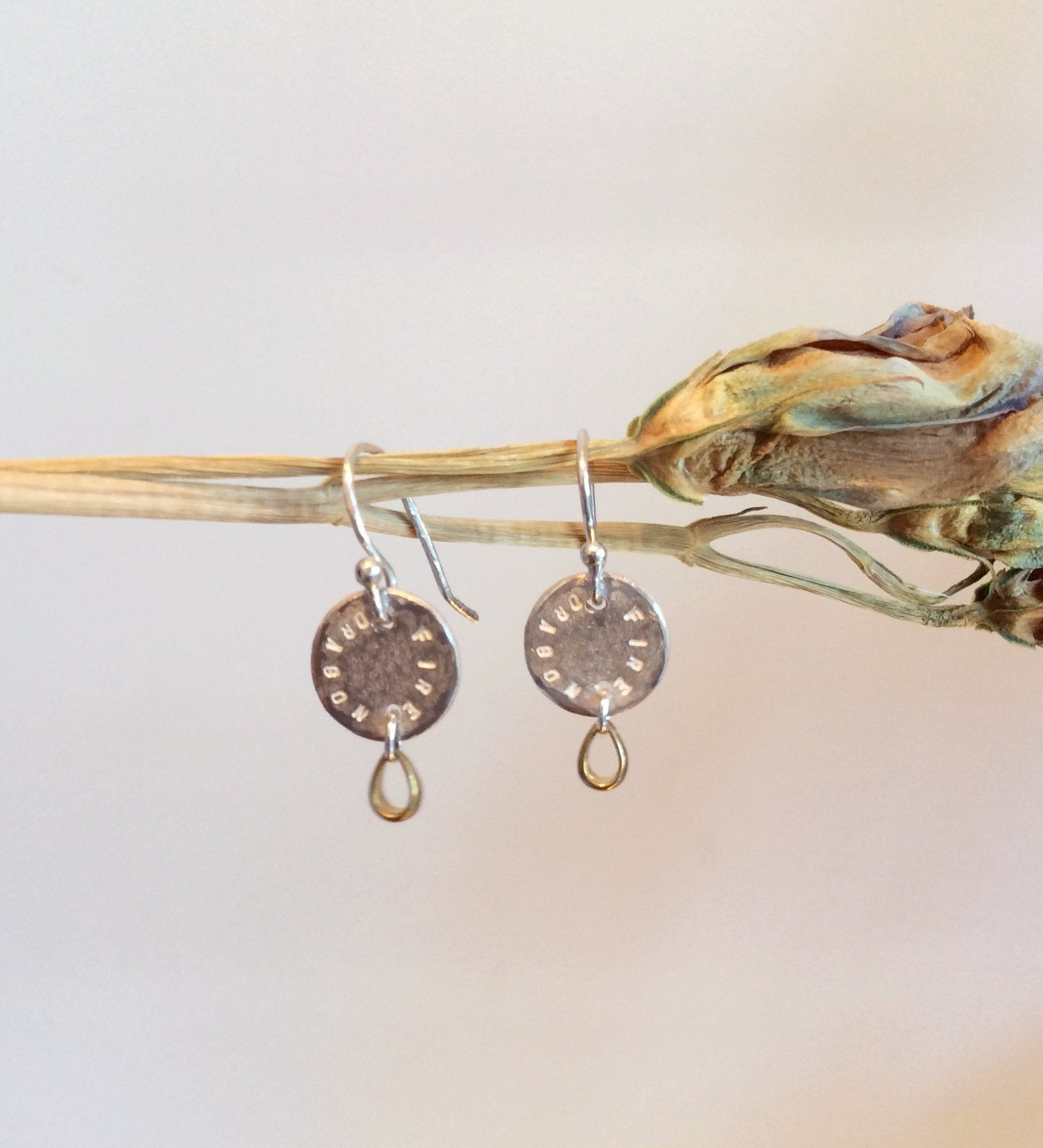 Small silver charm earrings with the words 'FIRE' over 'DRAGON' engraved on one side. It also features a dainty brass droplet. This message is inspired by Chinese I Ching, which means great success in life.