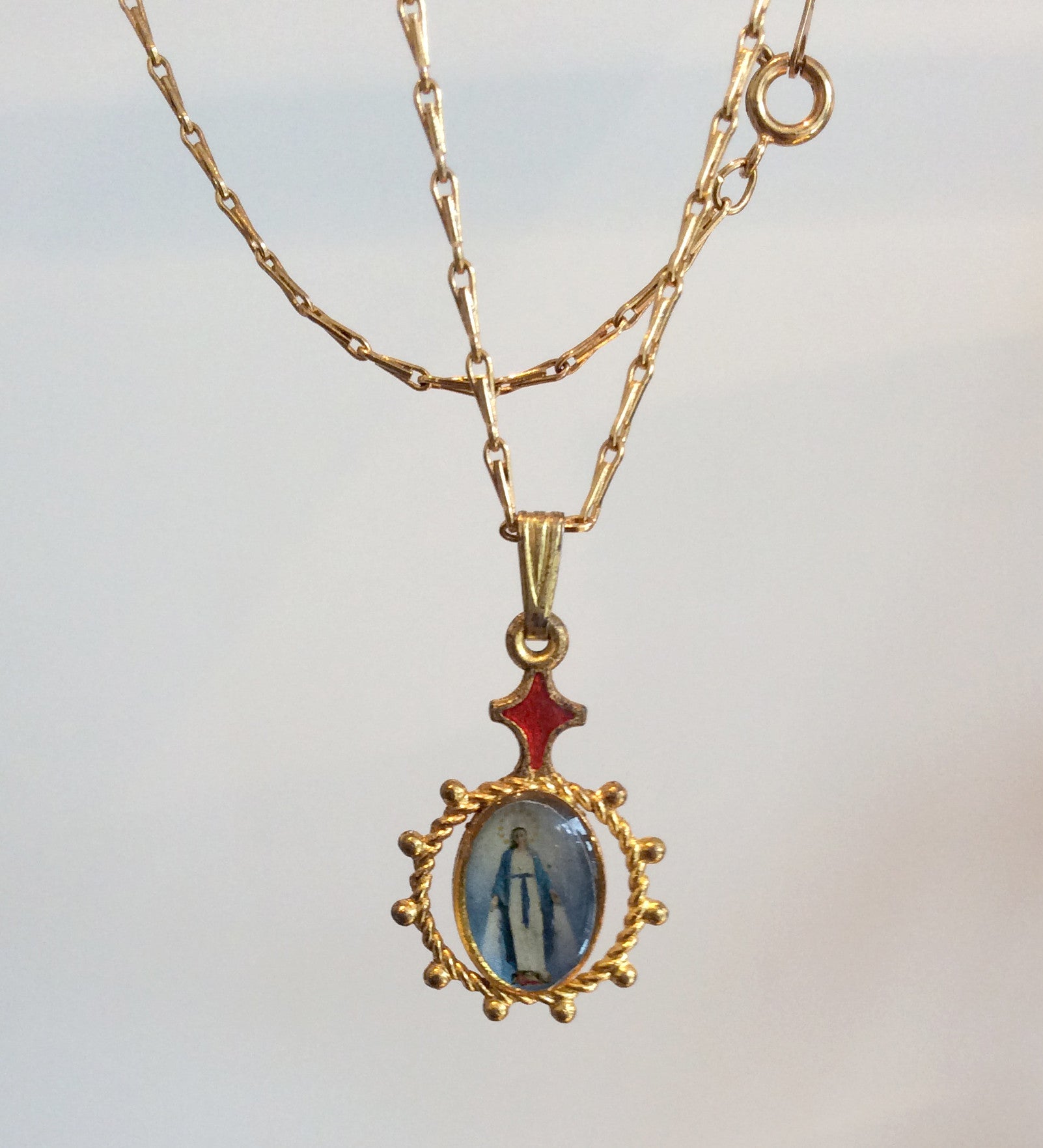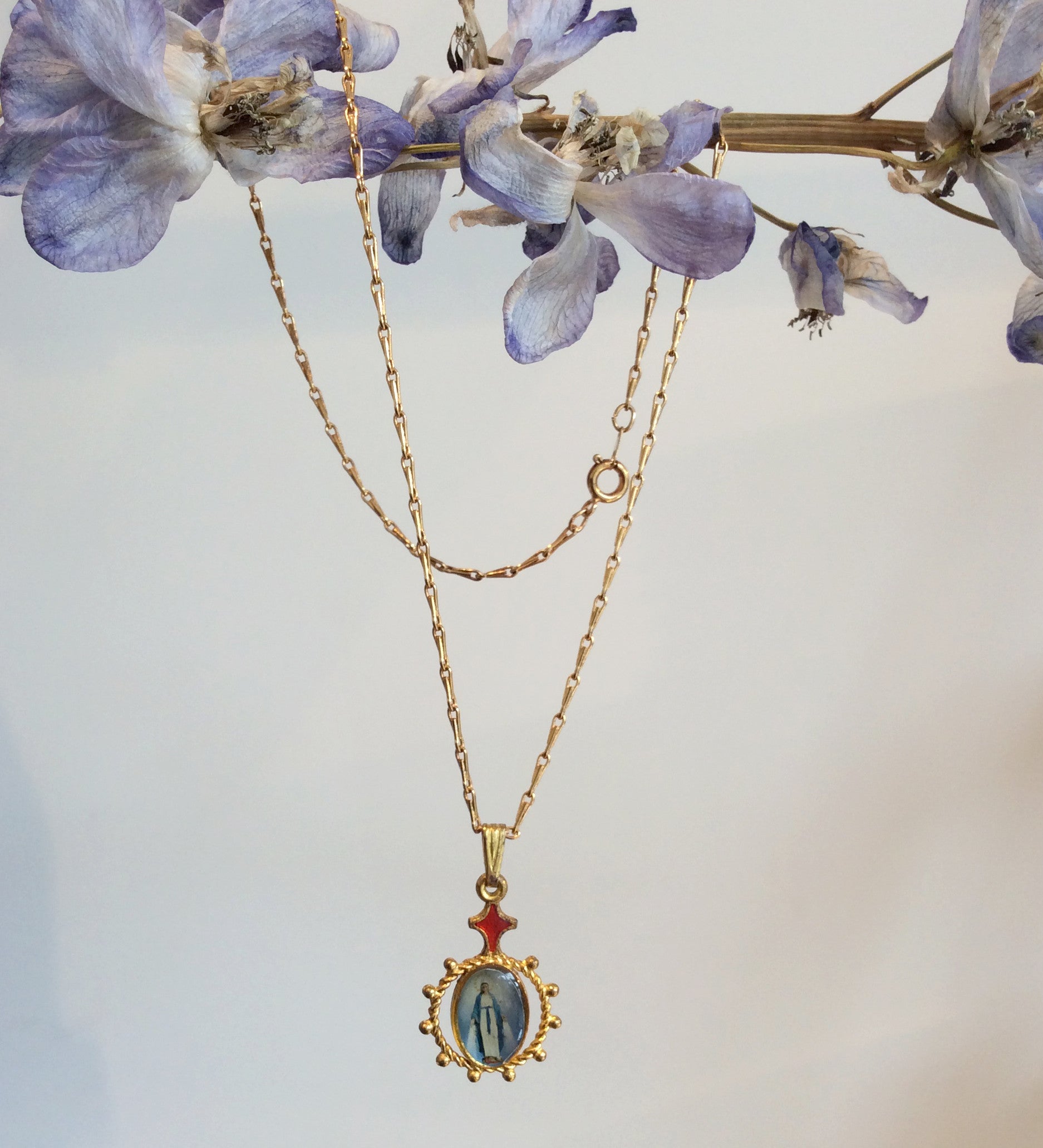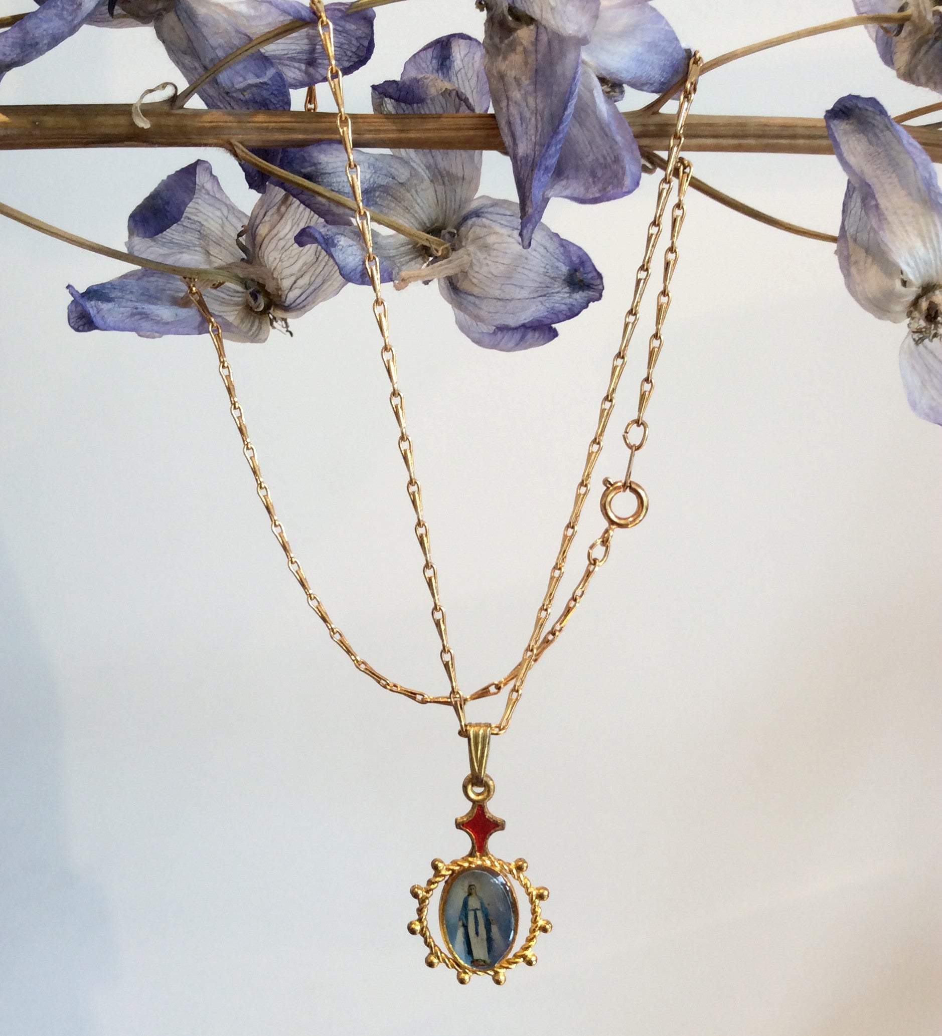 A gold plated chain paired with vintage Virgin Mary charm. A unique piece which works beautifully on its own. You can easily pair this with our selection of gold and silver earrings available on our shop.