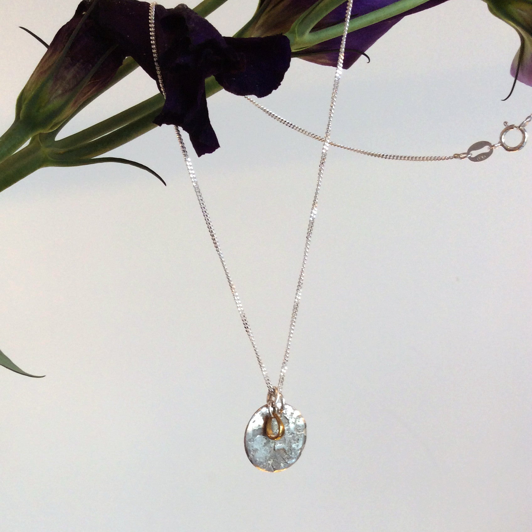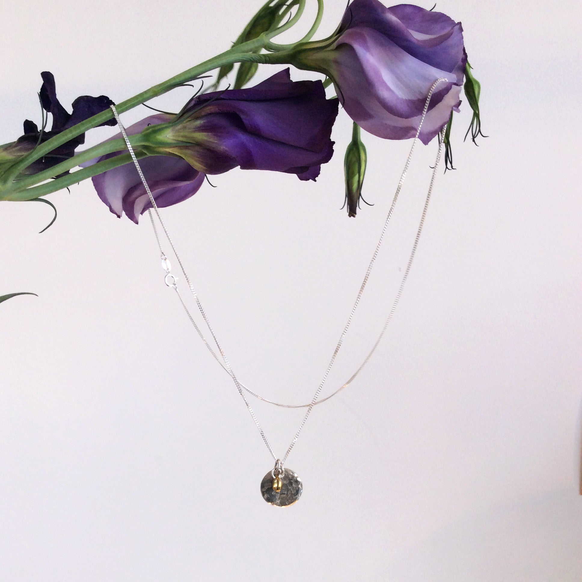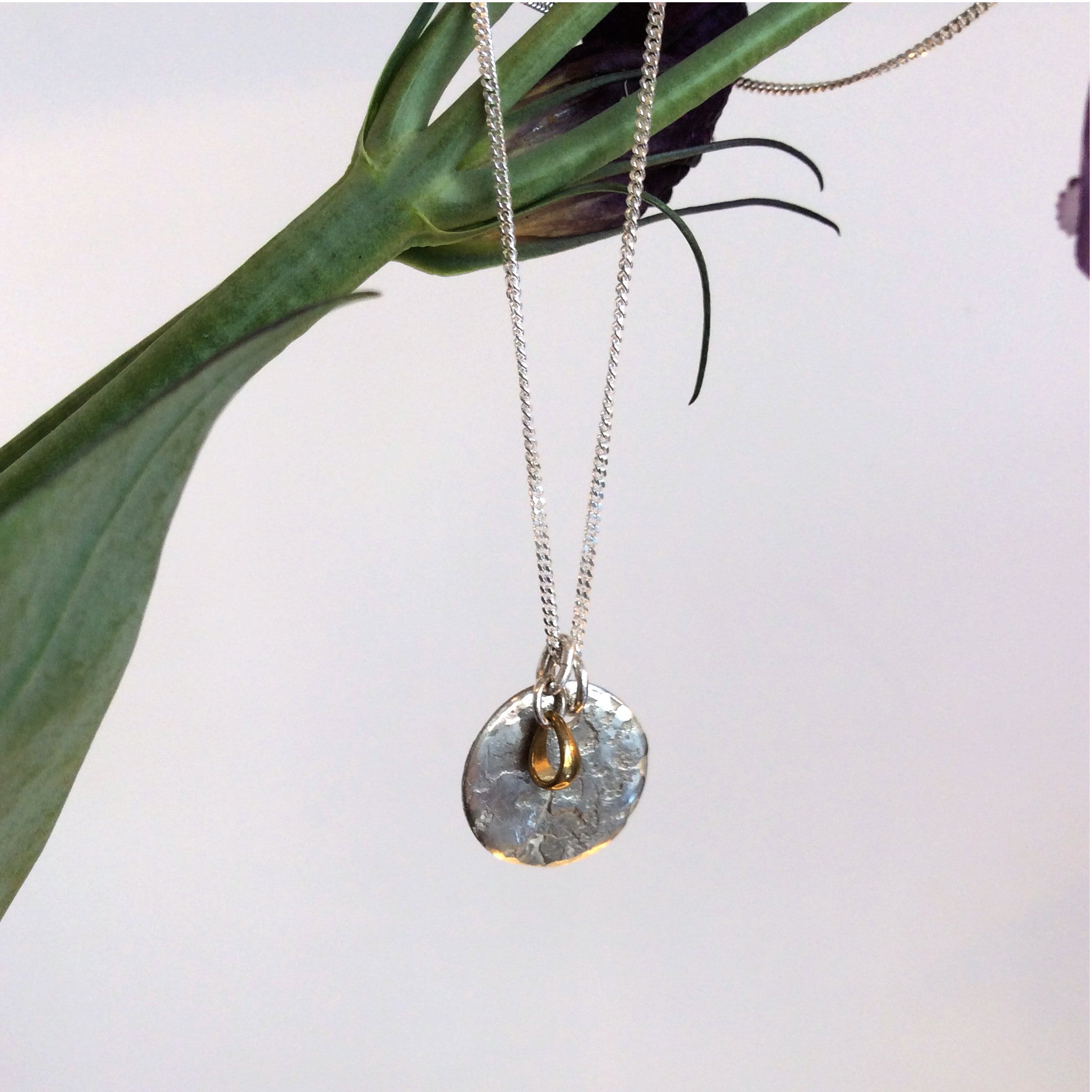 This is a A simple yet unique piece designed for the individual in mind who likes to pay attention to details. A handcrafted necklace made with a thin silver chain. It features a round charm inspired by the texture of the moon and a small brass droplet.