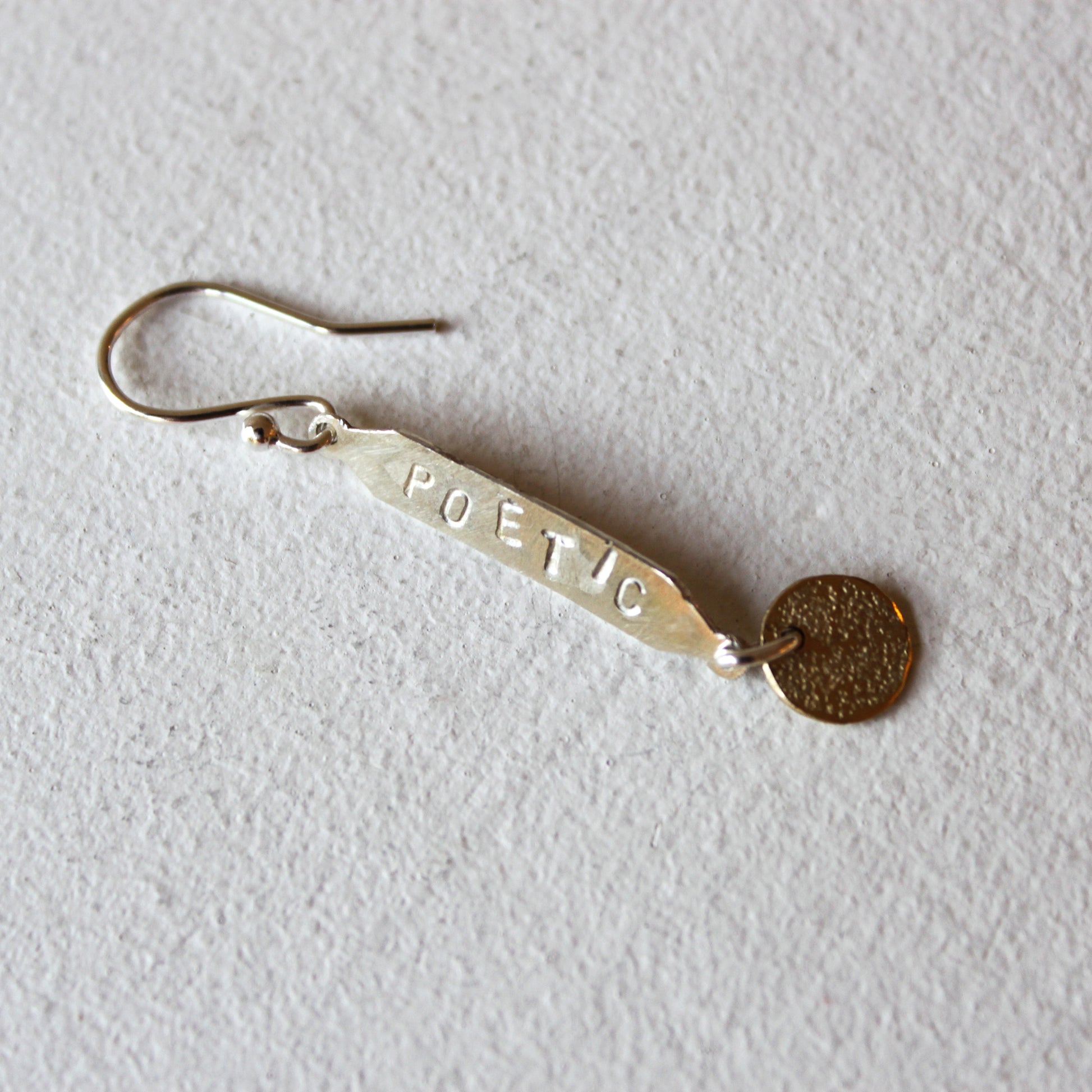 This earring features an engraving of the word ''Poetic'' on a sterling silver bar and a dainty gold charm attached . Unbalanced design with gentleman charm on the other side is adding fun in wearing them. Why not pair this with our 'Poetic' necklace for a complete matchy look.