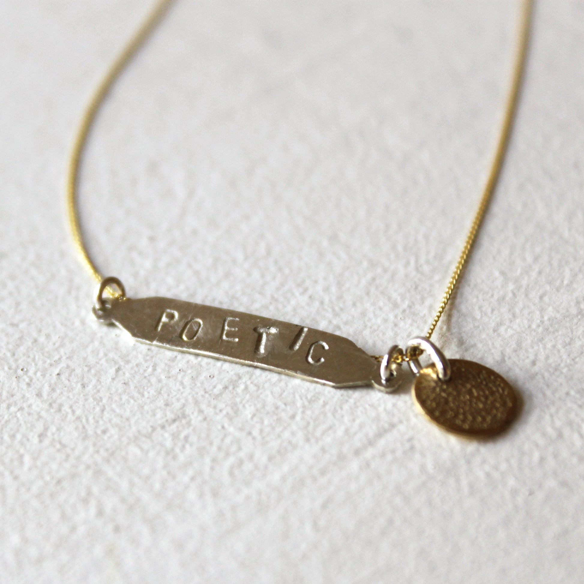 This necklace features an engraving of the word 'Poetic''on a sterling silver bar and a dainty gold charm. You can wear this over a turtleneck or a strappy dress.