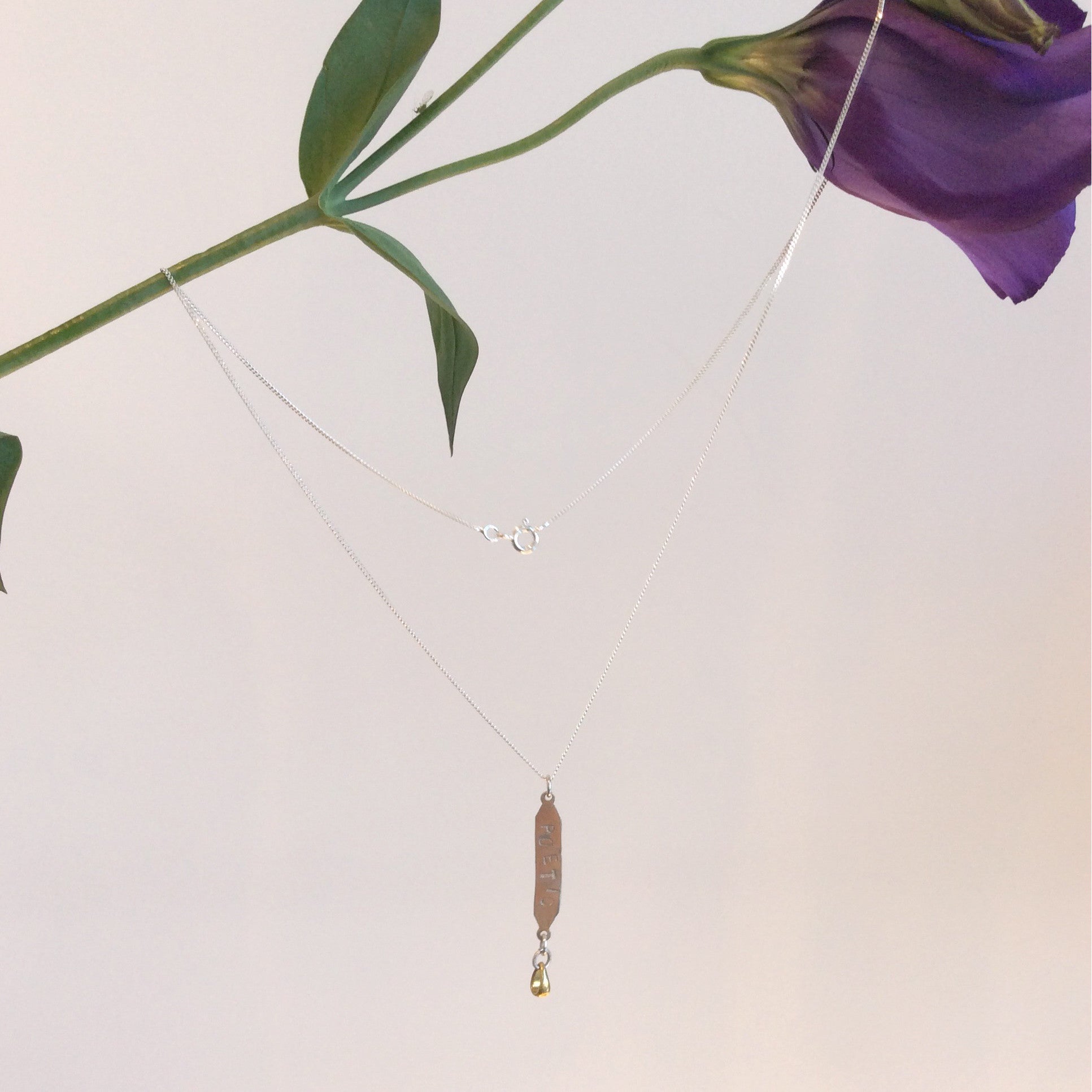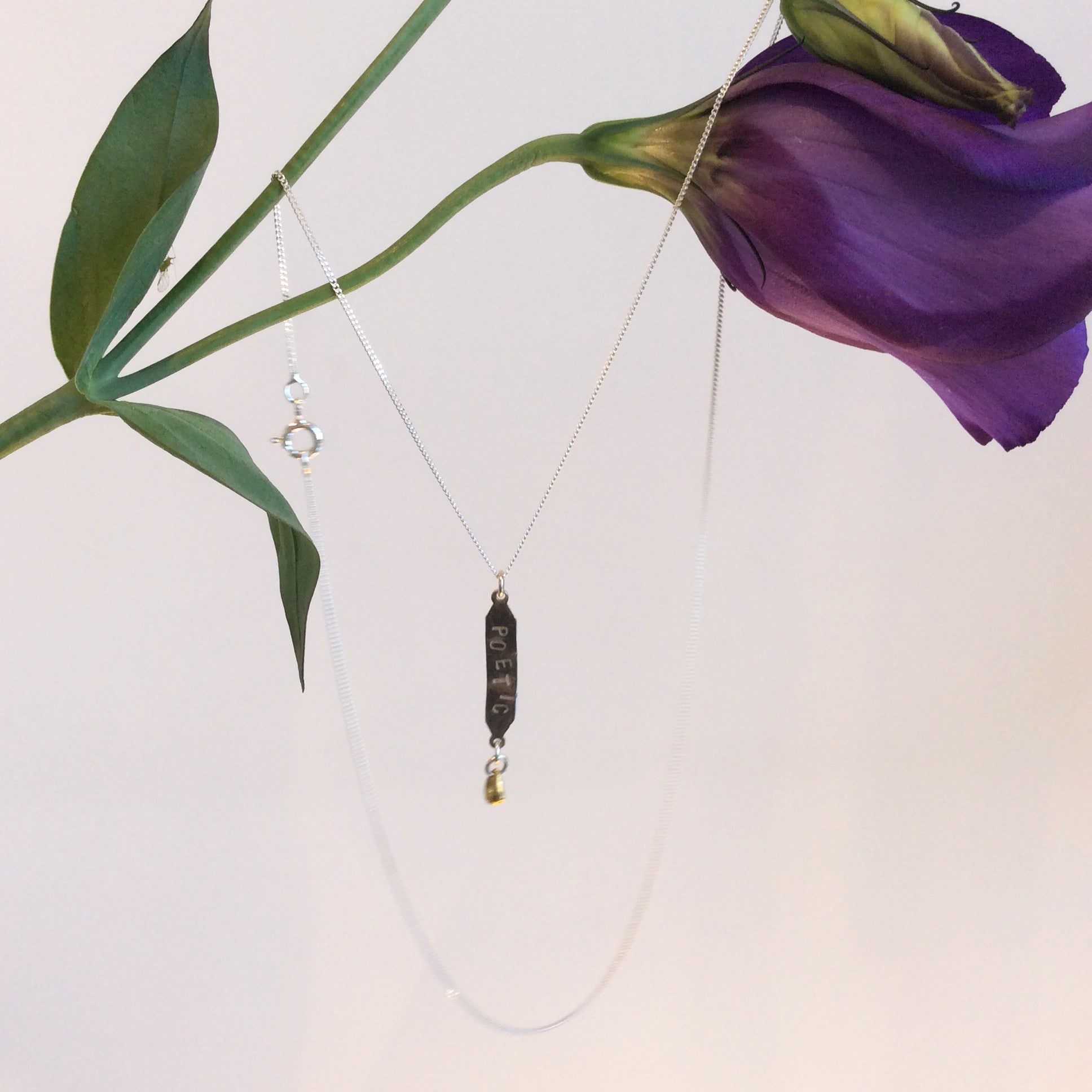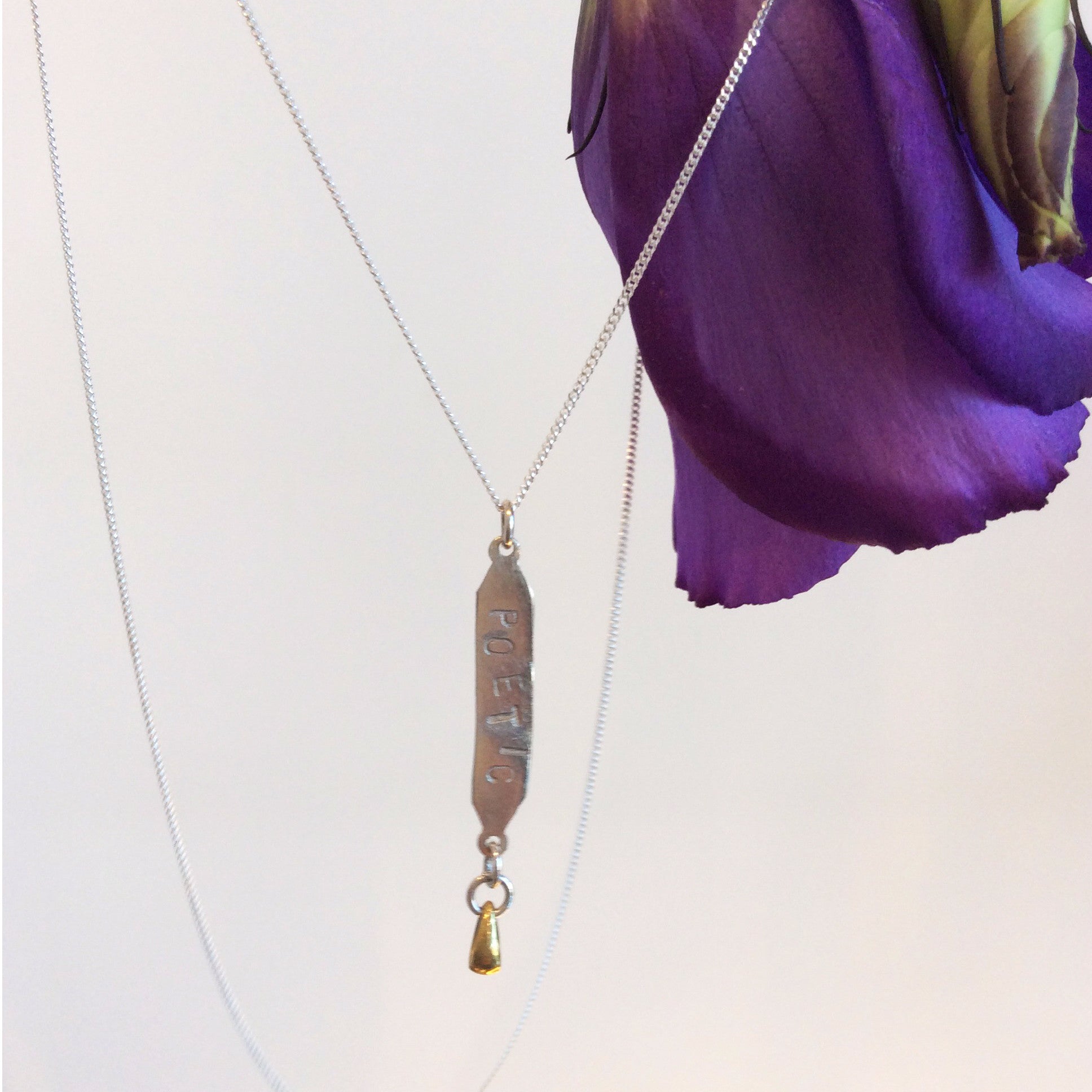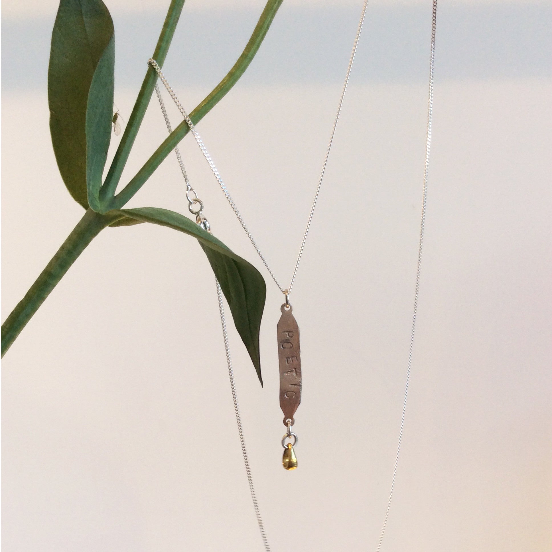 This is a thin silver chain with the word 'Poetic' engraved on a silver tab. It has a brass detail droplet bead. A unique piece of jewellery which pairs well with a selection of our silver necklaces available on our online shop to purchase.