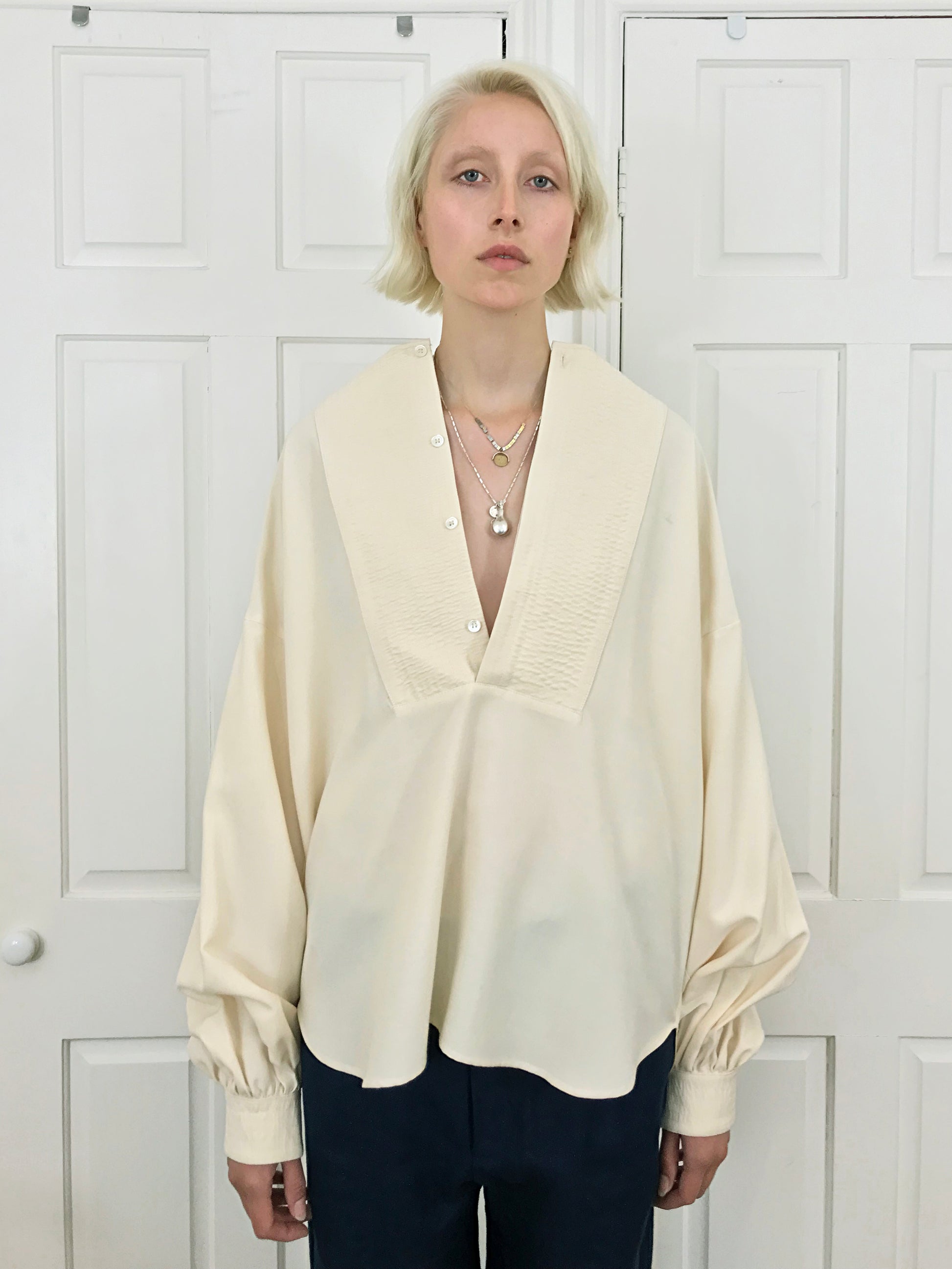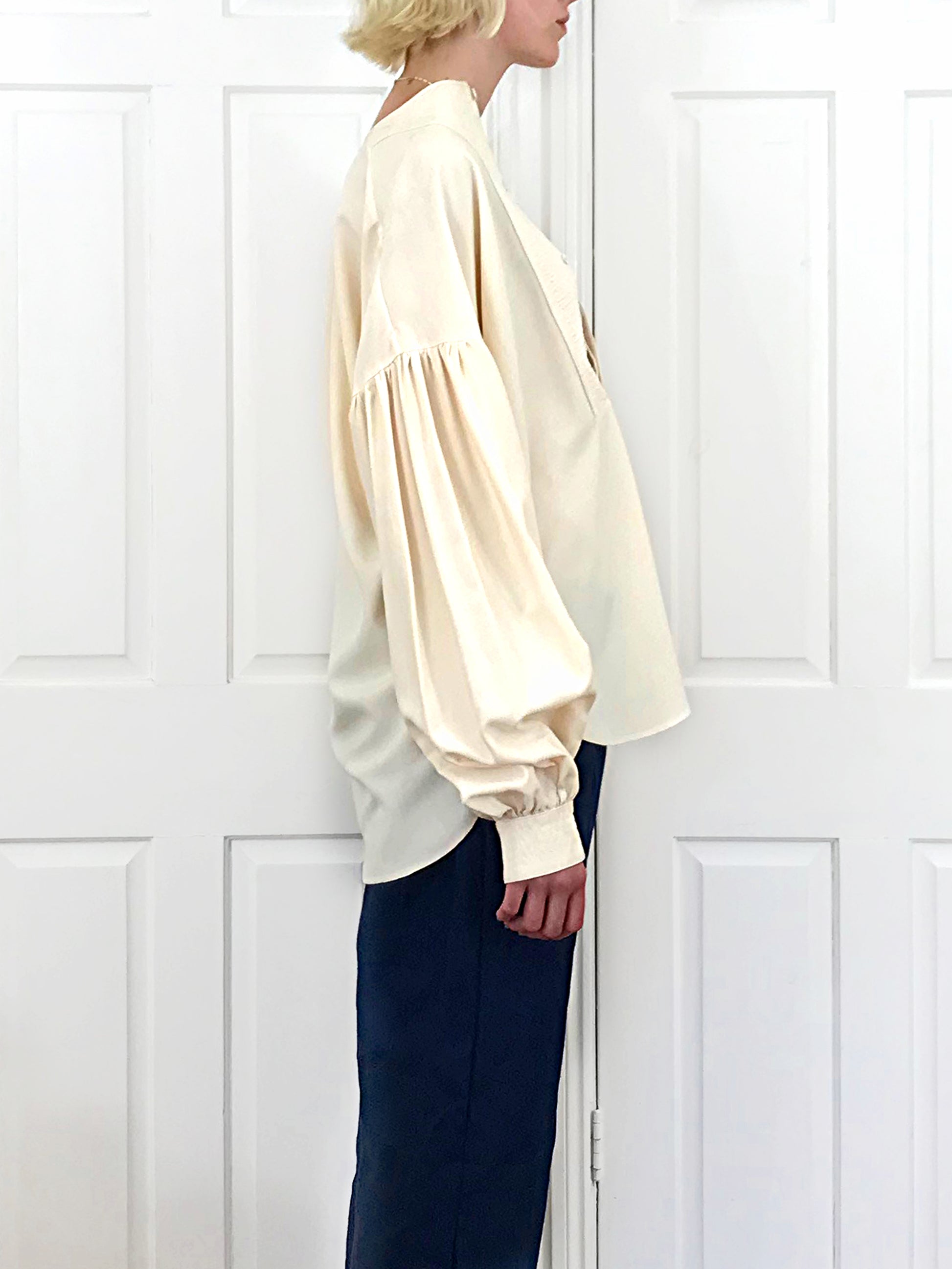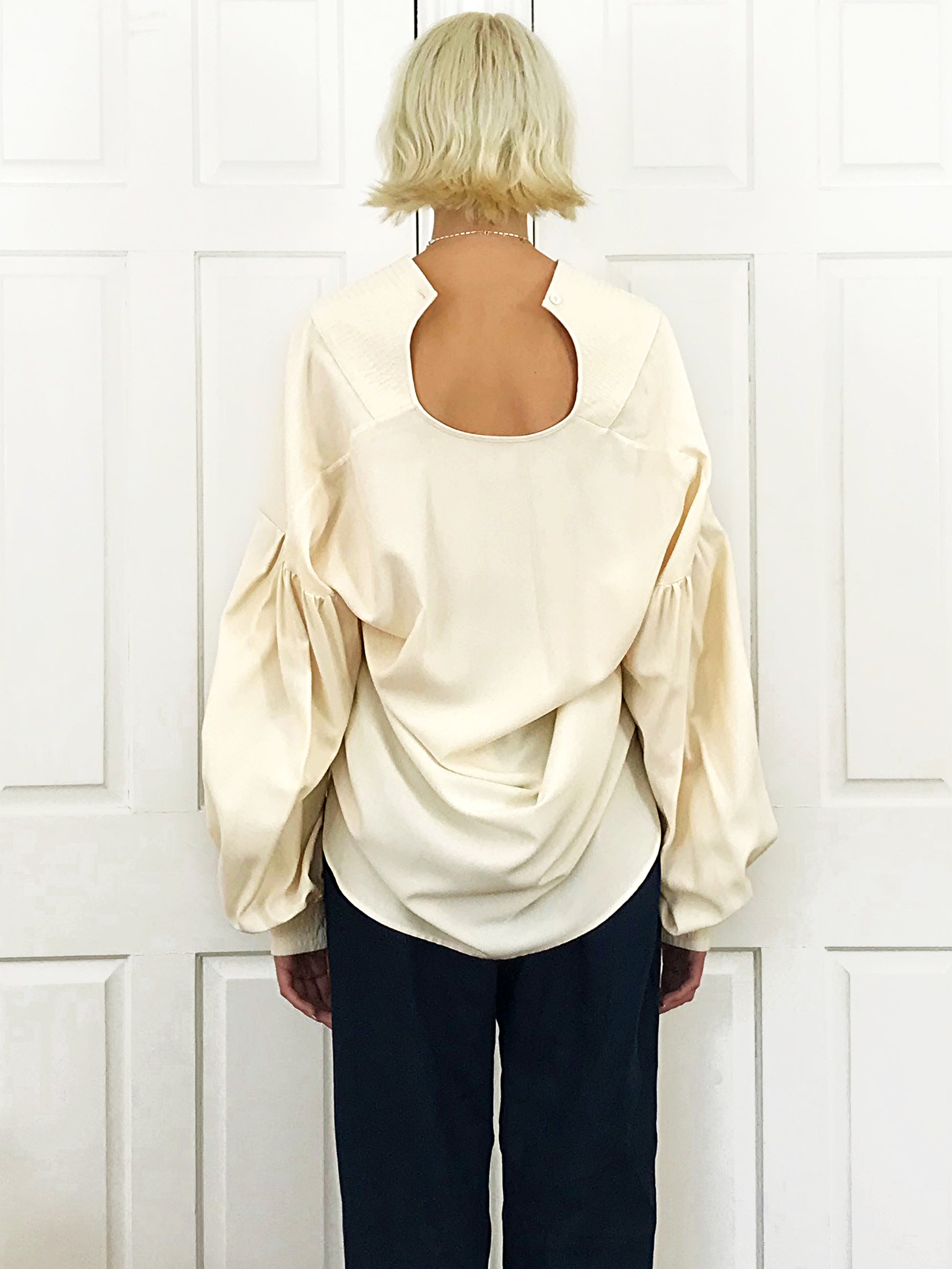 This is one of our flowing shirts that creates a lovely draping silhouette. It features a deep V neck line and a low back. This is our first Prince Shirt in the collection that is made from a soft viscose fabric. Perfect for layering and can be easily dressed up or down.