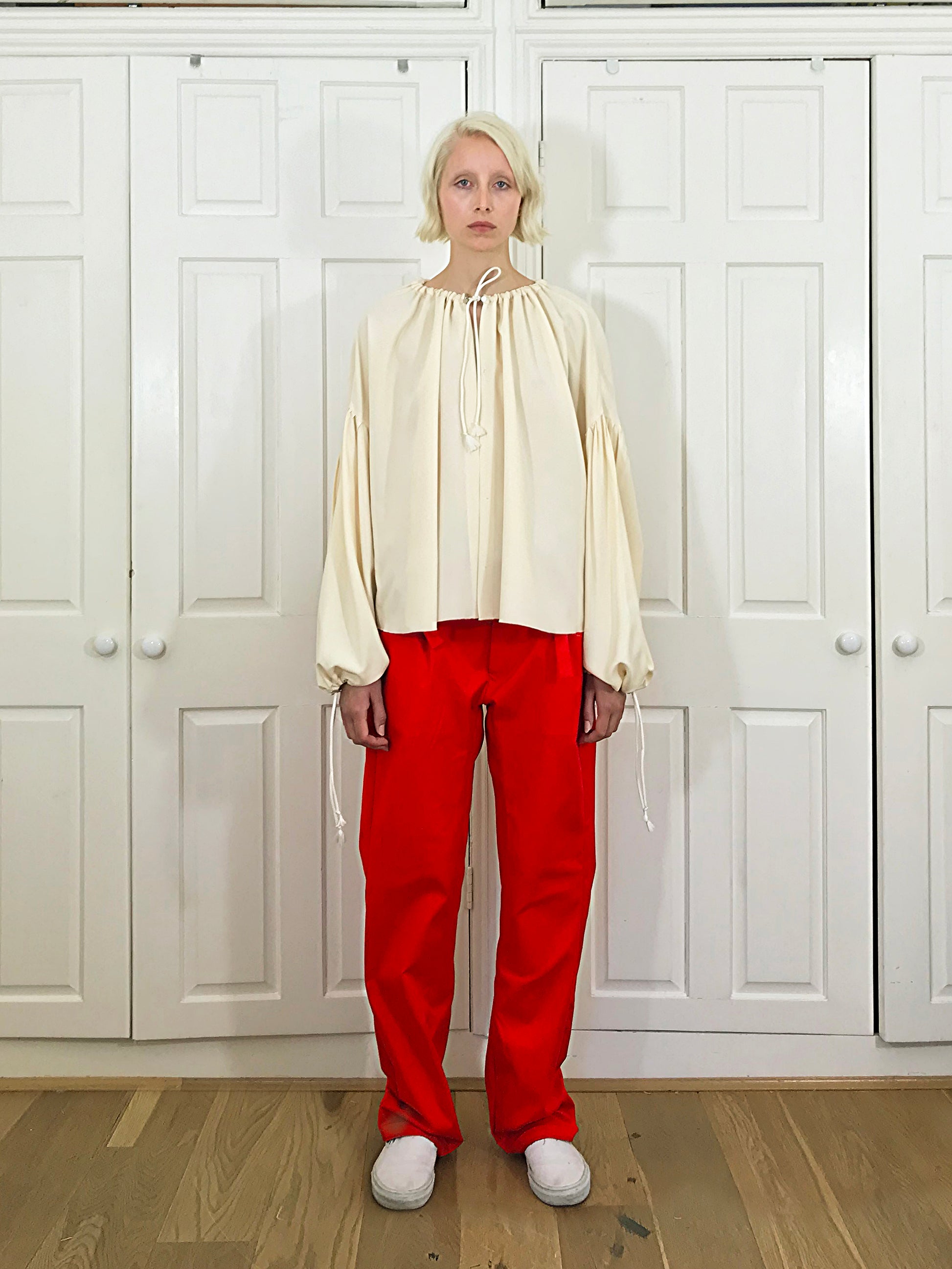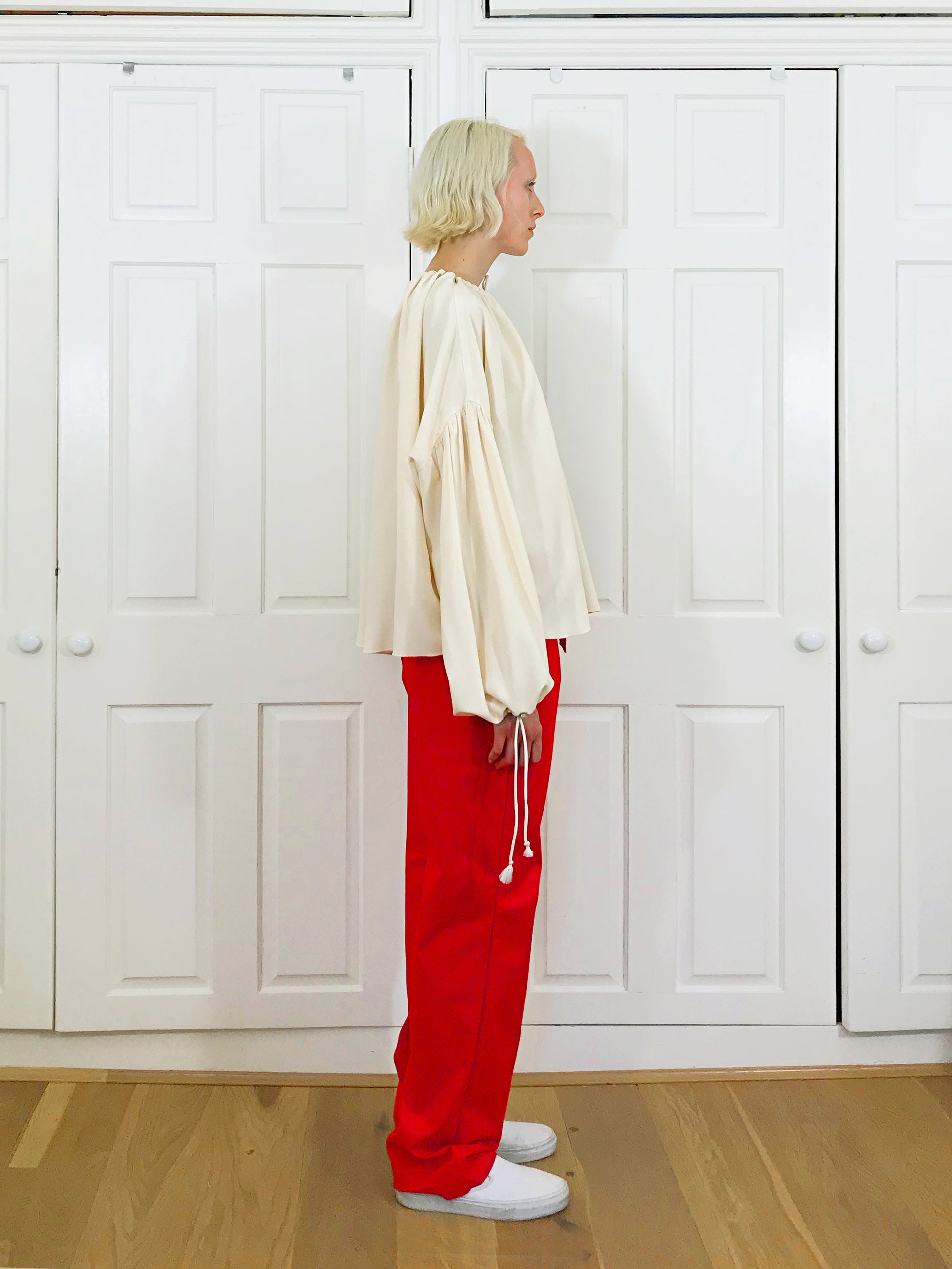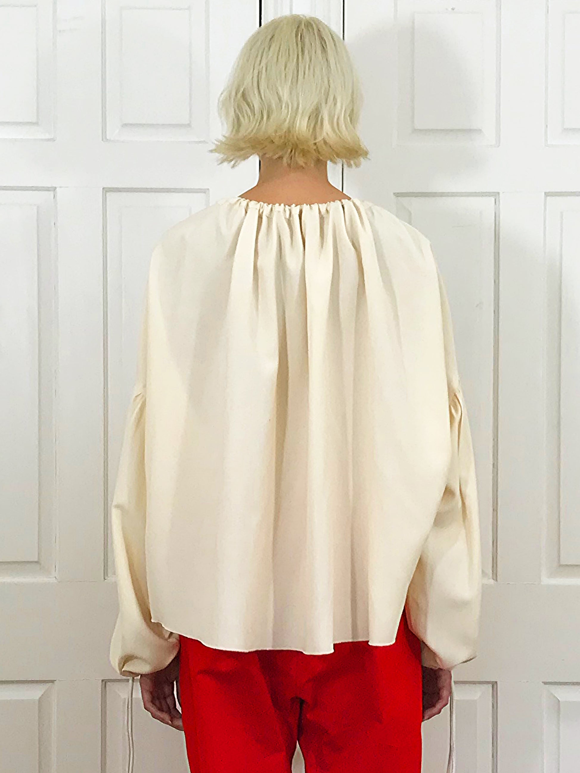 This is our second Prince Shirt which features a softer look. It has gathers in the front and back which are adjustable on how much volume you prefer. It also has adjustable tie details on the sleeves. This is made in a relaxed fit so you can easily layer it up or down.