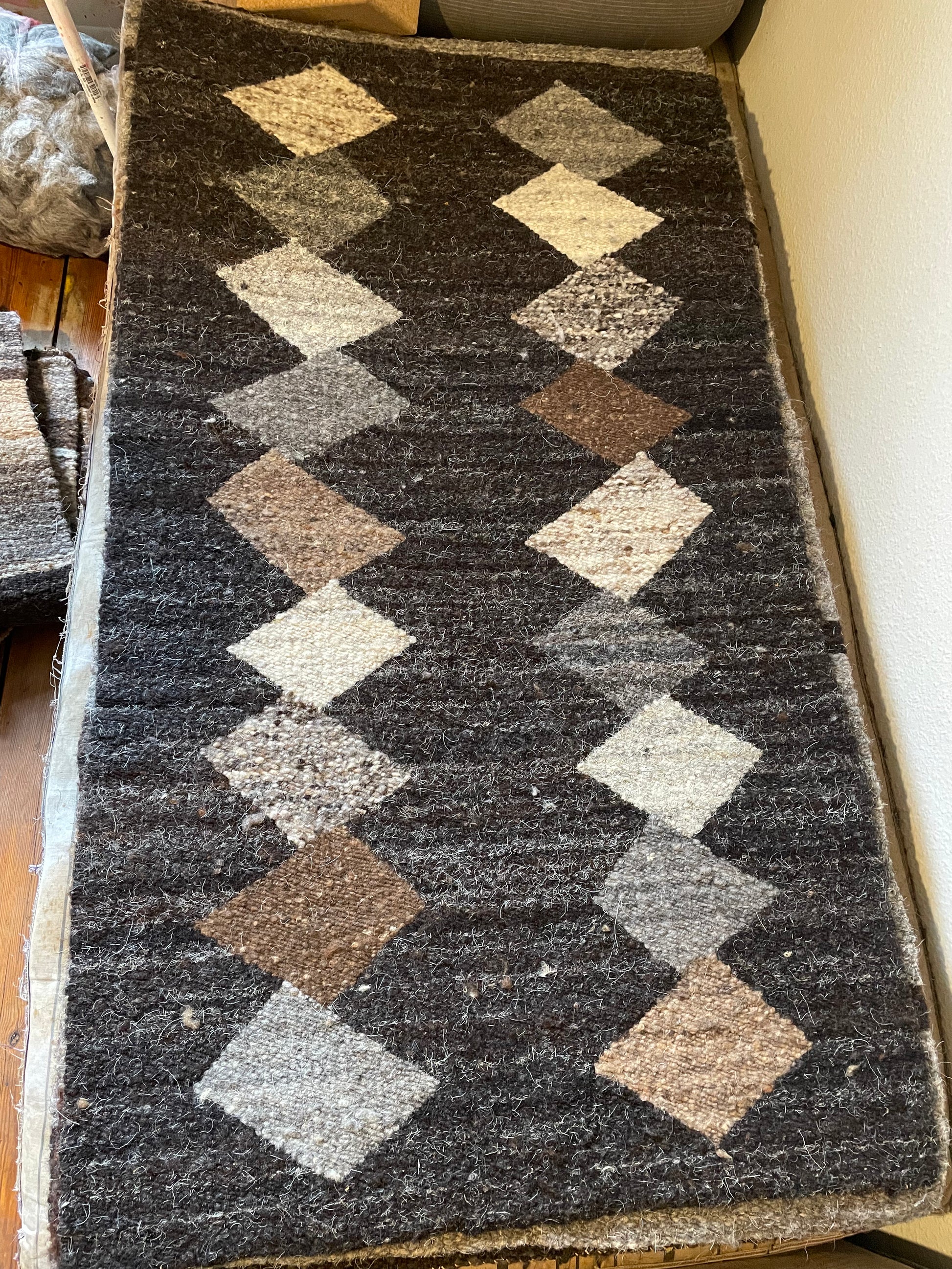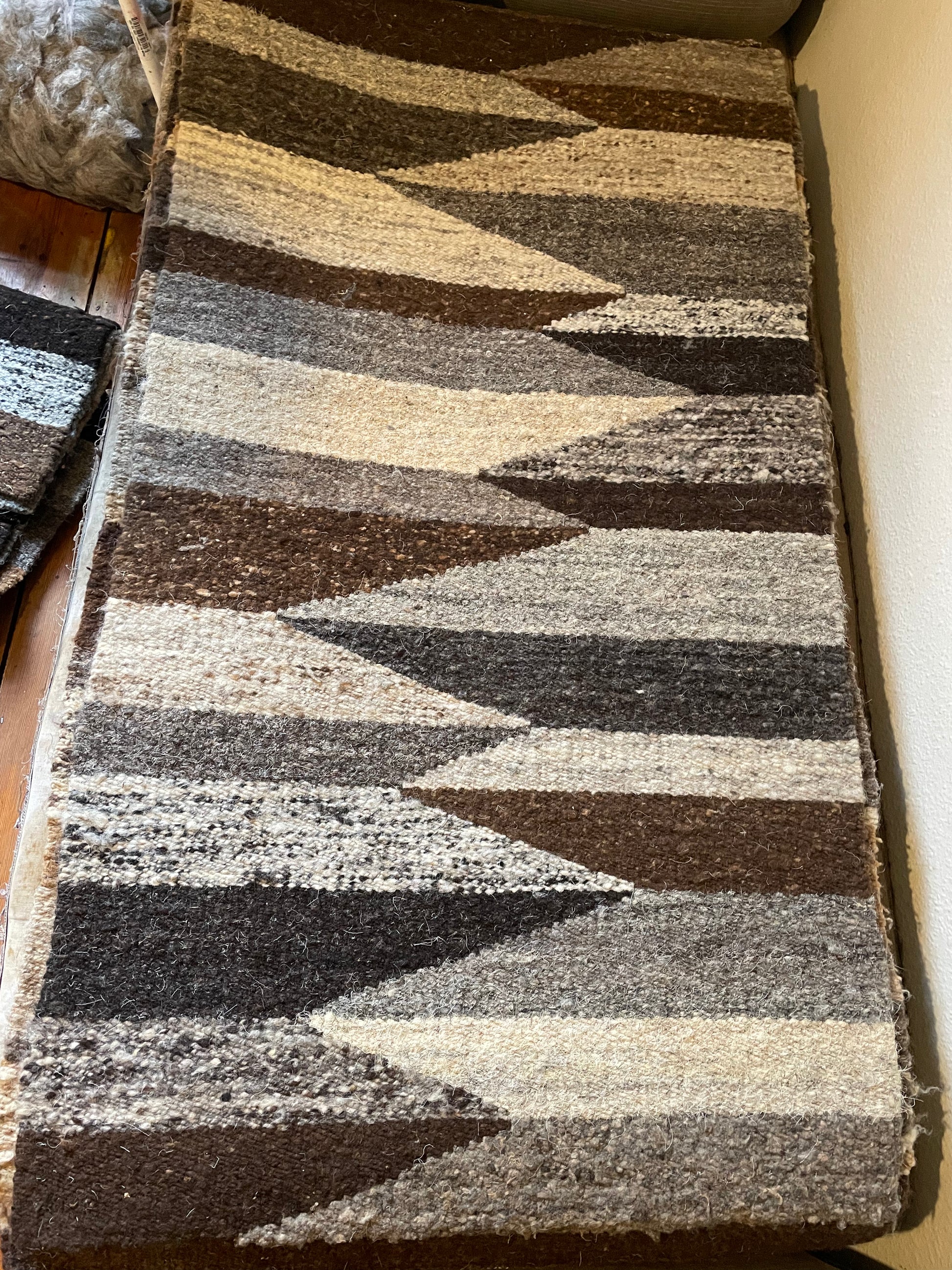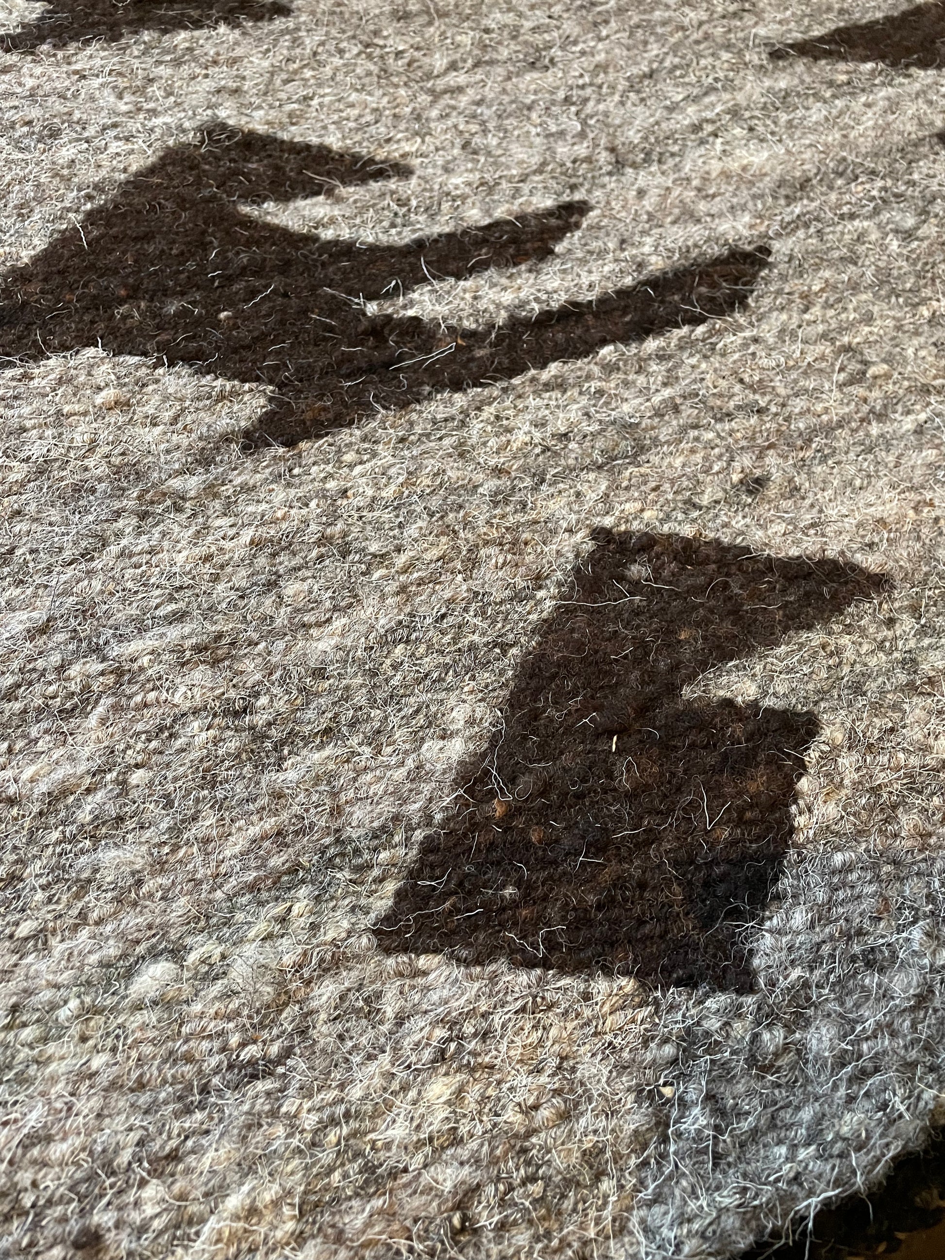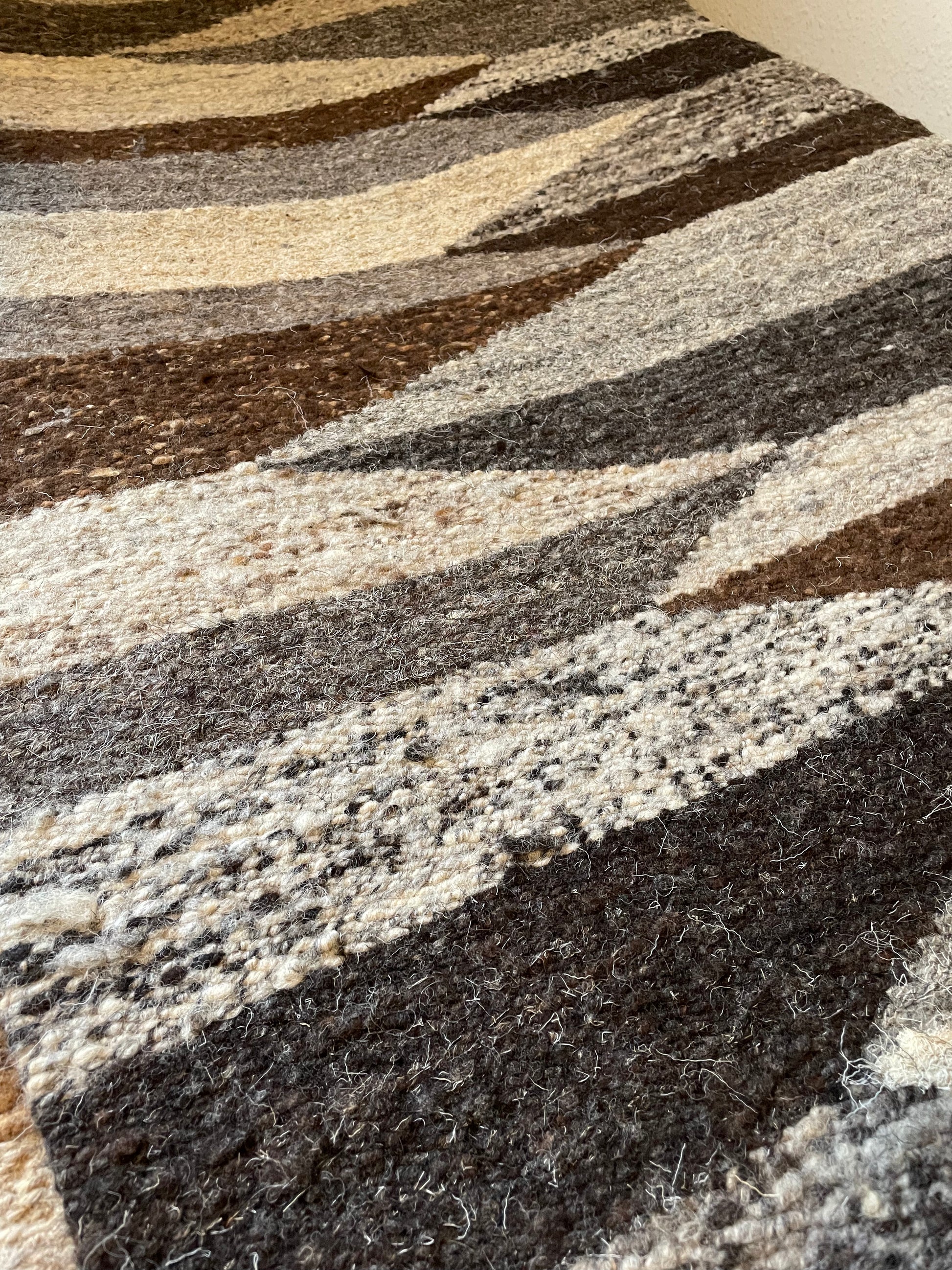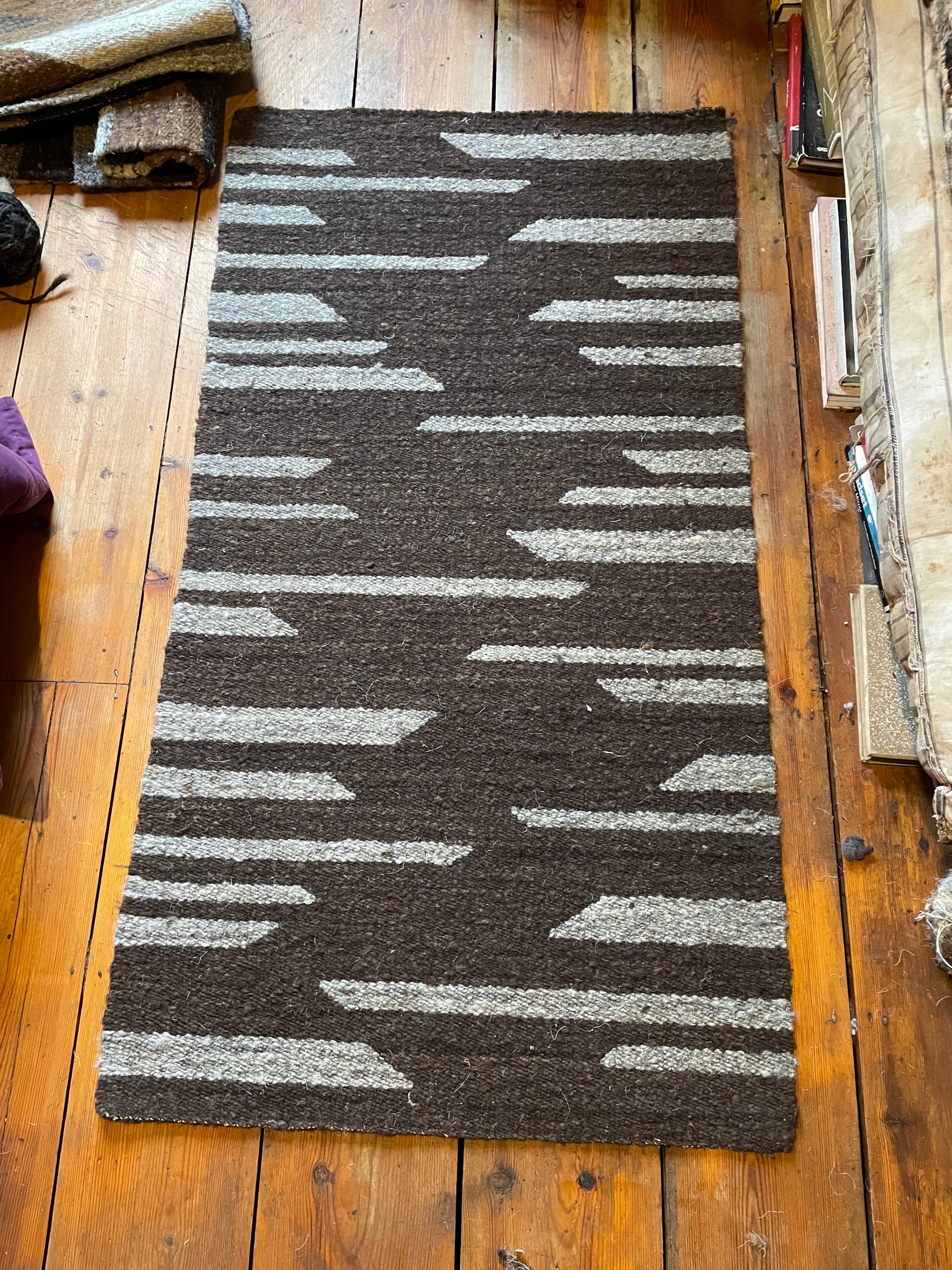 Utilising a rich and diverse palette of British breeds of wool, Rachel Scott’s rugs are all made from natural yarn that she spins from bundles of fleece on a wheel . Rachel uses undyed natural wool left to its own original colour creating entirely unique rugs; the fleeces are sourced from farms in the Berkshire and the Chilterns. She enjoys the restrictions on colour and pattern and keeping her work purposefully self-sufficient.
