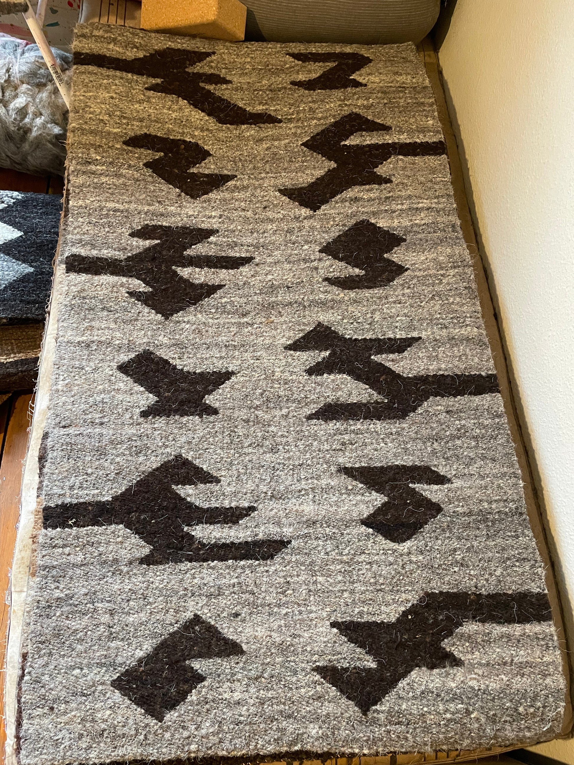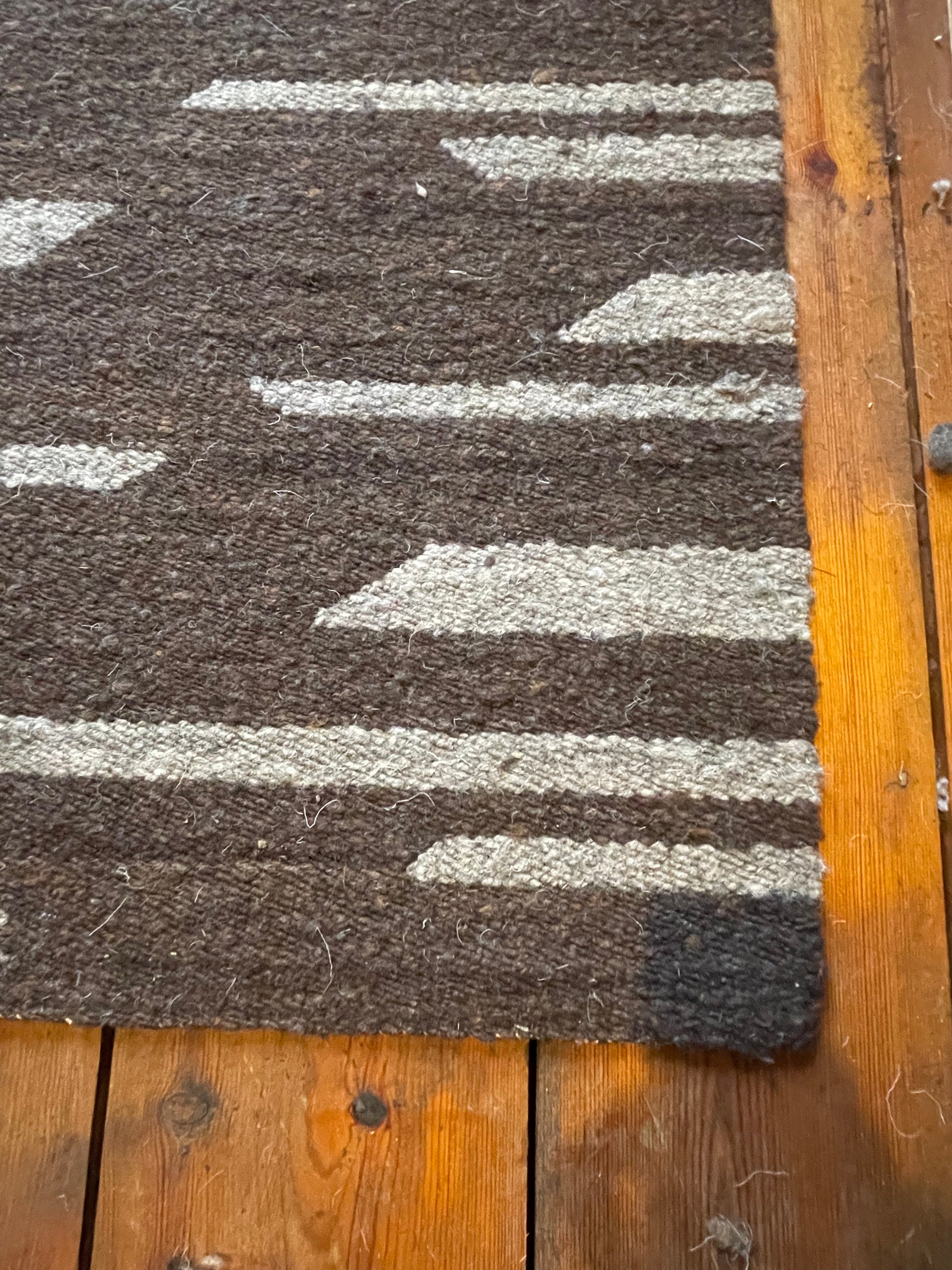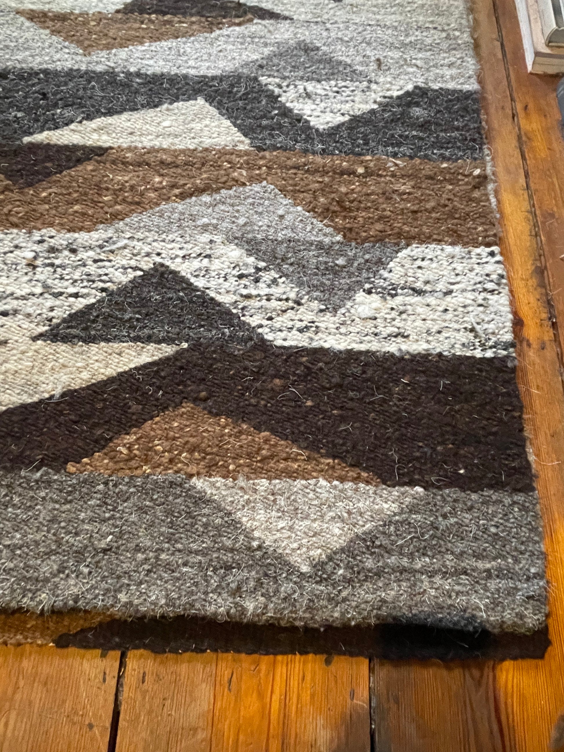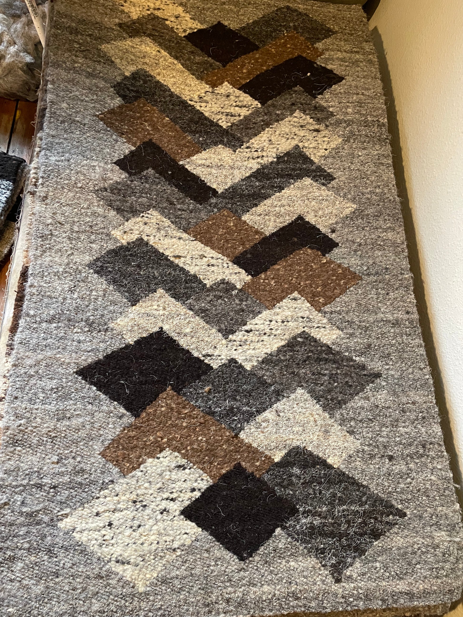 Utilising a rich and diverse palette of British breeds of wool, Rachel Scott’s rugs are all made from natural yarn that she spins from bundles of fleece on a wheel . Rachel uses undyed natural wool left to its own original colour creating entirely unique rugs; the fleeces are sourced from farms in the Berkshire and the Chilterns. She enjoys the restrictions on colour and pattern and keeping her work purposefully self-sufficient.