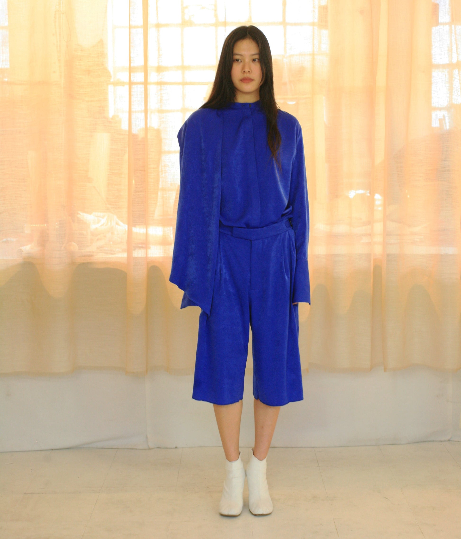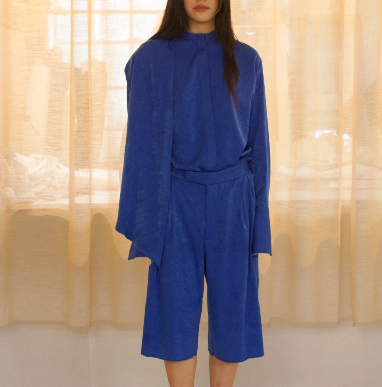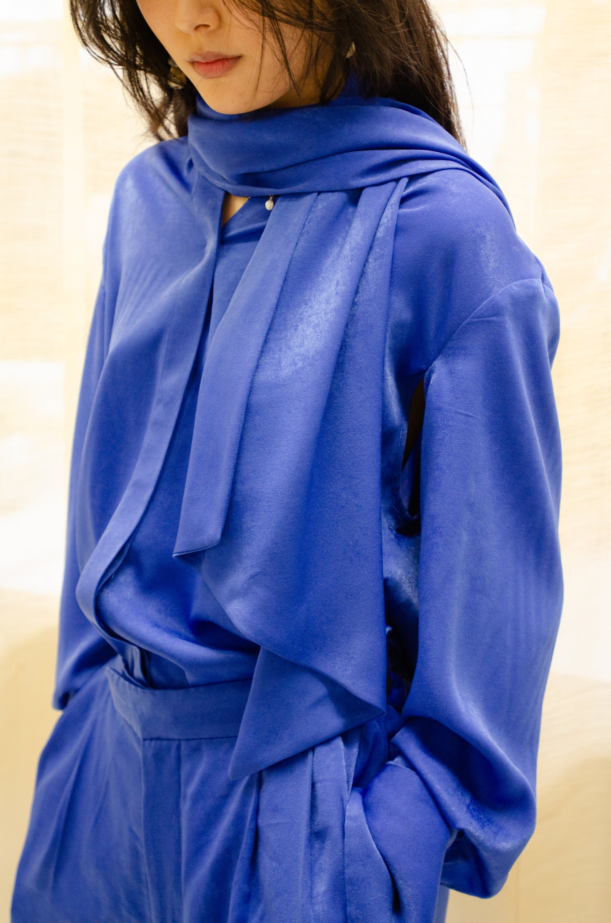 This SHIRT WORKSUIT w/mini scarf offers the best of both worlds with a tailored collarless shirt top and stylish suit trousers in one elegant piece. Elevate your wardrobe with this luxurious jumpsuit, perfect for the modern woman on the go.