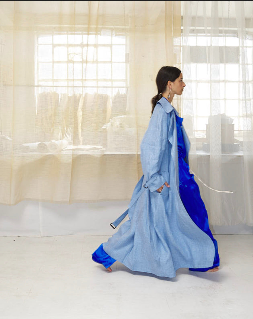 French Trench Coat –Elegance meets functionality. A timeless symbol of sophistication. Crafted from Denim blue Irish linen, it boasts a 90's-inspired cut with maxi length for elegance and contemporary style.