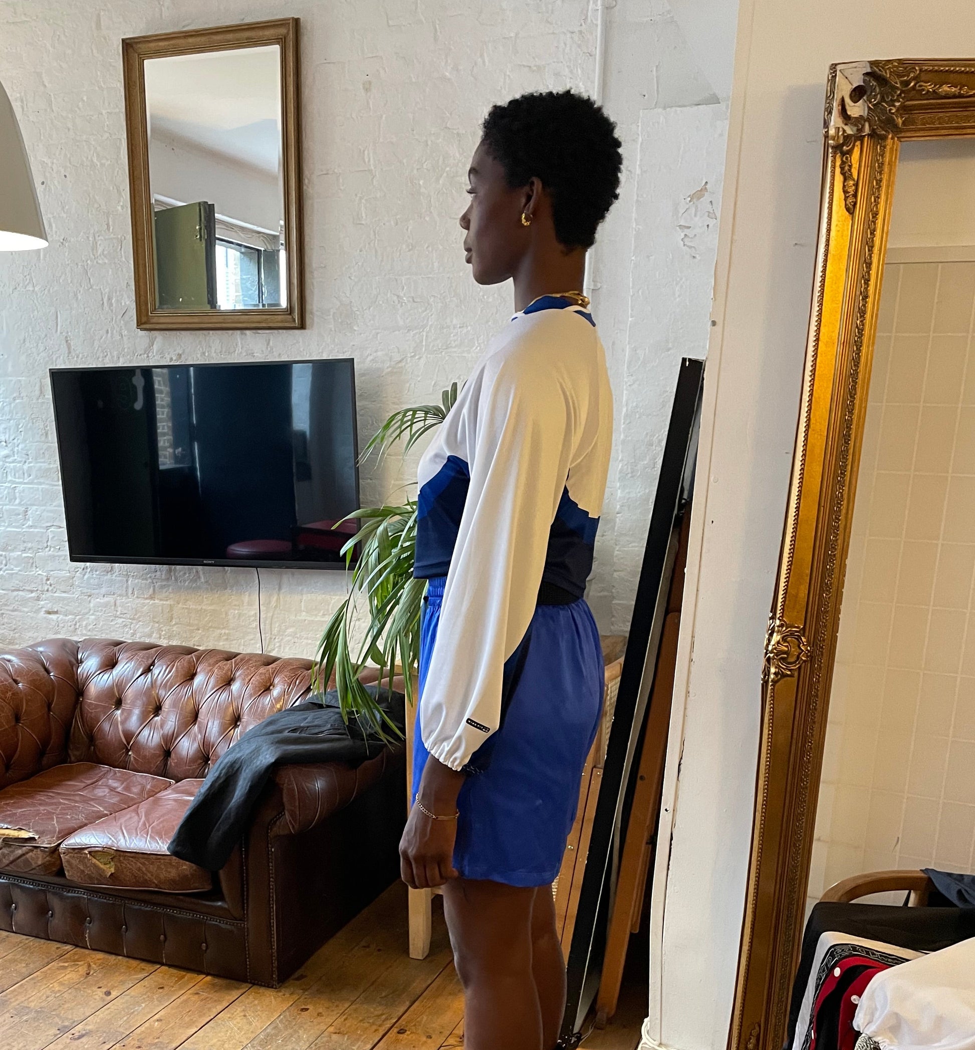 Be a standout in the field with this vintage Nike football jersey – it's got a pop of blue that adds just the perfect touch of color to this upcycled top. The fabric is super soft and the simplicity of this classic style is quite a rare find in football jerseys. Plus, it's available in a female size S-M.