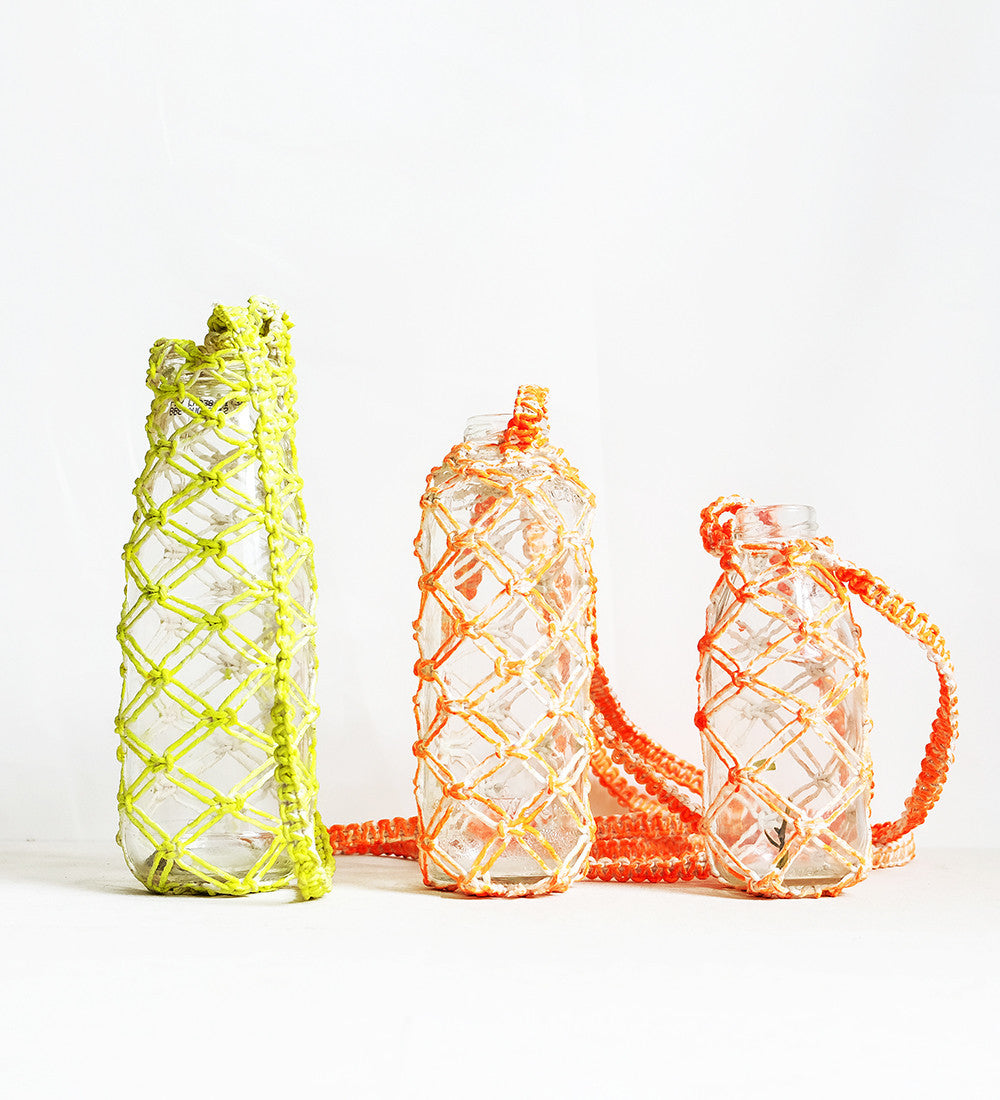 These playful glass bottles are ideal pieces that will brighten up your daily routine. Available in either bright yellow or bright orange string, they feature a long or short string strap for portable use or to be hung in your home.