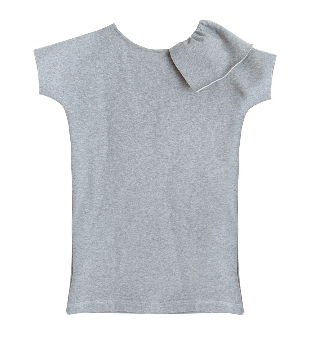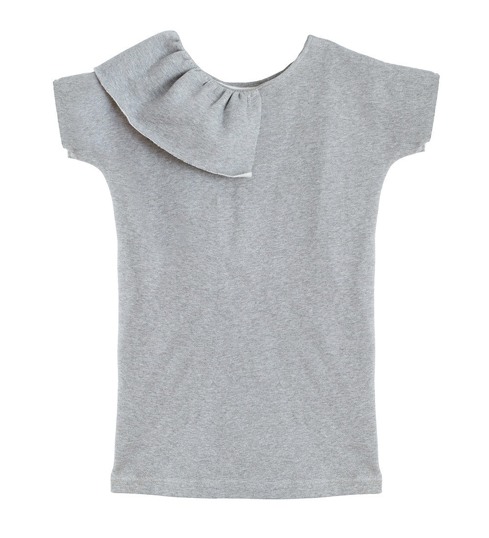 This terry cotton fleece dress features a asymmetric ruffled collar. The soft to touch fabric makes it a comfortable yet fun addition to children’s wear.