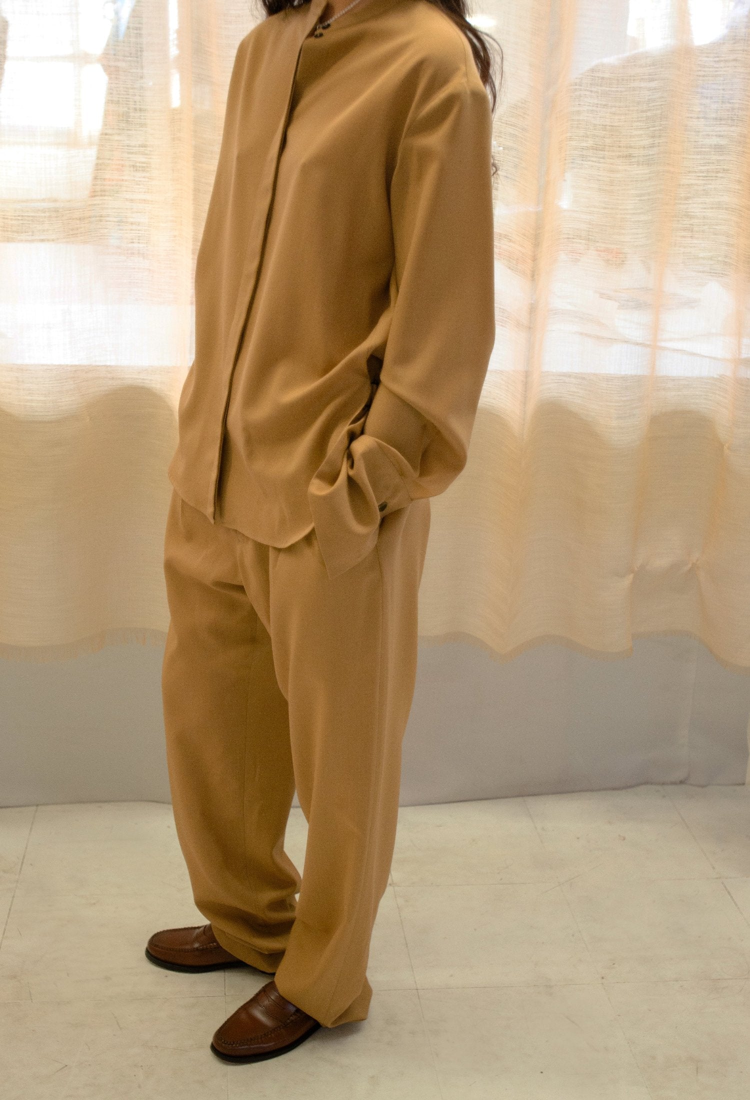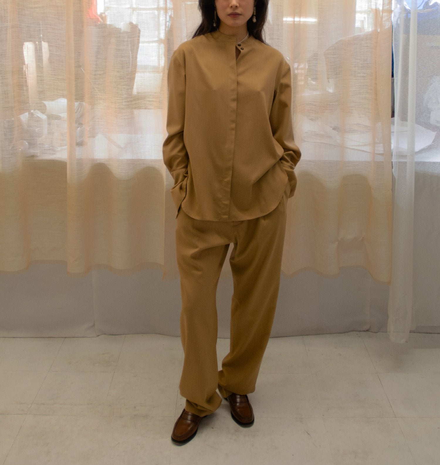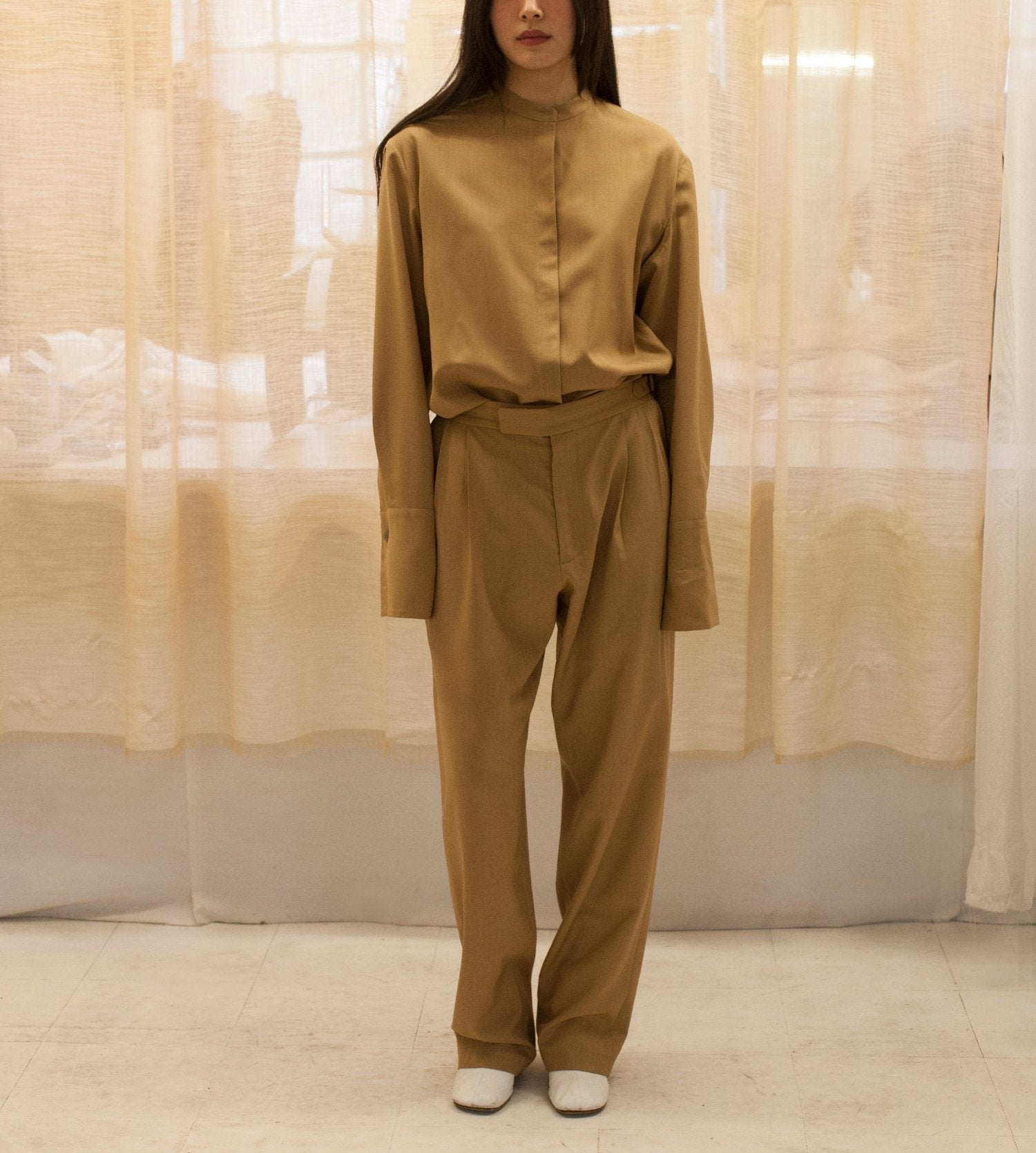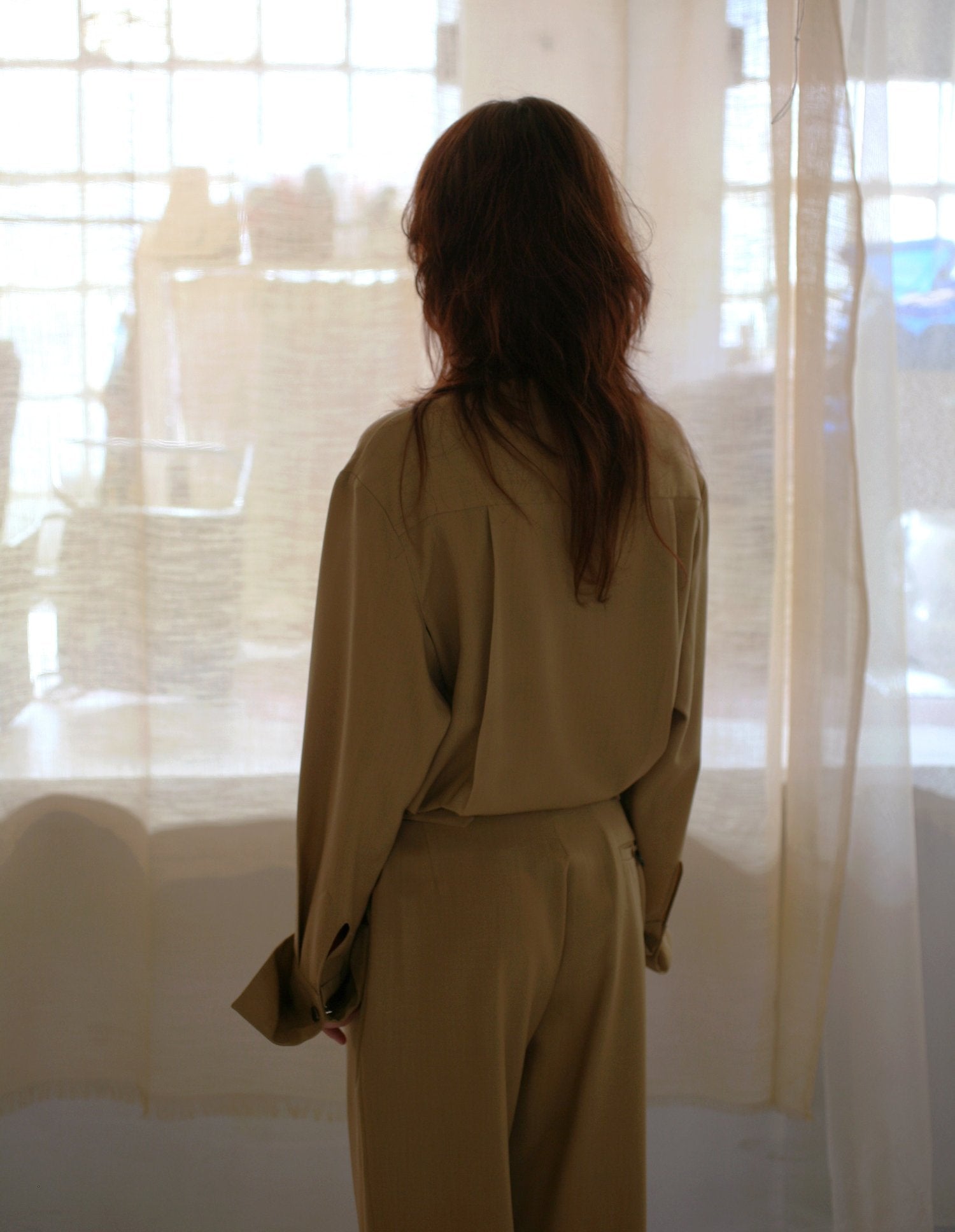 This SHIRT WORKSUIT offers the best of both worlds with a tailored collarless shirt top and stylish suit trousers in one elegant piece. Elevate your wardrobe with this luxurious jumpsuit, perfect for the modern woman on the go.