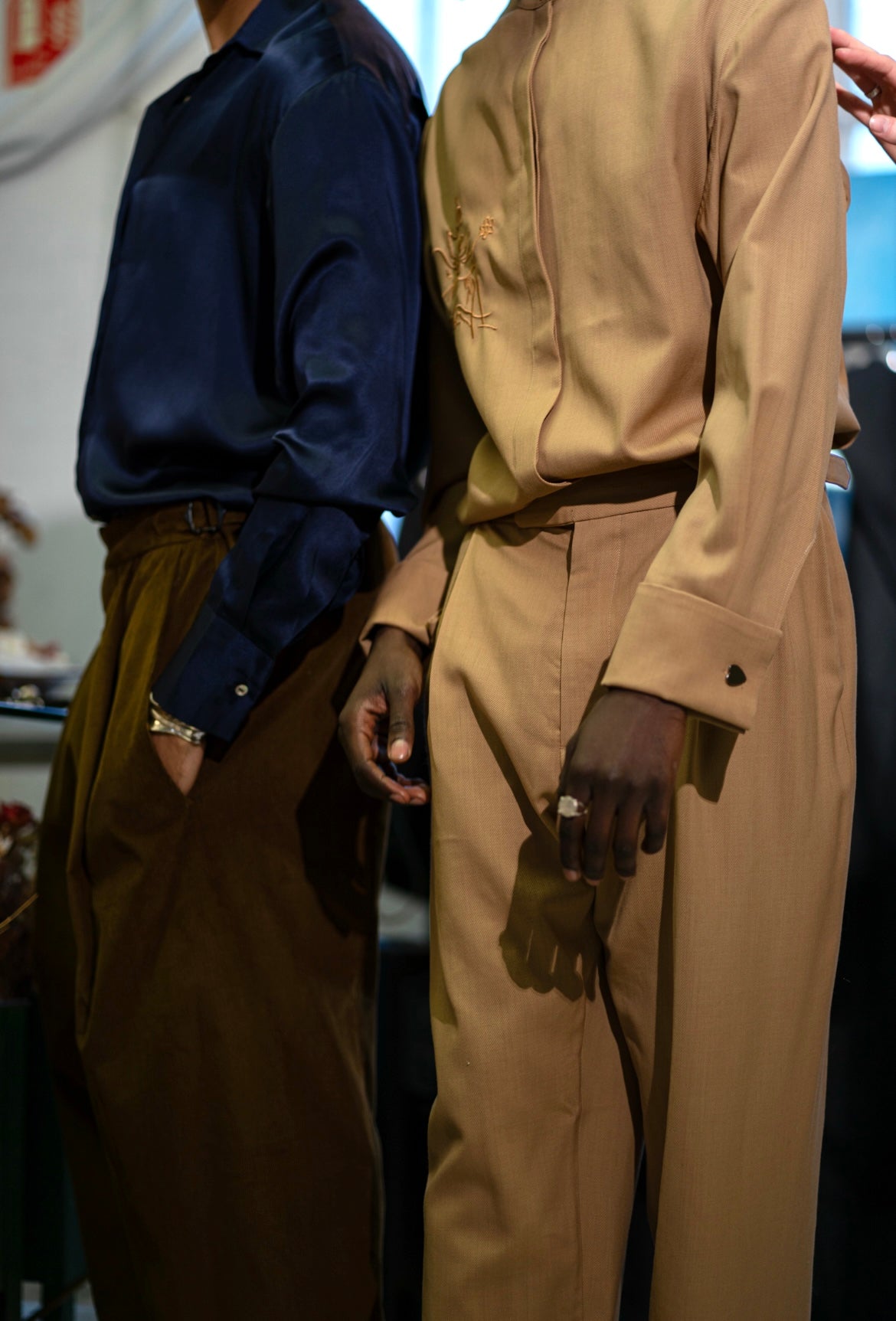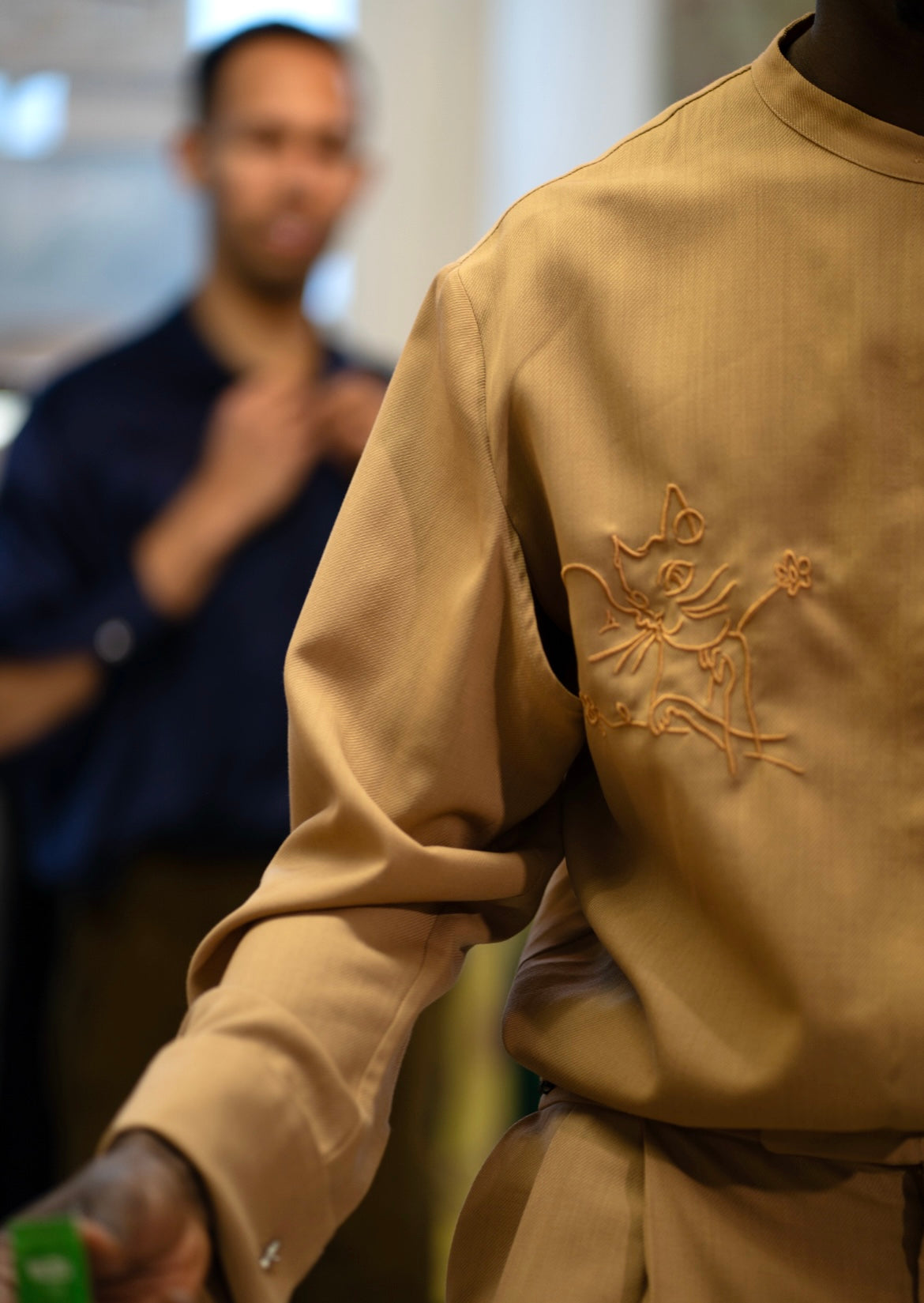 This Italian wool SHIRT WORKSUIT combines technical tailoring with considered design. The collarless shirt construction pairs with precision-cut suit trousers, creating a streamlined silhouette that works across professional and social settings. Cat Kiss embroidery detailing on the right chest provides subtle visual interest without compromising the piece's versatility. Engineered for the discerning wearer who values quality construction and timeless appeal.